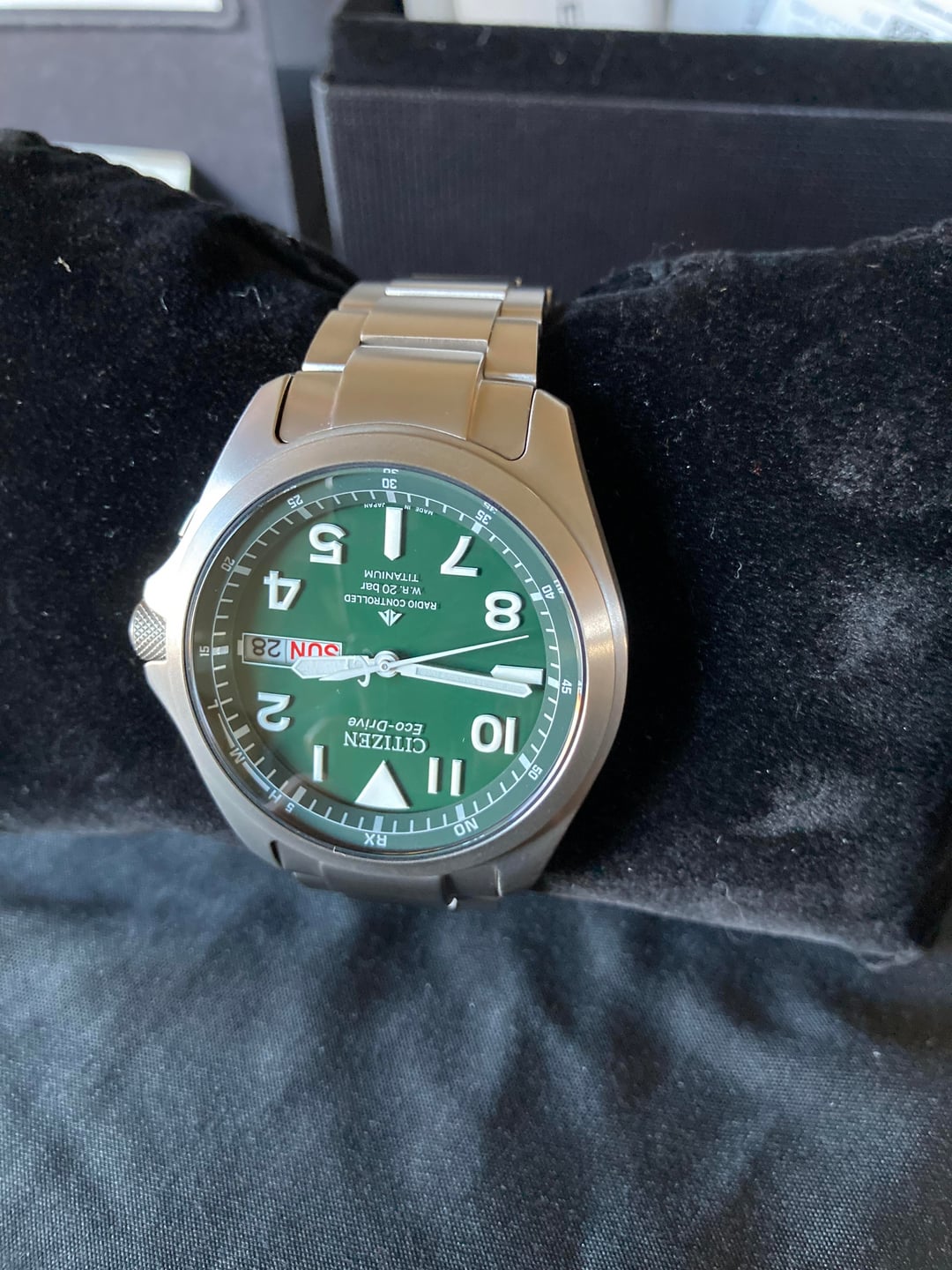 WTS - Citizen Promaster PDM56-2951 Price: $340 shipped (CONUS ONLY) Payment method: PayPal or ApplePay This is the Citizen Promaster PDM56-2951 Land Eco-Drive with the green dial. Bought from Japan. It’s a tough, light, and handsome watch, but I just wasn’t able to bond with it. The watch has many great features including: * Precision ±15 seconds/month * Weight 100g * Thickness 12.0mm * bracelet width 20mm * Case Titanium * Green Dial * Finishing White IP plating * Curved sapphire glass (nonreflective coating) * Fixed time reception function * Radio Reception function (Japan Only) * Charge warning function * Overcharge prevention function * 200m water resistance * Anti-magnetic I’ve managed to keep markings to a minimum. The curved sapphire crystal is clean and clear. It’s sized to my wrist but all pins and links are included. All paperwork is also included. I’m also selling the following watches: -Swatch Sistem 51 YIS401G Boreal -Swatch Sistem 51 YIS407G Kaki -G-Shock Mudmaster GG1000-1A