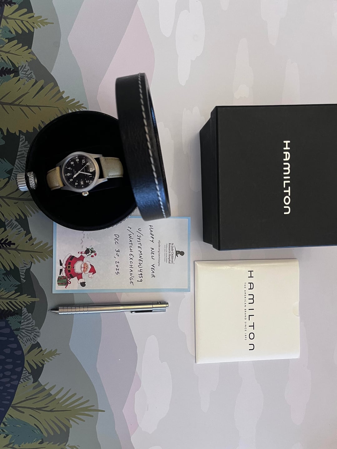 Hello watchex, For sale is this beautiful example of a Hamilton Khaki 38 , I was planning on gifting this to my nephew but it turns out he is only a fan of Apple Watches . So I am here to offer it again for $375 This Hamilton Khaki Field Mechanical watch, offered in 38mm with an 8 out of 10 condition "full kit," features a robust, military-inspired design and an impressive 80-hour power reserve. Key Features Movement: It houses the Hamilton Calibre H-50 manual-wind mechanical movement, which provides an extended 80-hour power reserve. This means the watch can be left unwound for over three days and still be running on Monday morning. Case: The watch has a 38mm diameter matte stainless steel case, which helps reduce glare and resists scratches from everyday use. The case is slim, with a thickness of approximately 9.5mm. Crystal: A scratch-resistant sapphire crystal protects the dial. Dial: The black dial features highly legible white Arabic numerals for the hours and a 24-hour track on an inner ring, staying true to its military heritage. Luminescence: The hour and minute hands, as well as the hour markers, are treated with Super-LumiNova for excellent readability in low-light conditions. Water Resistance: The timepiece is water-resistant up to 5 bar (50 meters), suitable for everyday wear and light water exposure like rain or a shower, though not for diving. Strap: The watch comes on a durable NATO-style textile strap, often in a green color with leather accents, secured by a pin buckle. The 20mm lug width allows for easy strap changes. "Full Kit" however the plastic on the watch holder is cracked as photographed. This watch is an easy 88/100 condition, absolutely beautiful. Free USPS tracked to your door. As an established user, I accept payments via Zelle, PayPal Friends & Family. Other forms of payment are accepted for established forum users only at my discretion. FaceTime verification is also available upon request. I look forward to assisting you.