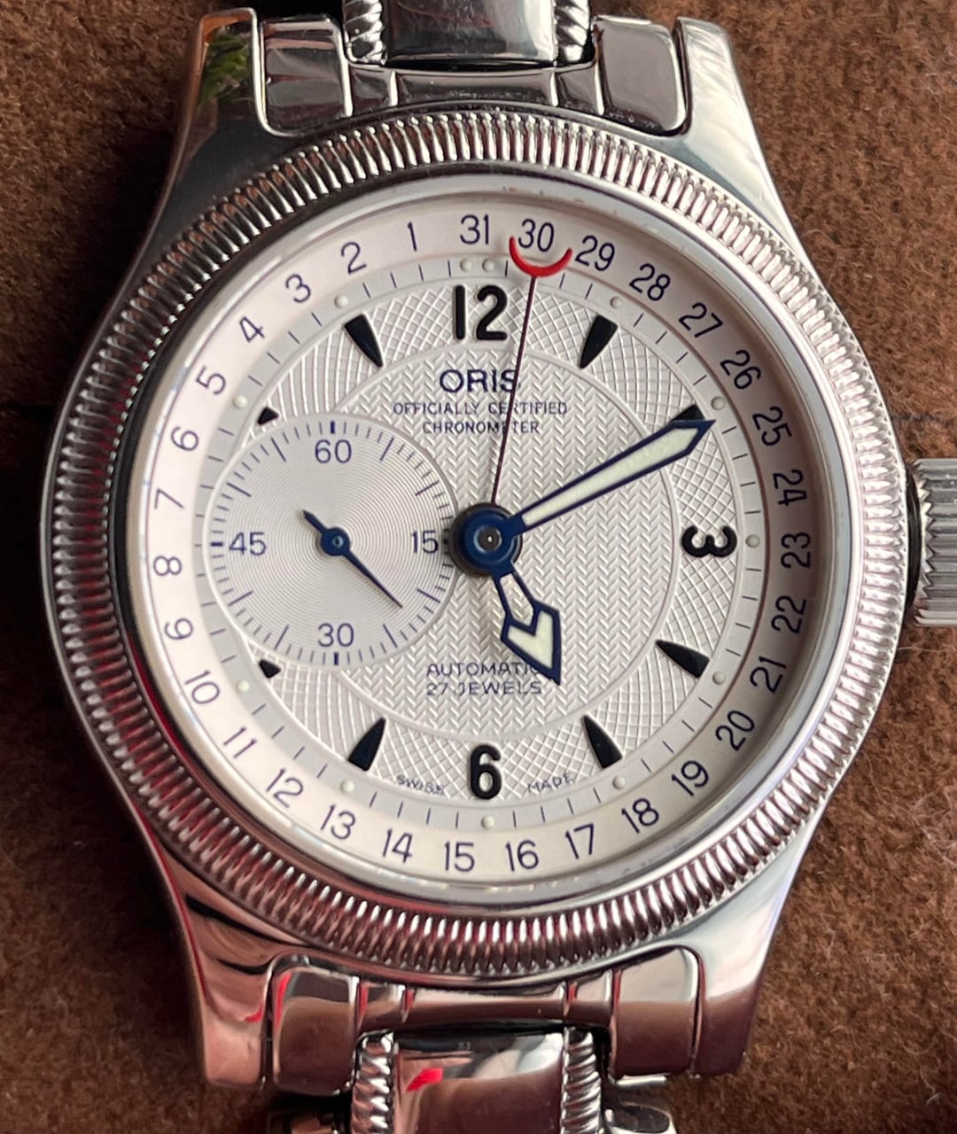 A distinctive piece of 1990s Swiss watchmaking, this vintage Oris Big Crown features the rare Reverse Pointer Date function, where the date numerals run counter-clockwise. The beautiful silver-tone dial has a wave-textured guilloché-style pattern, navy blue hands, and a small seconds subdial at 9 o’clock. * **Case**: 33mm diameter (excluding crown), 41mm lug-to-lug, and \~10mm thick, which I think is perfect dimensions for a vintage watch. * **Glass**: sapphire crystal * **Movement**: COSC certified Oris calibre 641, based on ETA 2836-2 * **Bracelet**: a unique original three-link design bracelet with tiny weld marks running along the outside of the center links The watch is in very good condition for its age. All original, never been polished. Last service in 2020. Comes with original papers and additional links (currently sized to 7" wrist). Asking $850 OBO shipped. Paypal or Venmo.