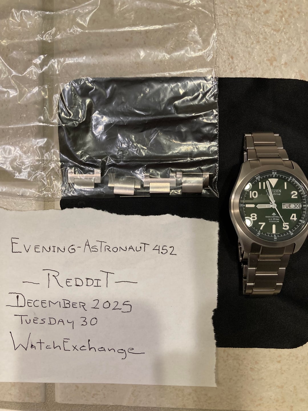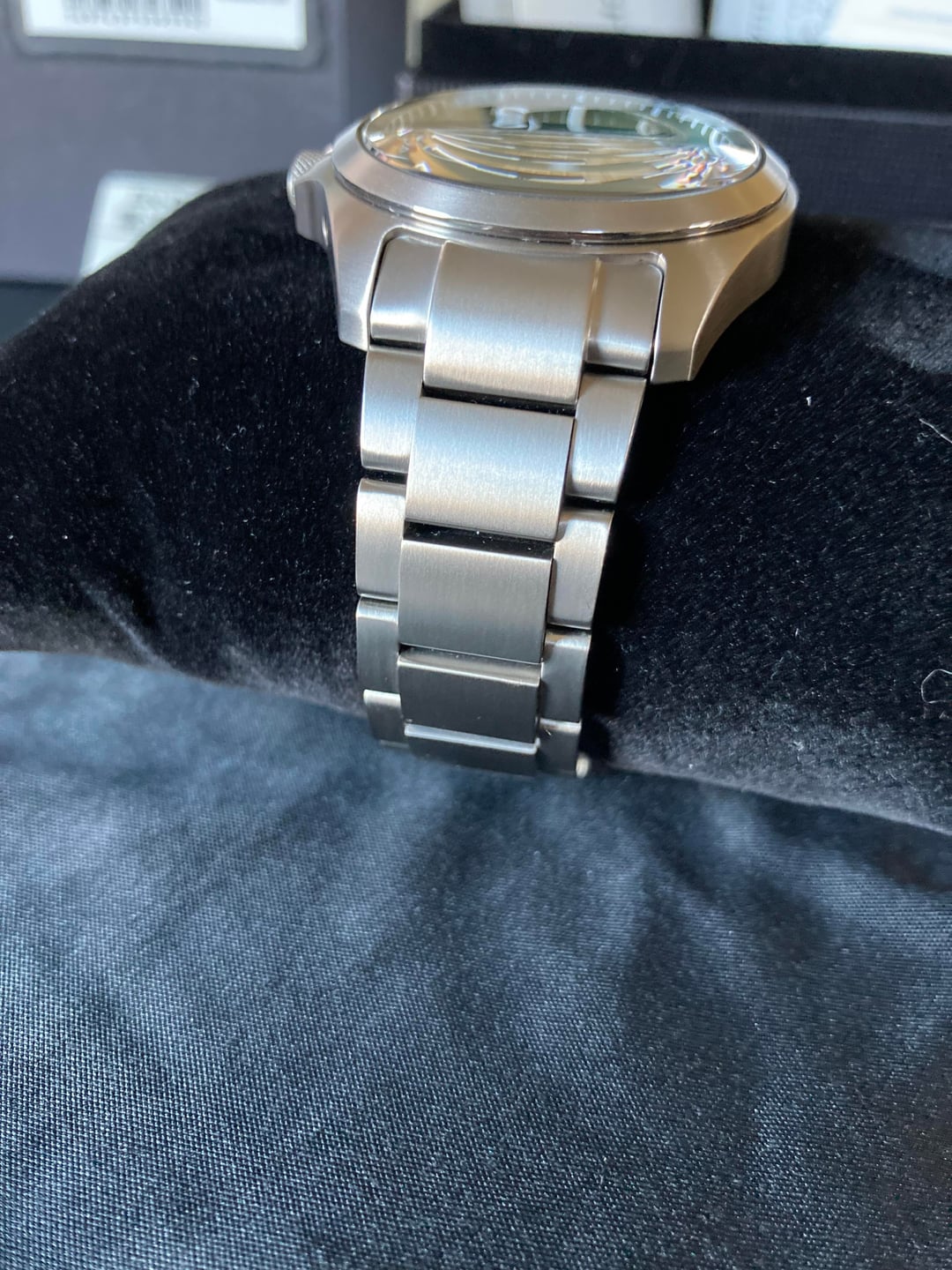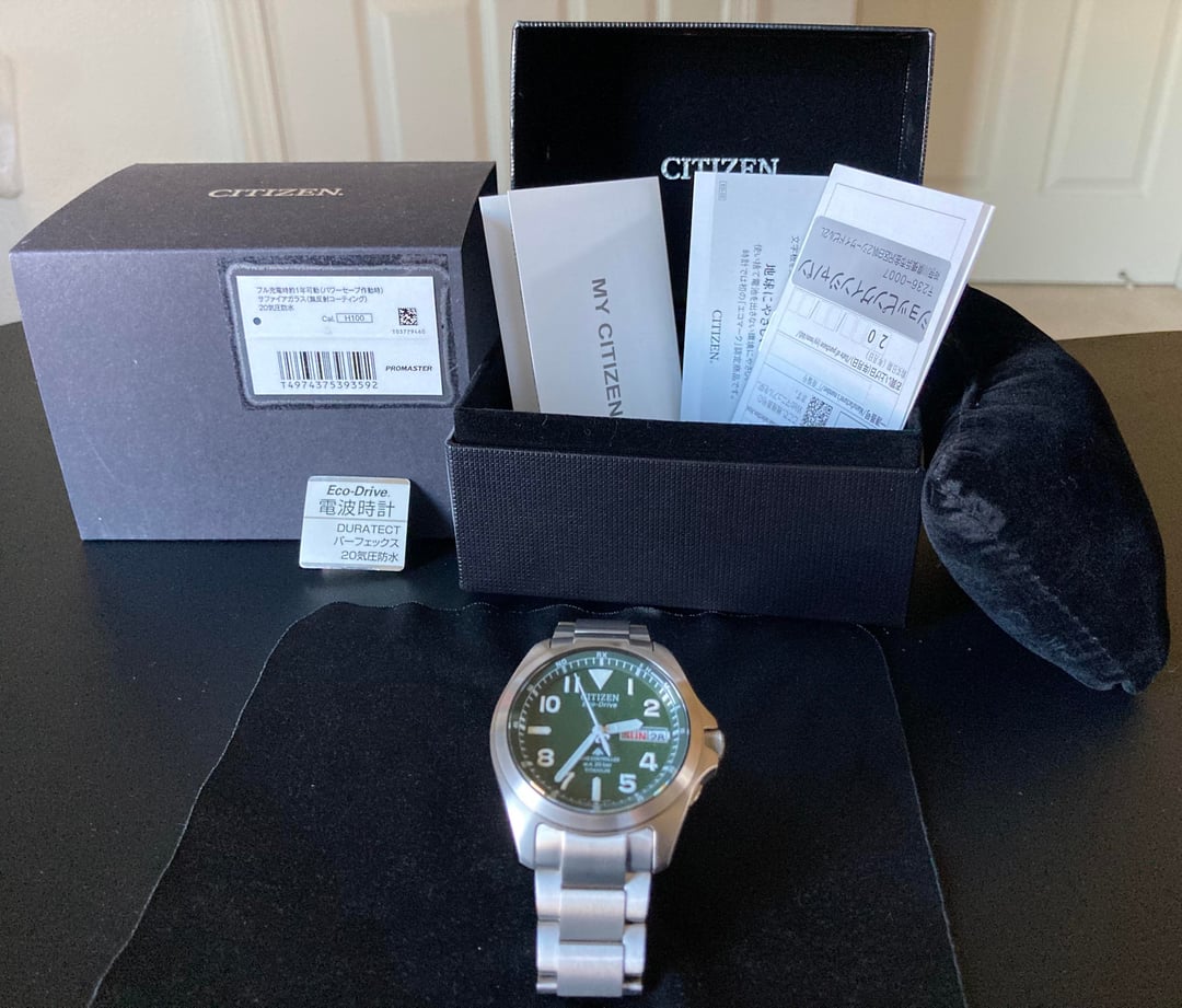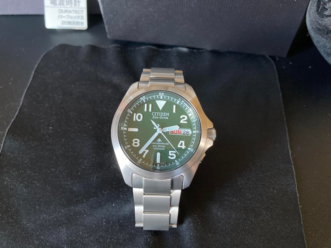 Price: $350 shipped (CONUS ONLY) Payment method: PayPal or ApplePay This is the Citizen Promaster PDM56-2951 Land Eco-Drive with the green dial. Bought from Japan. It’s a tough, light, and handsome watch, but I just wasn’t able to bond with it. The watch has many great features including: * Precision ±15 seconds/month * Weight 100g * Thickness 12.0mm * bracelet width 20mm * Case Titanium * Green Dial * Finishing White IP plating * Curved sapphire glass (nonreflective coating) * Fixed time reception function * Radio Reception function (Japan Only) * Charge warning function * Overcharge prevention function * 200m water resistance * Anti-magnetic I’ve managed to keep markings to a minimum. The curved sapphire crystal is clean and clear. It’s sized to my wrist but all pins and links are included. All paperwork is also included. I’m also selling the following watches: -Swatch Sistem 51 YIS401G Boreal -Swatch Sistem 51 YIS407G Kaki -G-Shock Mudmaster GG1000-1A