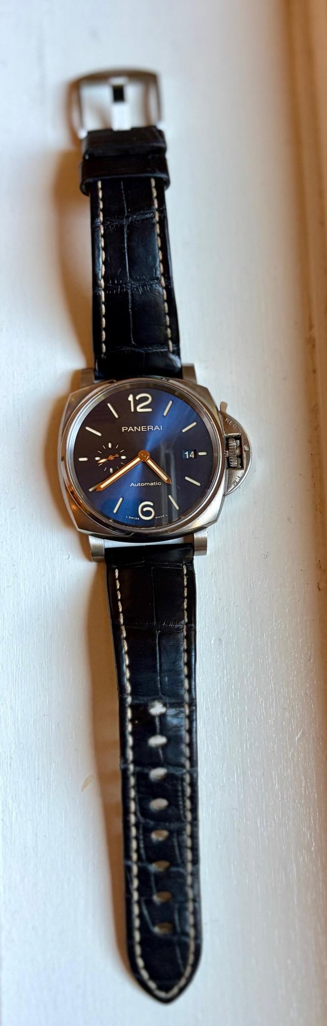 Up for sale is a 42mm Panerai Luminor Due PAM00927 with blue dial. This watch has the classic Panerai case shape but is only 10.7mm thick. Specs: Titanium Blue sunburst dial with luminous gold-tone hands and index hour markers Panerai calibre P.900 automatic movement Excellent unpolished condition Timing within COSC specs Scratch resistant sapphire crystal Date display Quick-release dark blue Panerai alligator band with beige stitch in very good condition Original titanium Panerai signed buckle Original Owner Set includes: Stamped Authorized Dealer warranty card extended until 11/2029 Outer & inner boxes Polishing cloth with Panerai logo Bezel Protector Instructions Tags timestamp: [https://imgur.com/a/7j9gd45](https://imgur.com/a/7j9gd45) Asking price reduced to $4,695, shipped within USA insured 2nd day air, payment by bank wire, Zelle, or PayPal goods & services (with references only). Many references from past watch forum sales available.