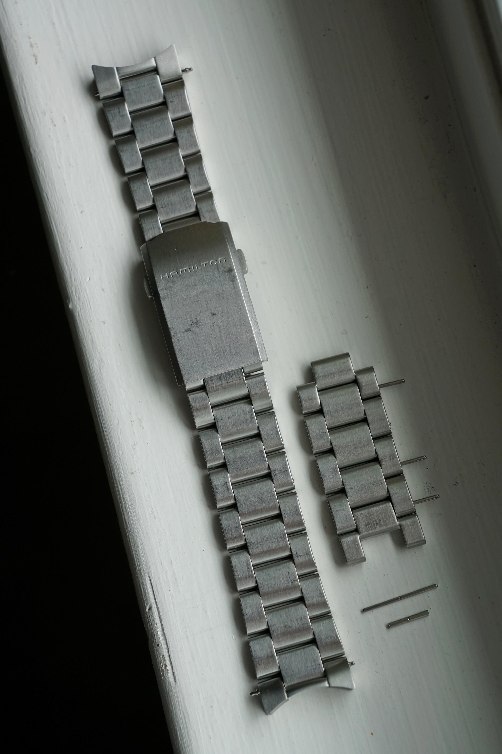 Selling a Hamilton metal bracelet for 37mm Khaki Field Expedition with 20mm lug width. This is the stock bracelet from Hamilton and will only fit this watch. This has been gently worn and both the bracelet and clasp show some signs of wear. The solid end links and spring bars are included. Some extra links are included, but some went missing. With the extra links included, it will fit up to at least 7.0” wrists, possibly a little larger. Asking for $80 with shipping to CONUS included. Paypal F&F, venmo, or Zelle for payment. No trades. Pics: https://imgur.com/a/F8SHRBm Timestamp: https://imgur.com/a/vj65WIj