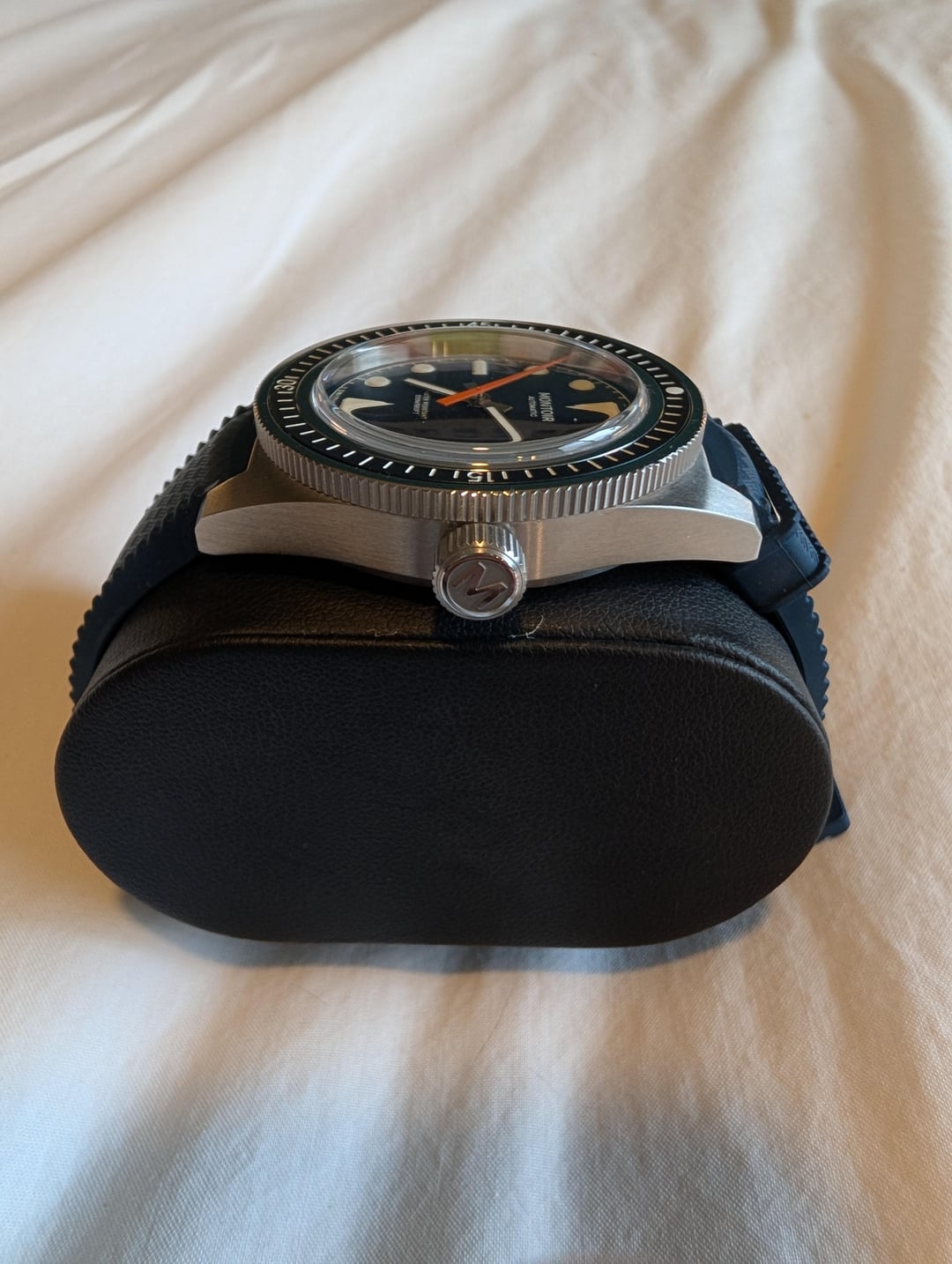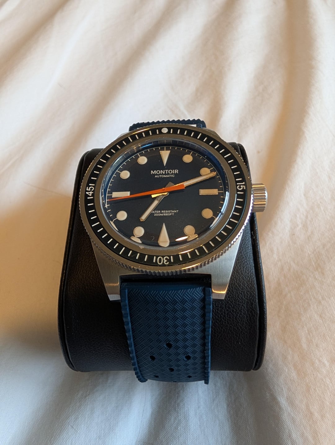 Selling a Montoir diver watch from the once promising but now functionally defunct microbrand. Asking $275 shipped USPS Priority Mail in the US, will accept Paypal F&F or Zelle, or PayPal G&S with an additional $20 fee. Specs: Case Size: 40.5mm Thickness: 11.5mm (Including crystal) Lug to Lug: 48mm Lug Width: 20mm Movement: Sellita SW200-1 Automatic Movement Additional Info: 120 Click Unidirectional Bezel, Aluminum Bezel Insert, Top Hat Domed Sapphire Crystal, BGW9 Super-Luminova, Water Resistant 200m