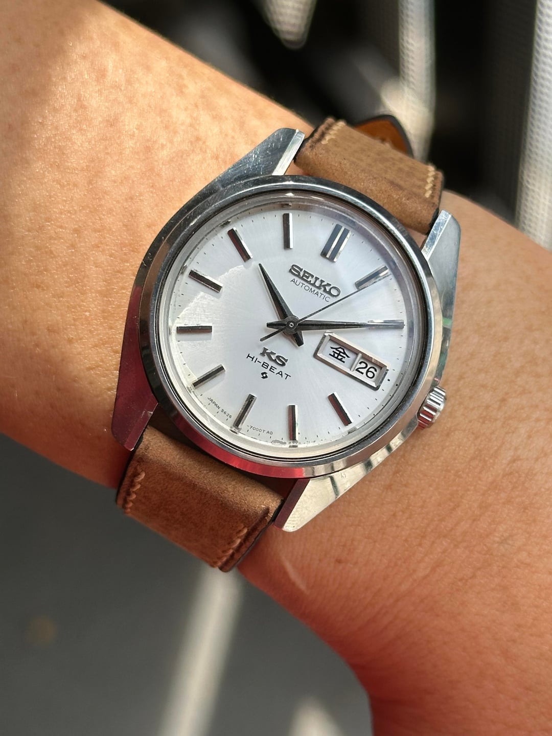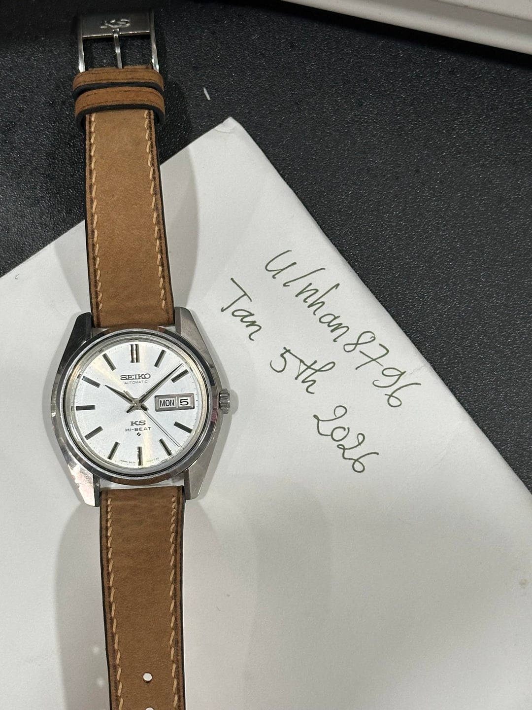 Hi r/Watchexchange, Letting go of my vintage Seiko King Seiko 5626-7000, one of the true icons from Seiko’s golden era. This one features the legendary Hi-Beat automatic movement, sharp classic case lines, and that clean silver sunburst dial you just can’t beat. Details • Reference: 5626-7000 • Movement: Seiko 5626 Hi-Beat (28,800 bph) • Jewels: 25 • Case Size: 37mm • Lug-to-lug: 42mm • Thickness: 11mm • Lug Width: 18mm • Crystal: Acrylic • Water Resistance: Not tested (vintage) Condition • Unpolished case — retains original lines & chamfers • Dial & hands original, beautiful silver tone • Day-date works properly • Movement recently serviced — running strong and healthy • Light vintage wear consistent with age, nothing excessive • Comes on the leather strap shown • Includes original KS buckle What makes this special This is a true Daini-era King Seiko Hi-Beat, known for accuracy, finishing, and timeless design. A fantastic Japanese alternative to Swiss dress watches of the same period — without the crazy price tag. What’s included Watch + leather strap + original KS buckle (no box or papers) Timegraph: https://drive.google.com/drive/folders/1BgFL0mvDUsbjlJgq2ak8AXdqnqI11diz 💵 Price: $599 + shipping 📦 Shipping: $50 UPS 3-5 business days (with tariffs taken care on my end) 💲 Payment: PayPal F&F or G&S (buyers add 4.6%) 🚫 No trades at this time For more selections, please checkout my Instagram: seiko_saigon Thanks for looking!