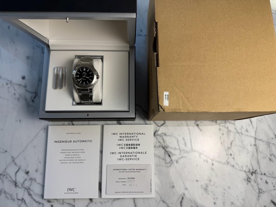 This all-original IWC Ingénieur Ref. IW323902 is offered in never polished stainless steel and remains in excellent overall condition. The case shows only light, honest signs of wear with no deep scratches or dents, reflecting careful ownership while preserving its original factory finish and proportions. The black dial is exceptionally clean and well preserved, offering strong legibility and a balanced, technical aesthetic that defines the Ingénieur line. The stainless steel bracelet is complete with all links, maintaining a solid and comfortable fit on the wrist. The movement was professionally serviced in December 2025 and is running properly. The watch was also pressure tested to 3 ATM (30 meters). This example is offered as a complete set, including the original boxes, booklets, and bracelet adjustment pins, making it a well-preserved and highly appealing example of this modern IWC classic. **Ref:** IW323902 **Size:** 40mm **Year:** 2017 📜 Includes: Original box & papers 💵 Price: $5,475 + FREE overnight shipping with FedEx fully insured. [Timestamp](https://imgur.com/a/gREnZES) 🔗 Other Listings: [profile](https://www.reddit.com/u/BoghossianJewelry/s/vm81HAdB7o) | [watchrecon](https://www.watchrecon.com/?query=BoghossianJewelry&last_days=0) 🔥 Follow us on [Instagram](https://www.instagram.com/bogossiajewelers) 📍 Location: New York 🔒 Authenticity: 100% guaranteed, buy with confidence. We have 160+ reviews on Chrono24 with 180+ transactions, and Excellent rating score on Trustpilot. Visit our [profile](https://www.reddit.com/u/BoghossianJewelry/s/vm81HAdB7o) for links and references. 📦 Domestic Shipping: Ships with FedEx overnight, within 24 business hours of payment, from New York, NY to CONUS. The shipment is fully insured against damage, loss or theft. 🌍 International Shipping: Incurs an additional $100. 💳 Payment: Crypto (+2%), PayPal/CC (+4%), Web, or Face-to-face deal in NY. 🔐 [Seller References](https://bogossia.com/authenticity) 📸 [IG: @bogossiajewelers](https://www.instagram.com/bogossiajewelers)