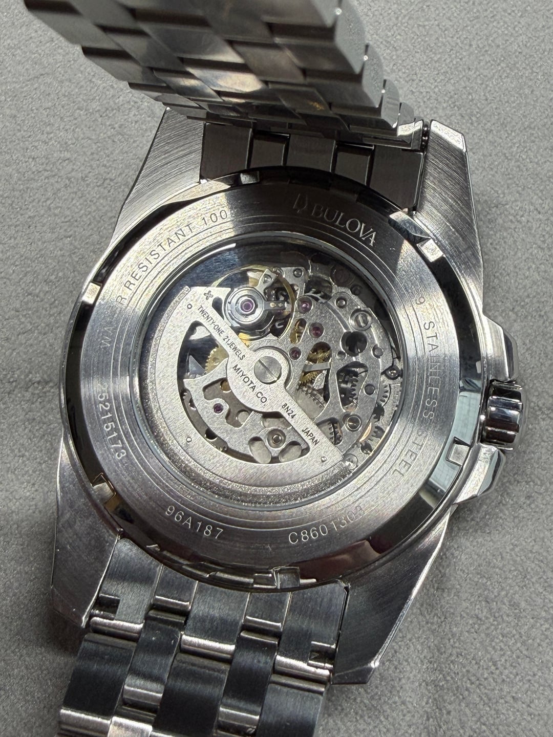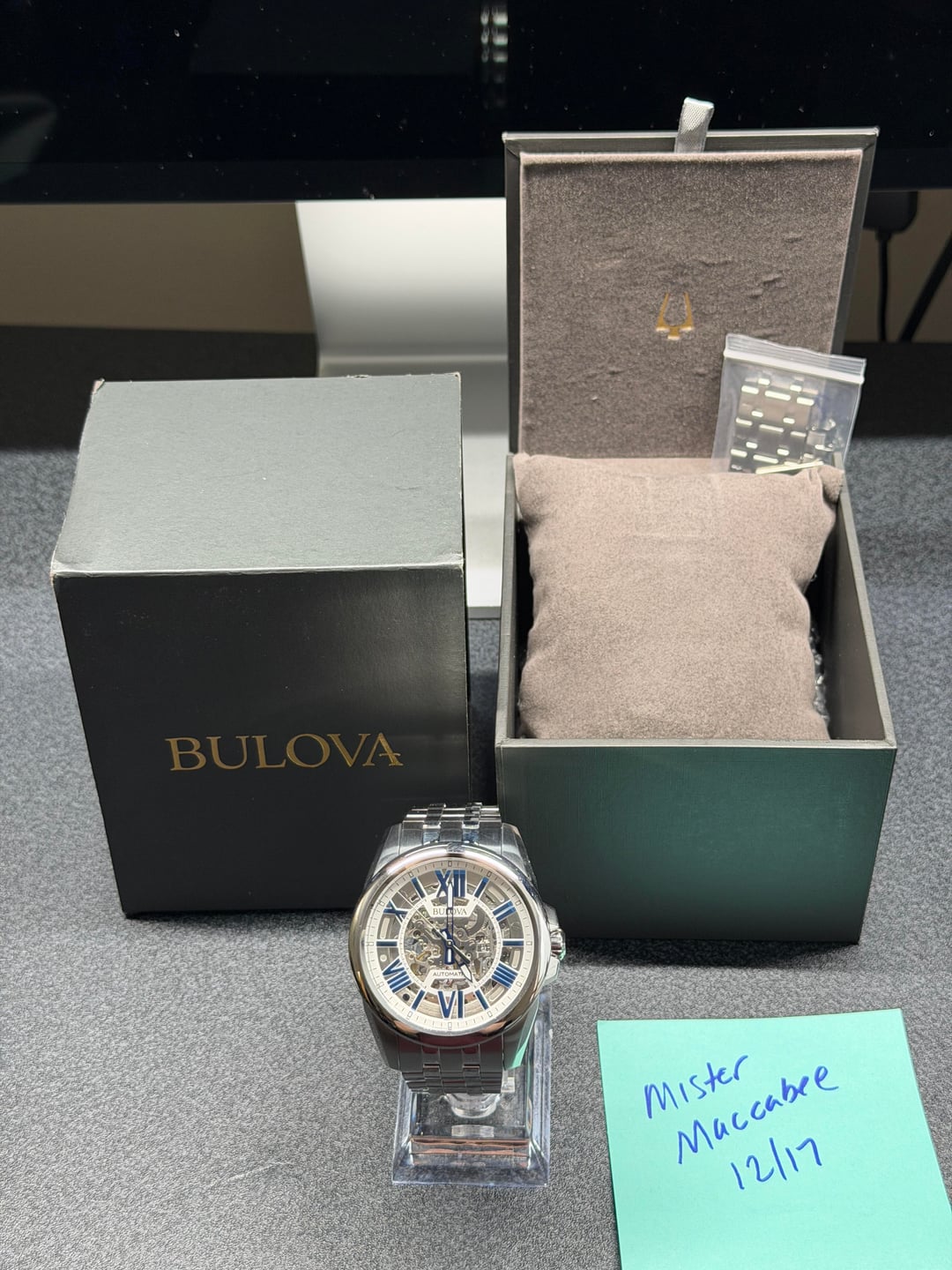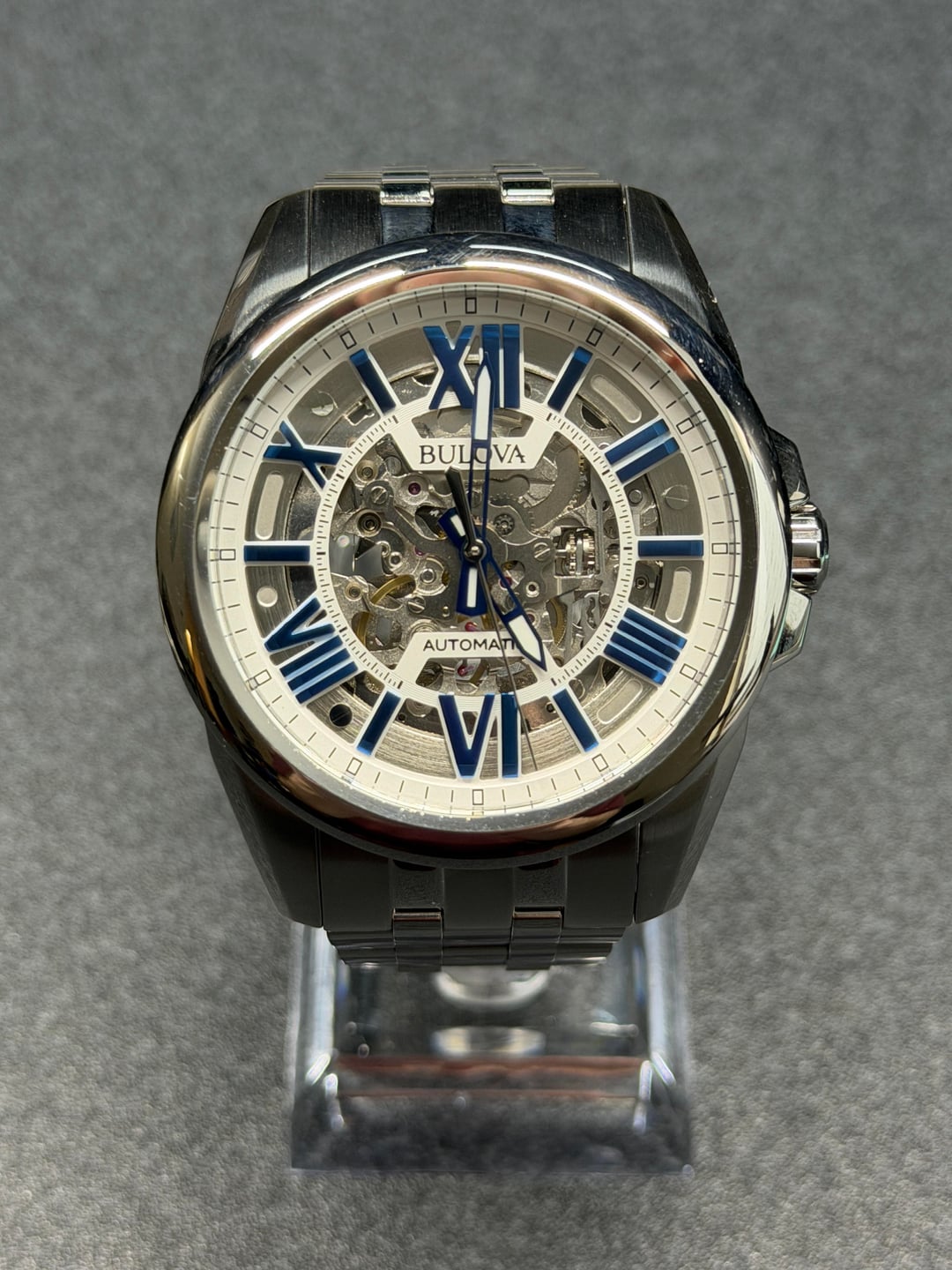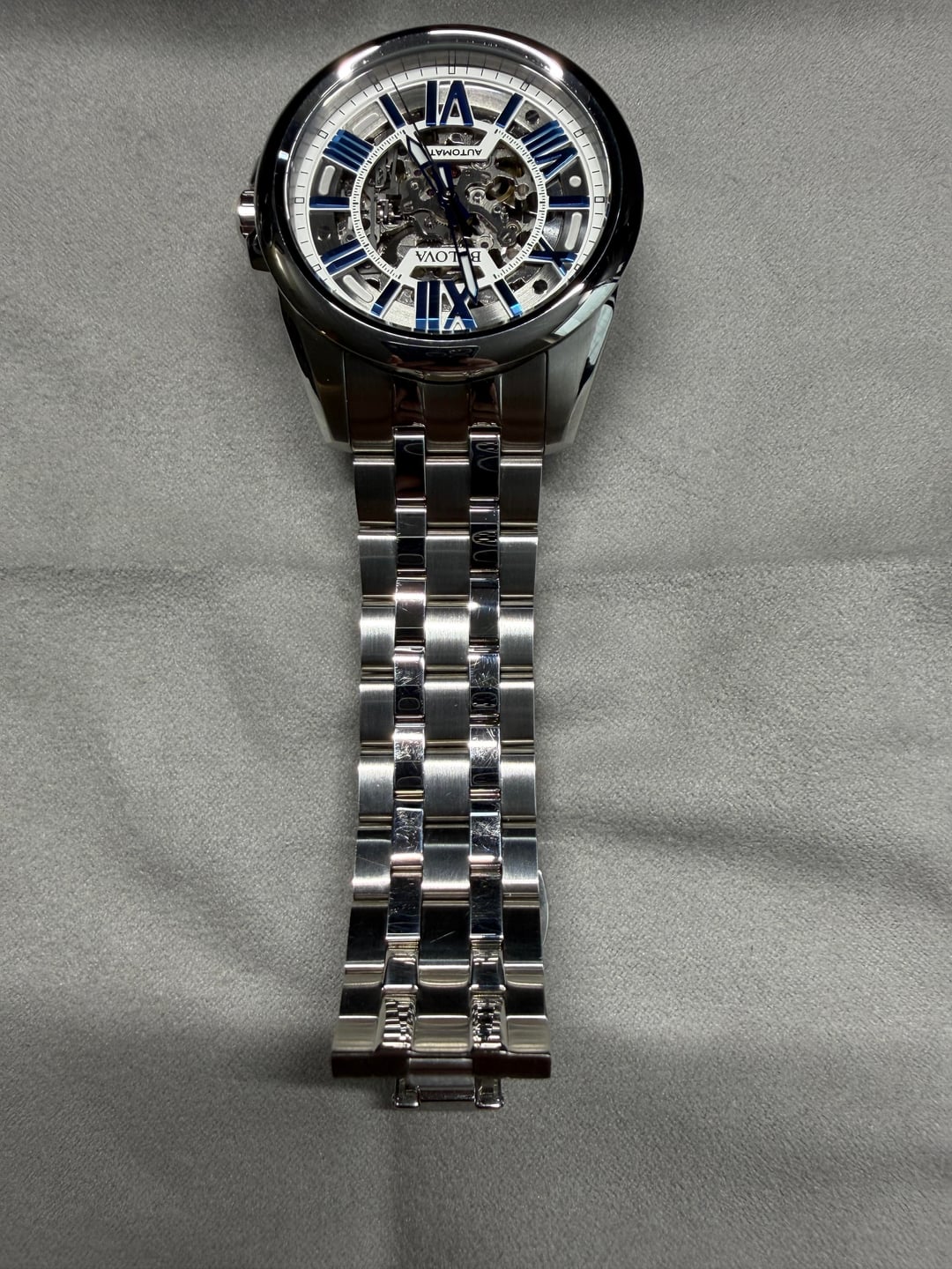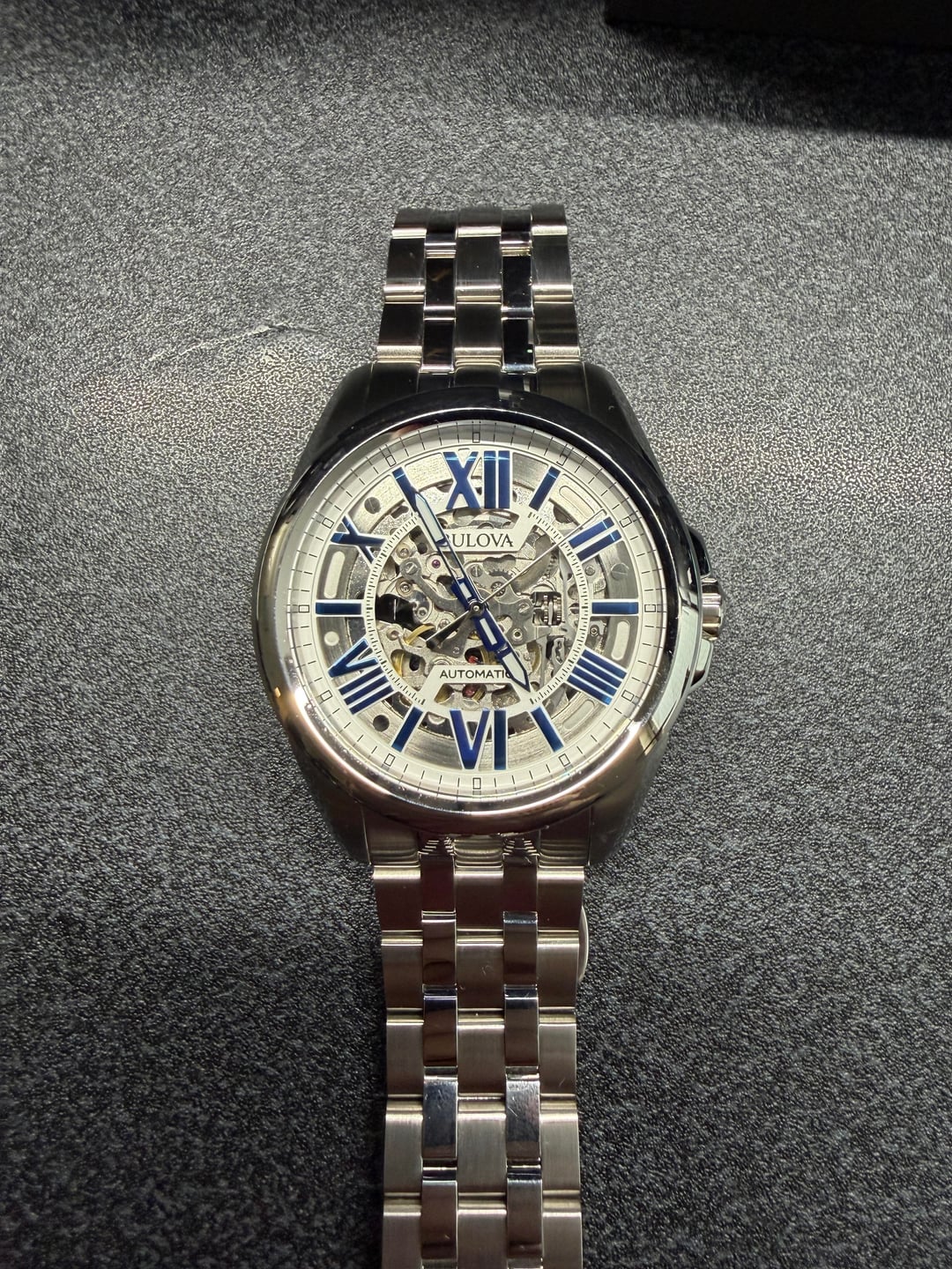 Hey folks Amazing looking skeleton from Bulova with classic blue roman numeral markers, great shade of blue btw. I am not the original owner. There are some marks on case and hairlines on bracelet but overall looks great - see pics. Glass is clear of any marks as far as I can see. *PRICE DROP* $200 shipped conus PayPal F&F or Zelle. I have 60 positive transactions on watchexchange with good feedback so please read them. Also have an eBay store with hundreds of sales and hundreds of positive feedback so read them as well (offtherakcollectibles) Sale only, no trades. Ships from NYC so if you're in area can meet up locally. Please leave a comment here so I can view your transaction history and then message me if you're interested. Thank you! ---------- * It features a 43mm stainless steel case and a matching stainless steel bracelet. * The silver-tone skeleton dial showcases the automatic movement within, with contrasting blue Roman numeral indices and hands. * The watch is powered by a self-winding mechanical movement and never requires a battery. * It has a flat mineral crystal and an exhibition case back to view the movement. * Water-resistant to 100 meters (330 feet), it is suitable for swimming and snorkeling.