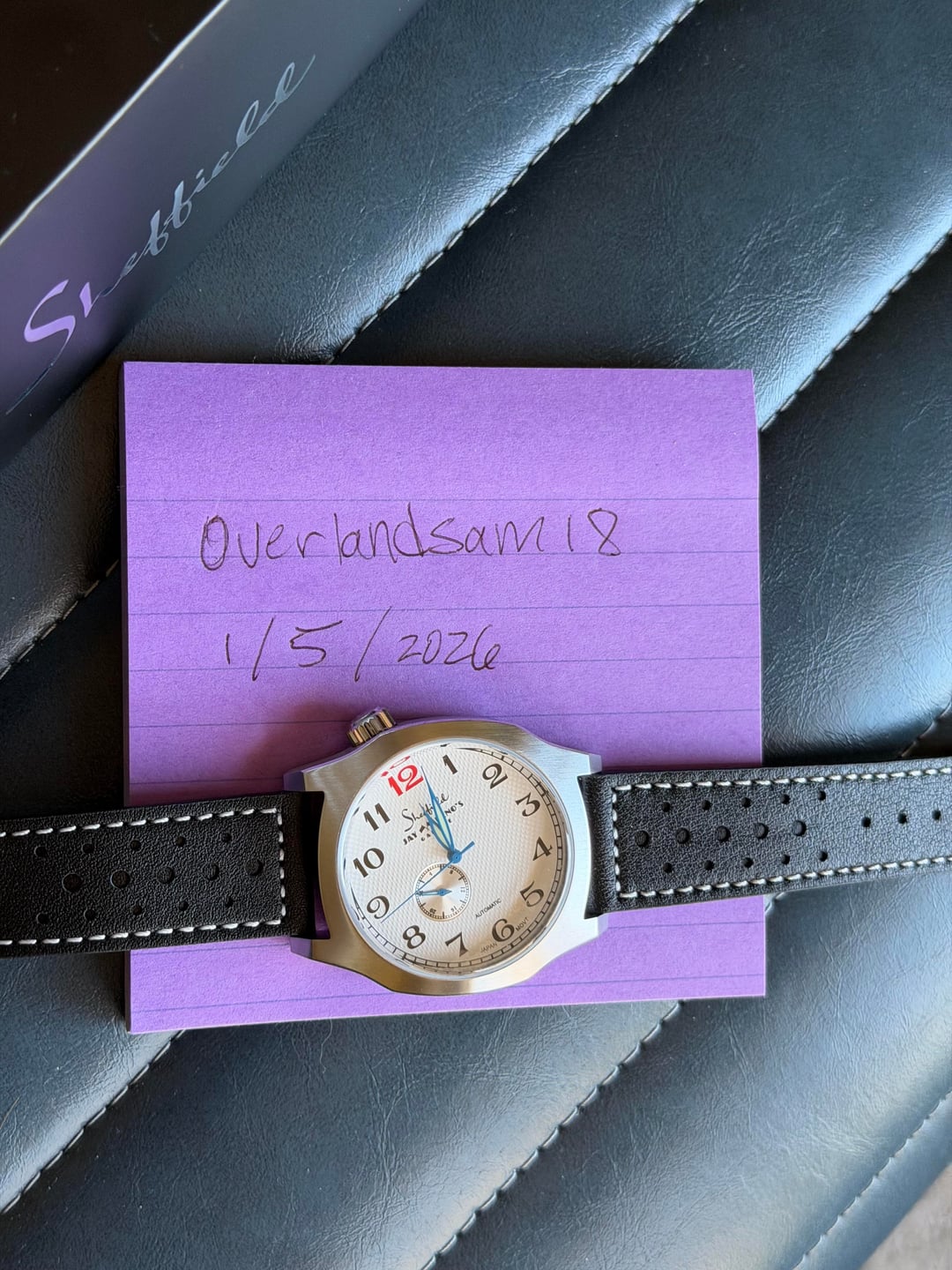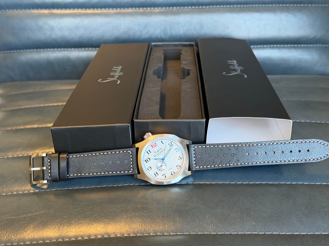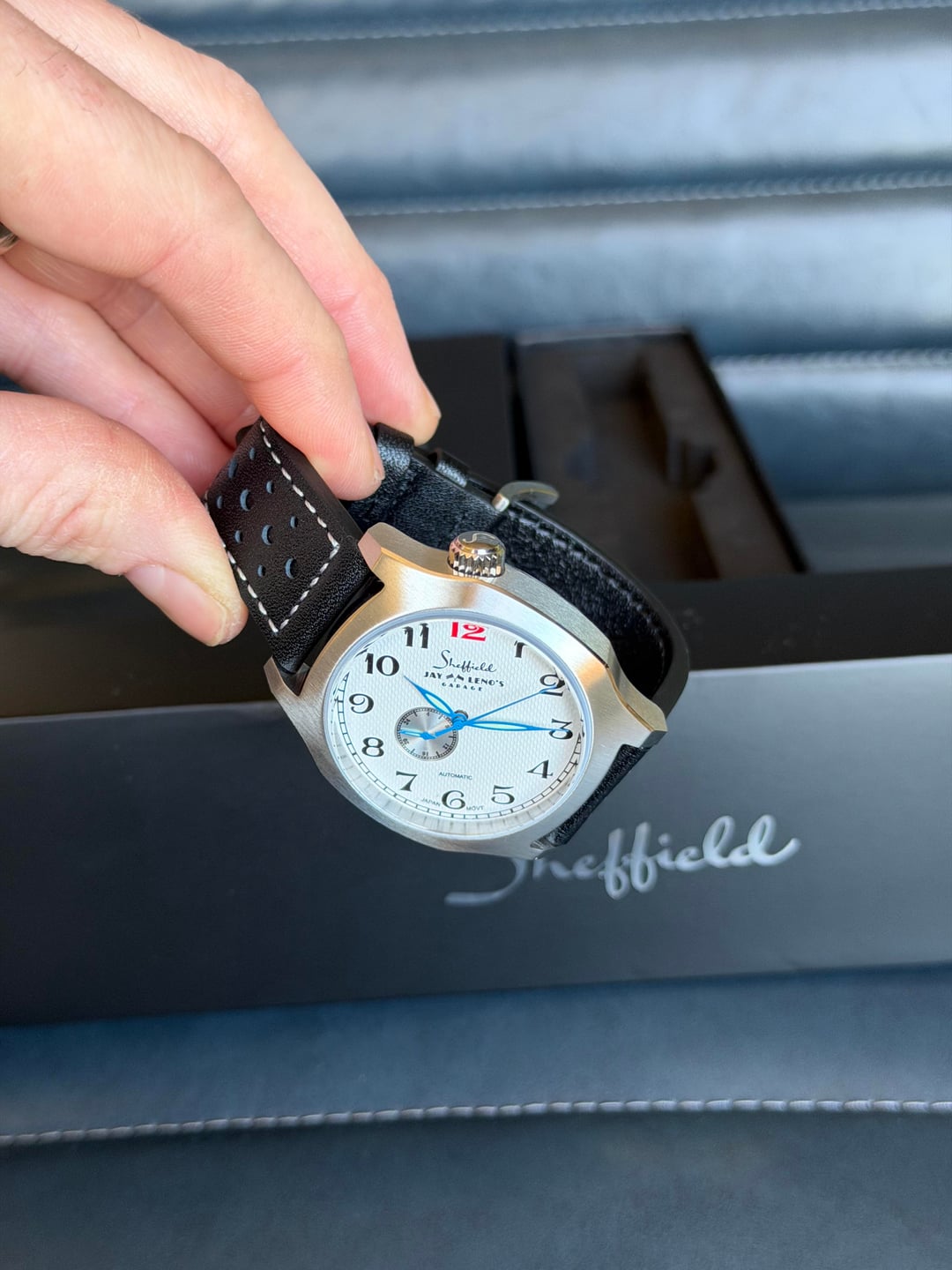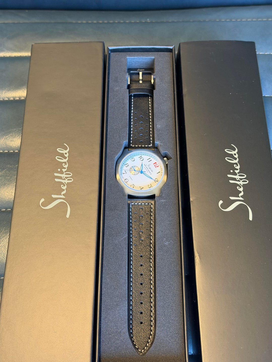 Brand new, unworn example of the limited-run Jay Leno’s Garage watch from Sheffield. Asking $550 plus shipping label. Located in Georgia, USA. This is a fun and unique take on a driver’s watch, where the 12 o’clock marker points down the road when holding a steering wheel. These sold out in hours, and I bought two - one (this one) was intended as a gift, but I never got around to gifting it to anyone, as it’s best suited to larger wrists and car/watch enthusiasts. More information at their website here: https://sheffieldwatches.com/products/jay-leno-s-garage-limited-edition-driver-s-watch?srsltid=AfmBOorqztpIkSe0ouRRwRnRldvJy6HIui1zvcYoqIuw8fbafOPbXKAj As this is my first time selling on Reddit, I’m happy to FaceTime with any that are seriously interested.