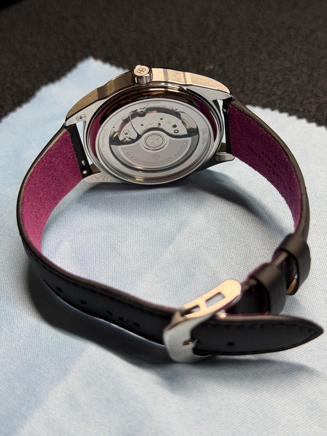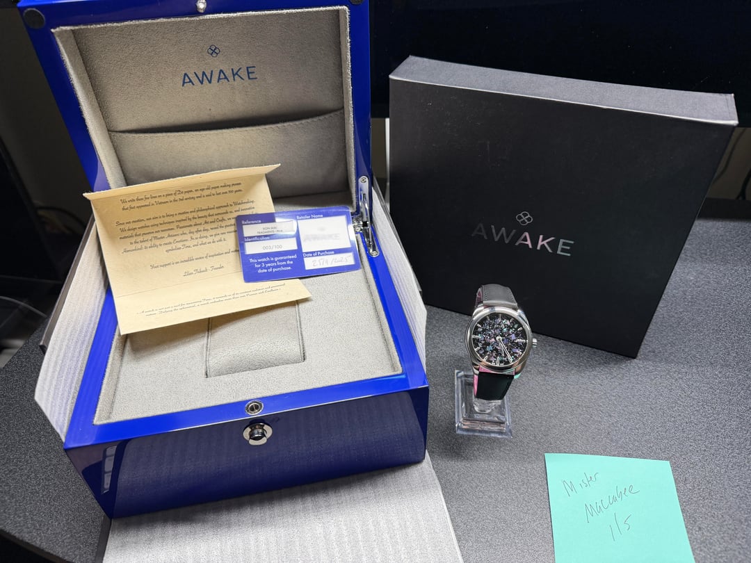 Hey folks Worn 2x. Looks great. Comes full kit - see pics. From first original batch which is now sold out $2500 shipped conus PayPal F&F or Zelle. I have 60 positive transactions on watchexchange with good feedback so please read them. Also have an eBay store with hundreds of sales and hundreds of positive feedback so read them as well (offtherakcollectibles) Sale only, no trades. Ships from NYC so if you're in area can meet up locally. Please leave a comment here so I can view your transaction history and then message me if you're interested. Thank you! \--------------- Per Awake site: The Fragments collection marks a new step in our creative adventure, combining Vietnamese lacquer, natural mother-of-pearl and the ancient Japanese art of Raden in a mesmerizing, luminous harmony. The pink and pearly shades of this version embody the dialogue between matter and emotion, the visible and the invisible. From some angles, it evokes the softness of twilight; from others, the stellar reflections of the cosmos. A dial of light and mystery. **Case:** Recycled 316L stainless steel, Ø39mm, lug-to-lug 45.6 mm, lug width 20mm **Thickness:** 11.80mm with crystal / 10.90mm without crystal **Métier d'Art dial:** Reinterpretation of the ancient Japanese technique of Raden using a mosaic of fragments of mother-of-pearl, Vietnamese lacquer and natural pigments. **Indexes and hands:** Super-LumiNova® BGW9, AWAKE luminous “coiffe” signature **Water resistance:** 5 ATM (50m) **Top lens:** Sapphire, anti-reflective coating **Caseback:** Screw-in caseback, sapphire crystal **Strap:** Jean Rousseau handmade matte black calfskin leather lined with colored Alcantara, tone-on-tone topstitching, equipped with ‘presto’ pumps and mounted on a hollowed-out pin buckle. 115x75 - 20-16mm. **Movement:** Automatic La Joux-Perret G101, 68-hour power reserve **Decorations:** Personalized tungsten rotor, alternating concave and convex surfaces with brushed, micro-beaded and polished finishes. Micro-beaded bezel engraved with laser inscriptions specific to each version.
