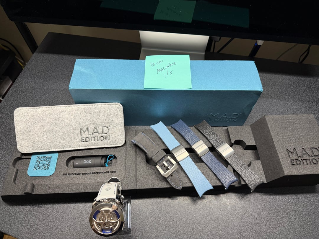 Hey folks This is the original friends and family version, the first version produced, of the M.A.D.1 Mad Editions from Max Busser and MB&F. It has been sold out for a while now. This will come with over $600 of additional Delugs straps - see pics. There are 3 different colored CTS rubber straps cut to size for about a 7 inch wrist or so. Plus a gray/blue alcantara strap that is on backorder currently. in really nice condition. I am not the original owner. See pics for condition of case. Some minor wear to be expected. $4750 shipped conus PayPal F&F or Zelle. I have 60 positive transactions on watchexchange with good feedback so please read them. Also have an eBay store with hundreds of sales and hundreds of positive feedback so read them as well (offtherakcollectibles) Sale only, no trades. Ships from NYC so if you're in area can meet up locally. Please leave a comment here so I can view your transaction history and then message me if you're interested. Thank you!