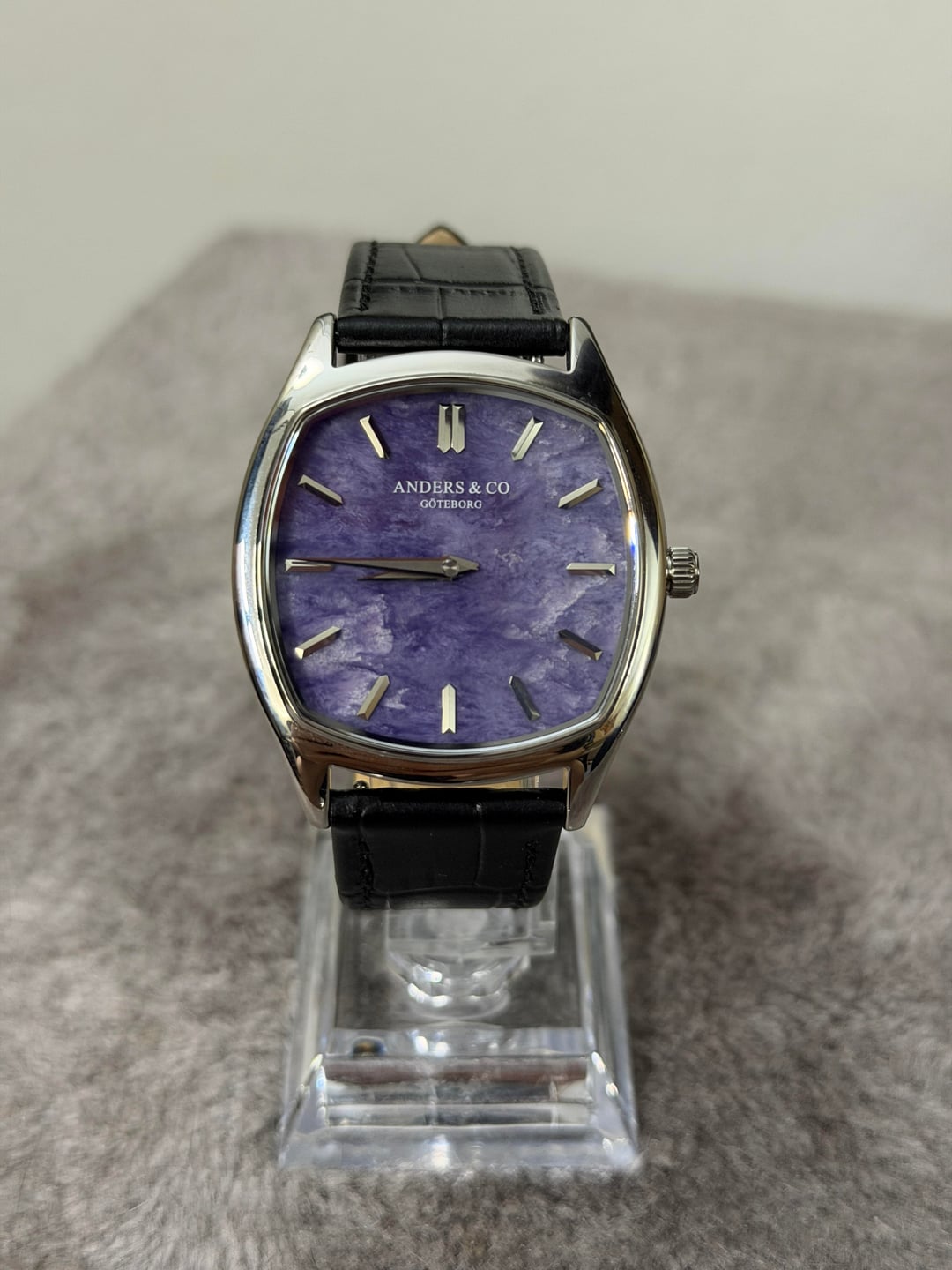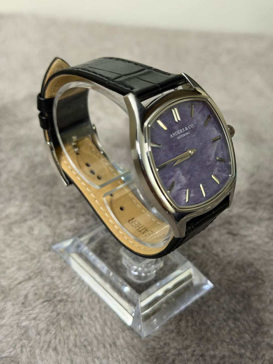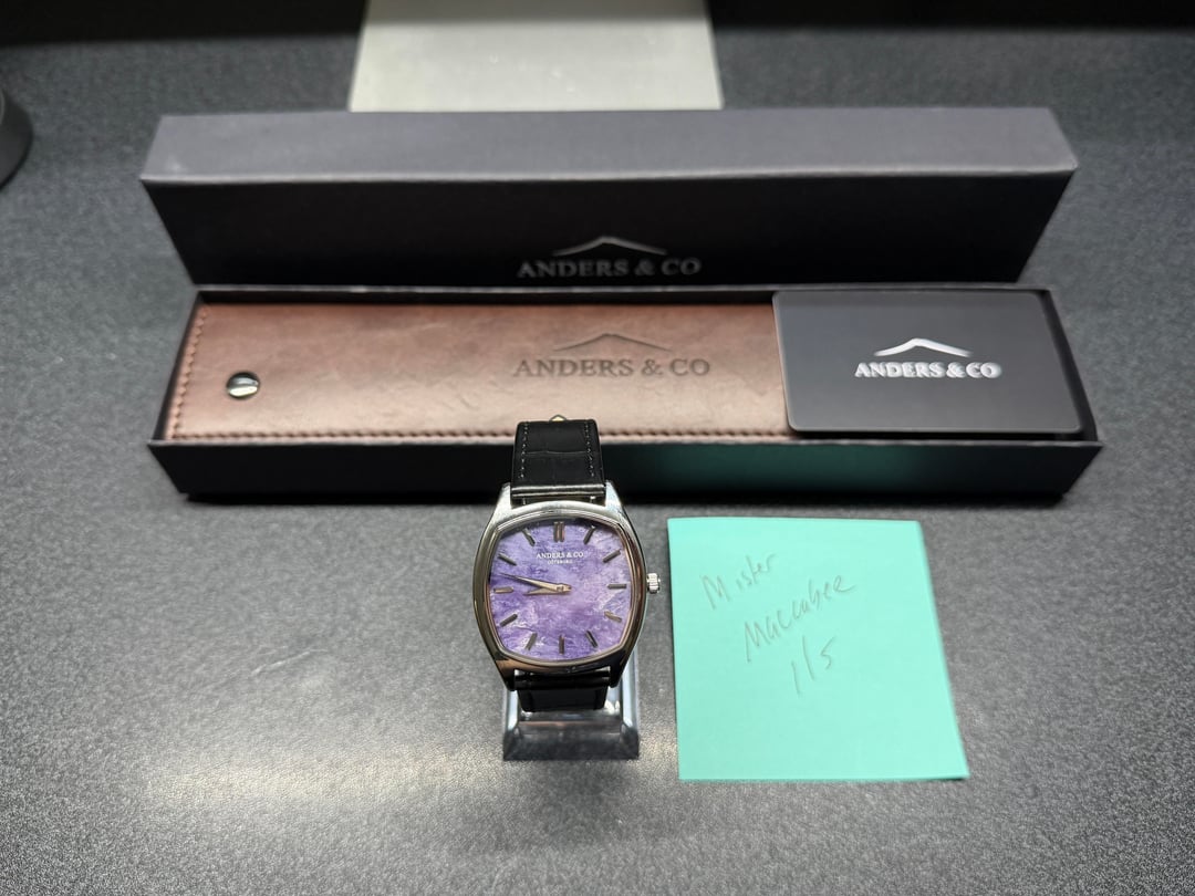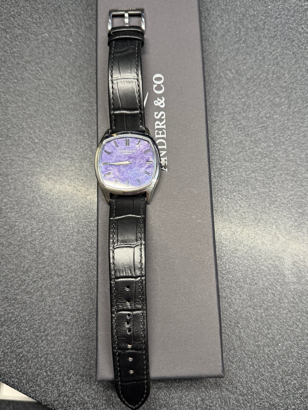 Hey folks Gorgeous purple charoite dial on this Anders & Co. Paid $635 plus another $150 in tariffs & fees. Asking less. Great condition, like new, worn 1x. Comes full kit, see pics. $600 shipped conus PayPal F&F or Zelle. I have 60 positive transactions on watchexchange with good feedback so please read them. Also have an eBay store with hundreds of sales and hundreds of positive feedback so read them as well (offtherakcollectibles) Sale only, no trades. Ships from NYC so if you're in area can meet up locally. Please leave a comment here so I can view your transaction history and then message me if you're interested. Thank you! \------------ * Case Material: 316L stainless steel * Case Diameter: 37 mm * Case Thickness: 5.65 mm * Lug Width: 20 mm / 44.6 mm lug-to-lug * Movement: Miyota 9T22 slim * Finishes: Mirror-polished & satin-brushed (hand-finished) * Crystal: Anti-reflective sapphire * Case-back: Snap caseback * Strap & Buckle: Genuine leather and steel * Water Resistance: 3 ATM