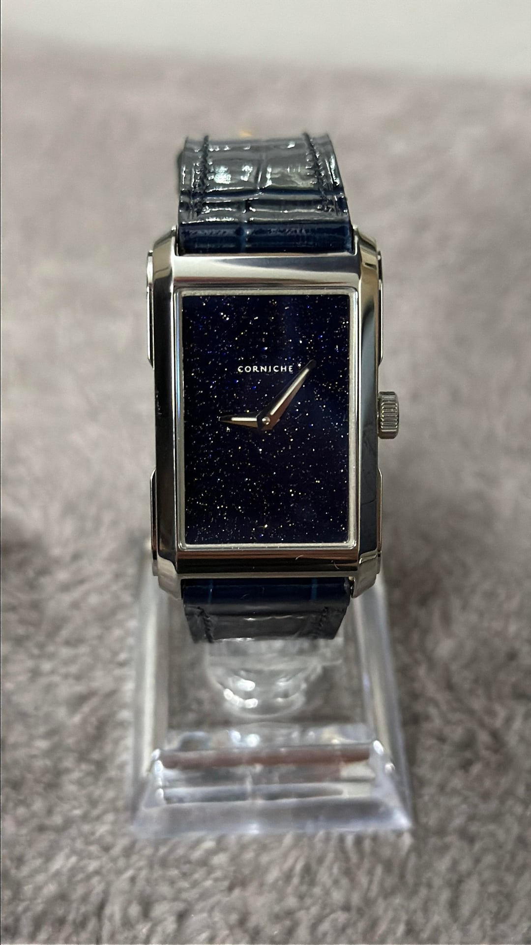Hey Folks Gorgeous aventurine tank-style from Corniche now currently sold out and unavailable on their website. Also ships from overseas and I paid tariffs and fees on this one. Great condition, lightly worn a couple of times. See pics. Full kit as shown. Come son a beautiful blue leather strap. $475 shipped conus PayPal F&F or Zelle. I have 60 positive transactions on watchexchange with good feedback so please read them. Also have an eBay store with hundreds of sales and hundreds of positive feedback so read them as well (offtherakcollectibles) Sale only, no trades. Ships from NYC so if you're in area can meet up locally. Please leave a comment here so I can view your transaction history and then message me if you're interested. Thank you! \--------- * Case Material: Fully Polished Stainless Steel * Case Size: 24 mm x 39.5 mm x 7.4 mm * Dial: Aventurine Glass * Hands: Dauphine with BGW9 luminous material * Hour markers: Elongated with BGW9 luminous material * Crystal: Sapphire, 7-layer AR + hardened / anti-fingerprint coat * Strap: Genuine leather with Glossy finish in Navy Blue * Strap circumference: 15,5-20 cm * Lug Width: 18 mm * Movement: Miyota Quartz * Water Resistance: Waterproof up to 5ATM