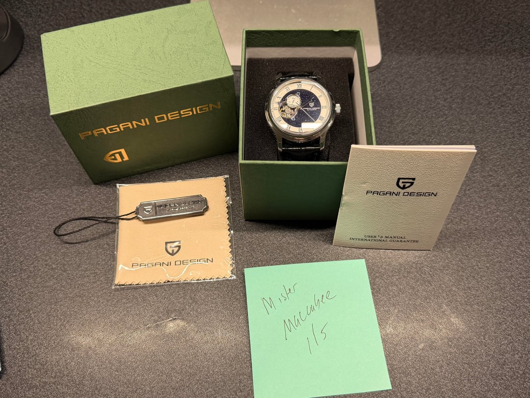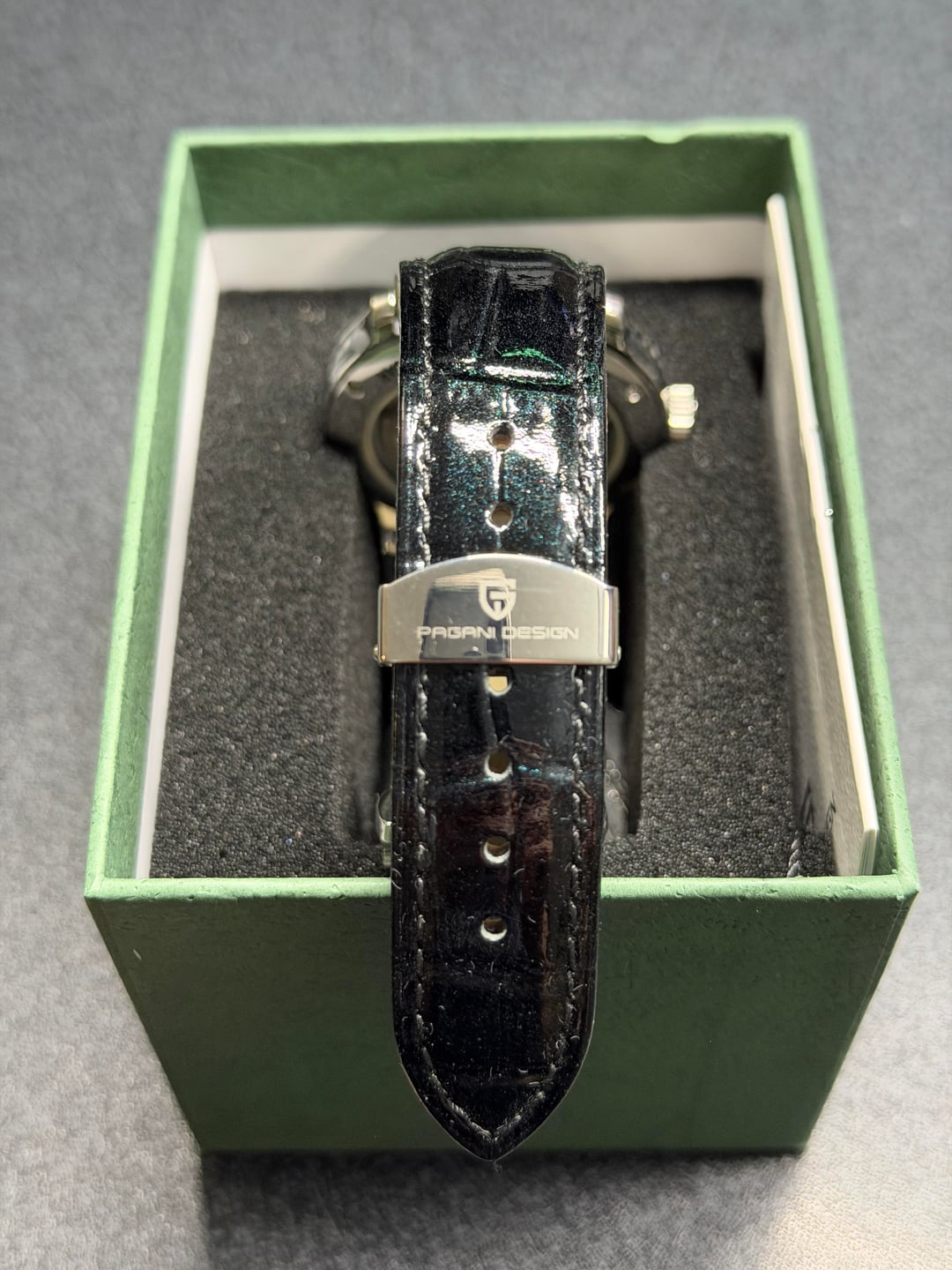 Hey folks Cool looking aventurine dial from Pagani. Not really worn, just tried on inside and picture taking. Comes full kit with Pagani clasp on leather strap. I really like the sides of the case and the pattern under the glass on the sides of the case. $120 shipped conus PayPal F&F or Zelle. I have 60 positive transactions on watchexchange with good feedback so please read them. Also have an eBay store with hundreds of sales and hundreds of positive feedback so read them as well (offtherakcollectibles) Sale only, no trades. Ships from NYC so if you're in area can meet up locally. Please leave a comment here so I can view your transaction history and then message me if you're interested. Thank you!