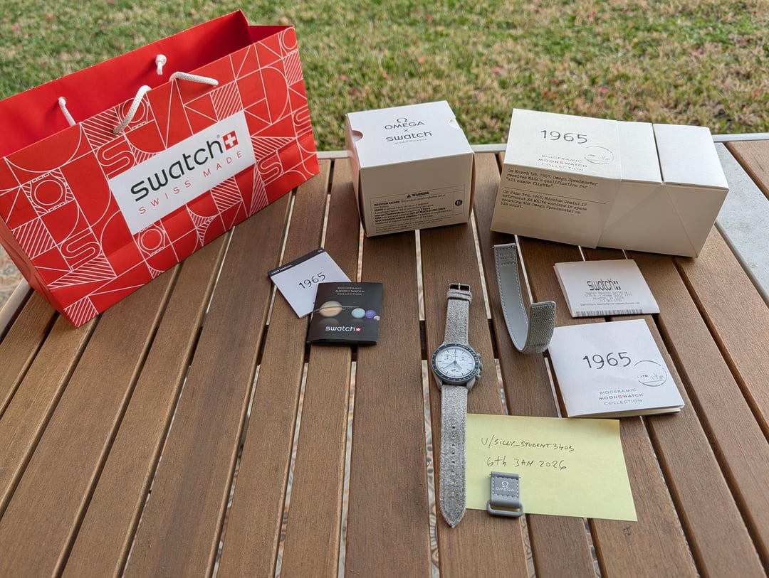 For sale: My 1965 MoonSwatch, bought in Houston in November, will include the receipt in the package. Full kit plus a felt bracelet that I used with it the couple of times I did wear it. Pristine condition, just doesn't get wrist time so I decided to find it a better home. Will ship to CONUS from Houston TX, $295 OBO with normal mail, payment via Zelle or Venmo. Happy to provide more information or pictures, please reach out with any questions !