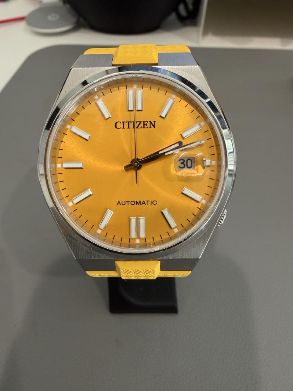 **Album:** https://imgur.com/a/jUr9c6L **Timestamp:** https://imgur.com/1P8sFCE --- **Specs:** * 40mm * Lugs: 9.1mm * Sapphire Crystal * WR50 * https://www.citizenwatch.com/us/en/product/NJ0150-56Z.html --- Hi Fellow Watch Regards, New watches come in so sadly this must go! I originally traded from another Redditor here. Up for sale is a **Tsuyosa in Sunburst Yellow!** It's so nice and eye catching! Here are the extras: * 3 Total FKM rubber straps (pictured with yellow, but includes Black and Royal / Dark Blue) * Original bracelet but with aftermarket OTF adjustable clasp (I do not have the original clasp) Priced to move and shipped to your door with box and things shown in the pictures! **$200 shipped CONUS only.** Thanks!