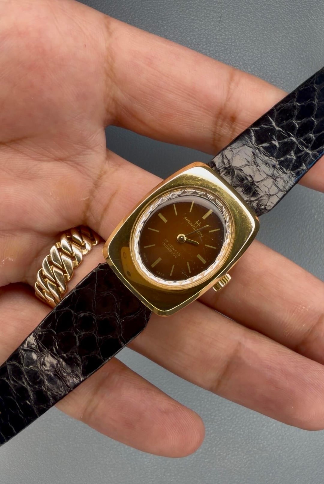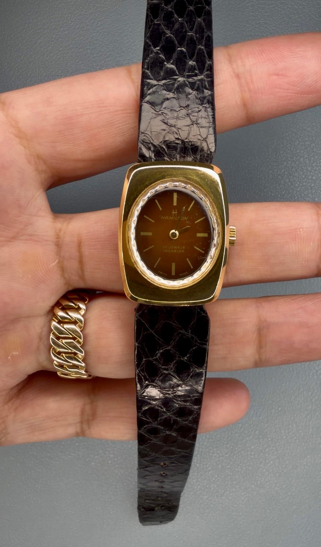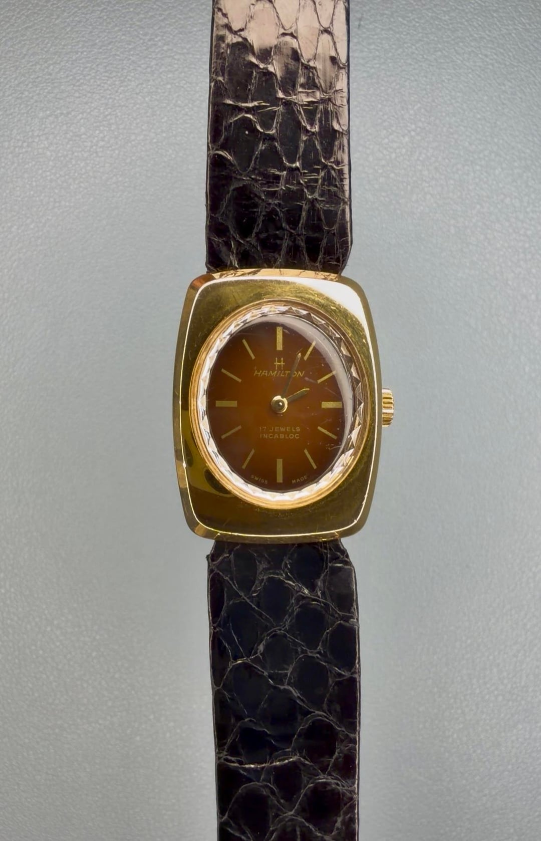 Ladies Hamilton 24308 10k Gold Plated - $127 -Details: A beautiful vintage ladies Hamilton with a 10k gold plated case, caramel colored gradient dial, manual wind movement, on a black leather strap. Has light signs of wears, but in good condition -see the photos for yourself! Perfect for any lady looking for a unique piece to stand out, or makes a great gift! -$127 shipped -Includes shipping (US). I accept Venmo, Zelle, CashApp, and PayPal (+4% if using G&S) -Case size: 21x30mm -Movement: Manual winding -Timestamp: https://imgur.com/a/DoThH1W -Location: Downtown Los Angeles -IG: @ColeccionDeLosSantos -TikTok: Chris.DeLosSantos