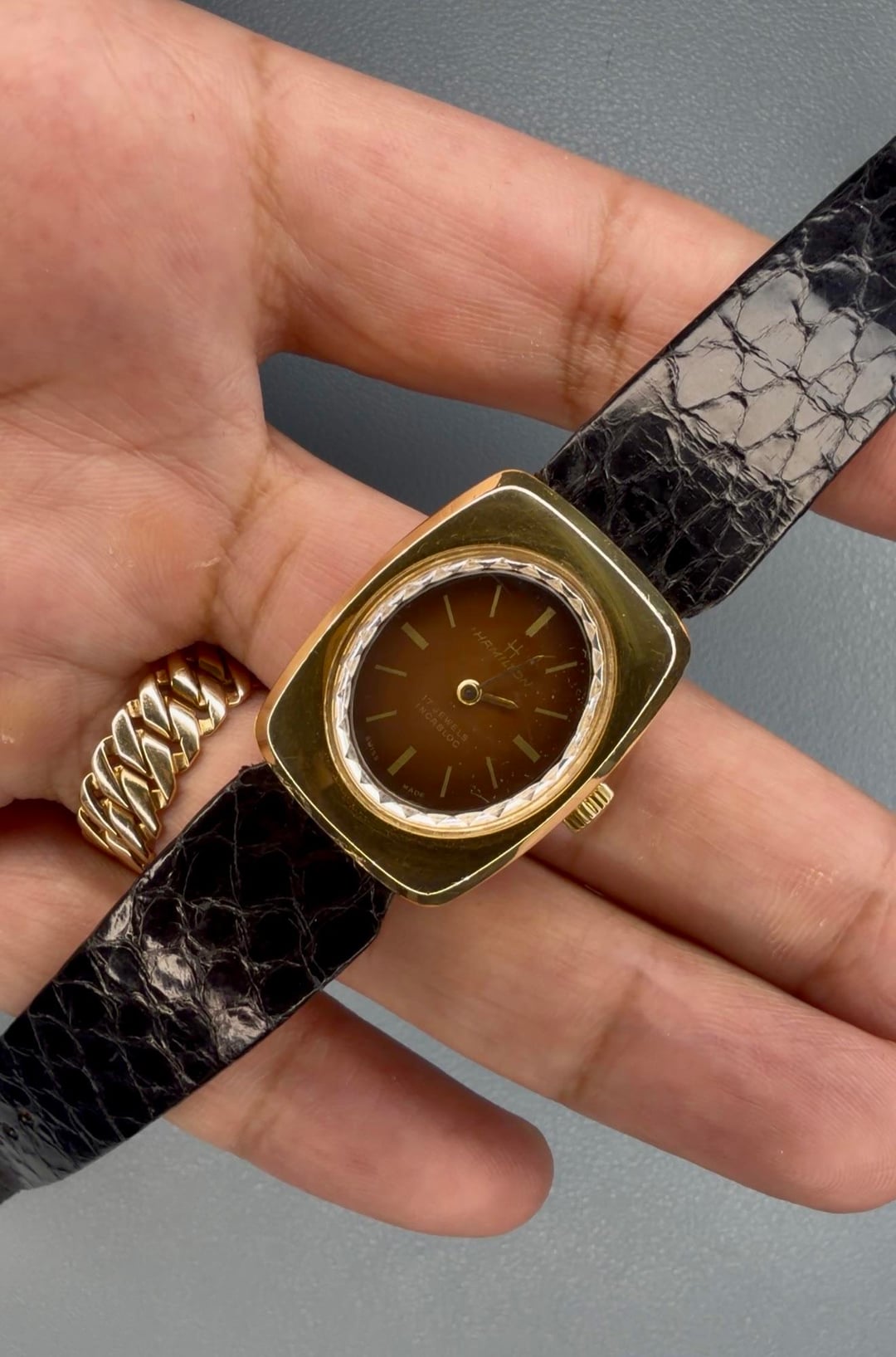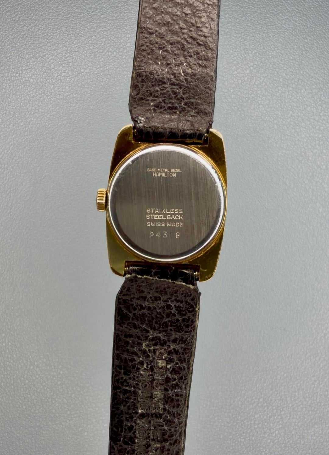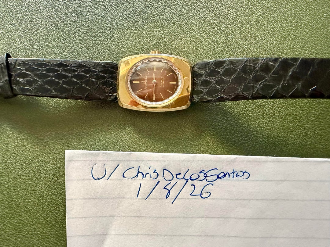 Ladies Hamilton 24308 10k Gold Plated - $127 -Details: A beautiful vintage ladies Hamilton with a 10k gold plated case, caramel colored gradient dial, manual wind movement, on a black leather strap. Has light signs of wears, but in good condition -see the photos for yourself! Perfect for any lady looking for a unique piece to stand out, or makes a great gift! -$127 shipped -Includes shipping (US). I accept Venmo, Zelle, CashApp, and PayPal (+4% if using G&S) -Case size: 21x30mm -Movement: Manual winding -Timestamp: https://imgur.com/a/DoThH1W -Location: Downtown Los Angeles -IG: @ColeccionDeLosSantos -TikTok: Chris.DeLosSantos