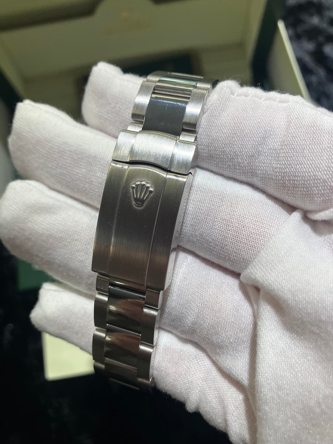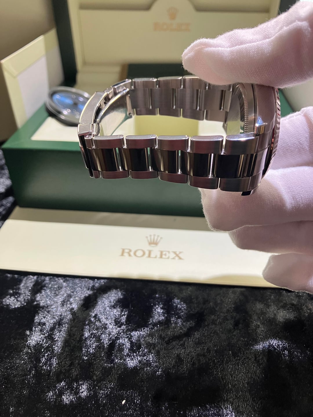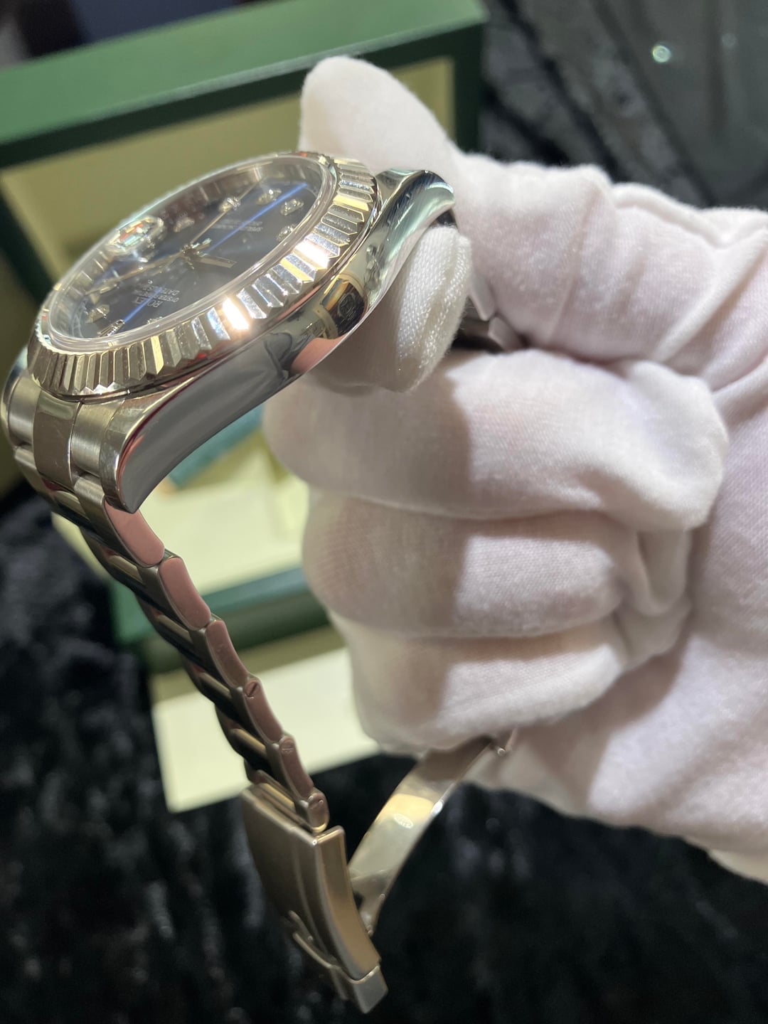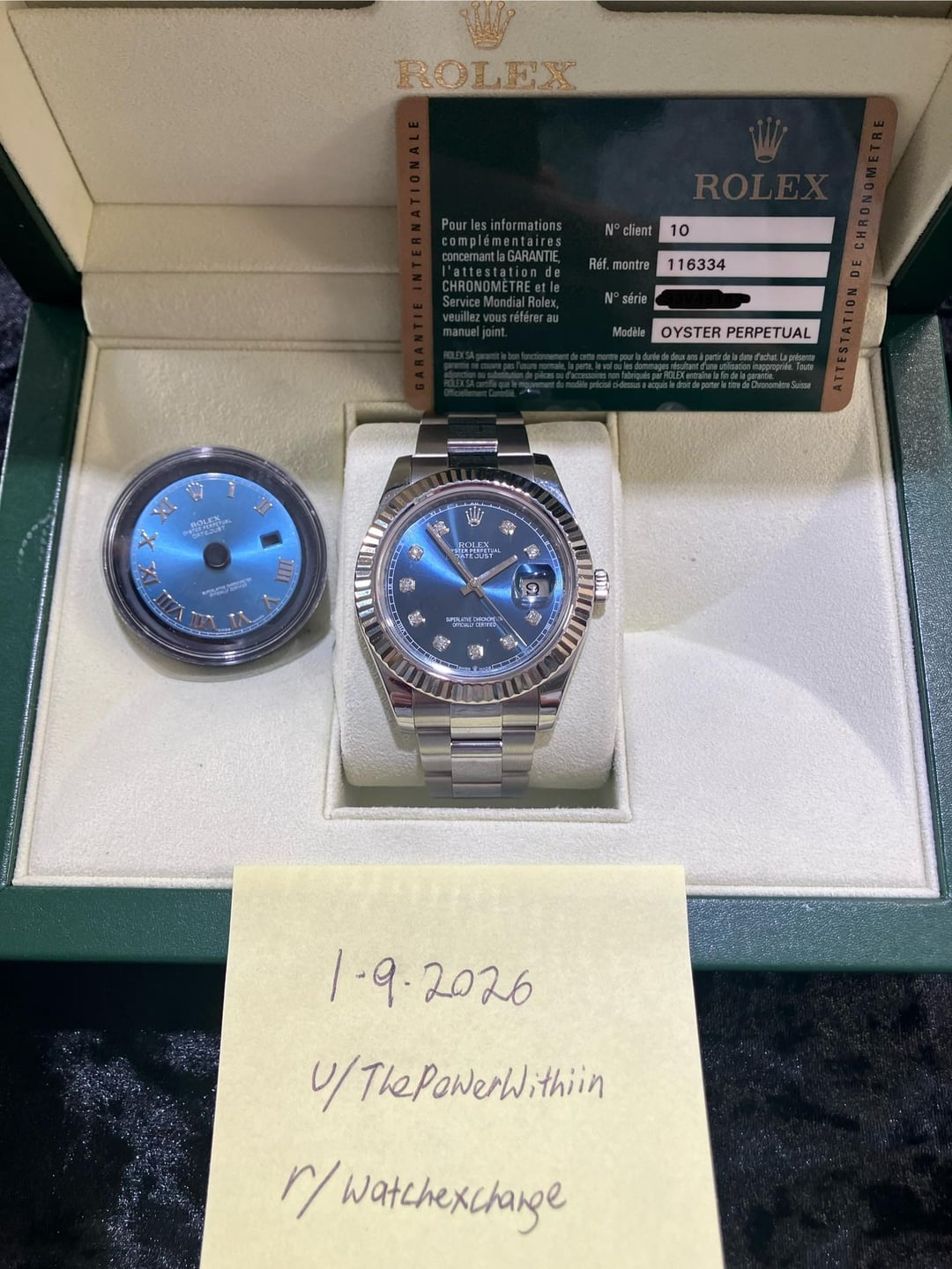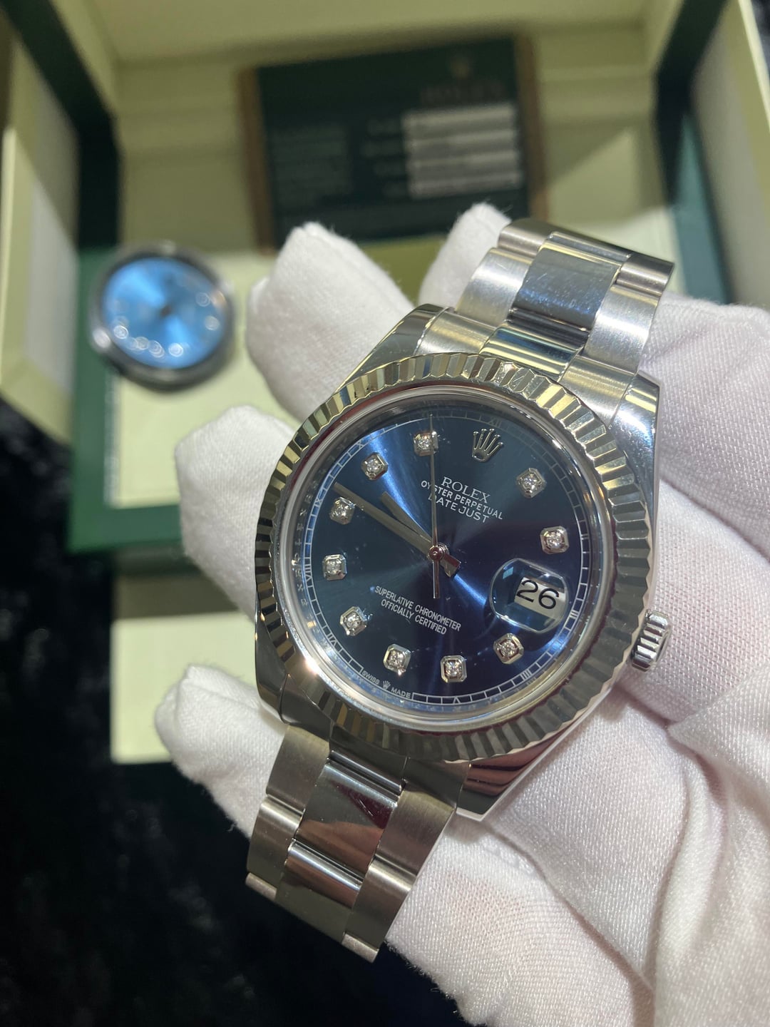 Hello watch exchange, I have a beautiful 116334 Rolex date-just excellent condition Blue dial, white gold fluted bezel 41mm the dial that’s in the watch right now is an aftermarket diamond dial and comes with the original Roman numeral blue dial and the bracelet is original -2 links. The clasp on the bottom with the satin finish is original just had been satin polished, The watch is a 2012 with card and Rolex box. Insured free shipping in U.S Price- $11,000 Payments- Zelle, bank wire Timestamp- https://imgur.com/a/jlURJjU