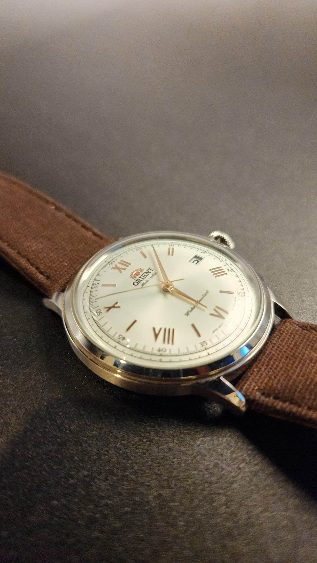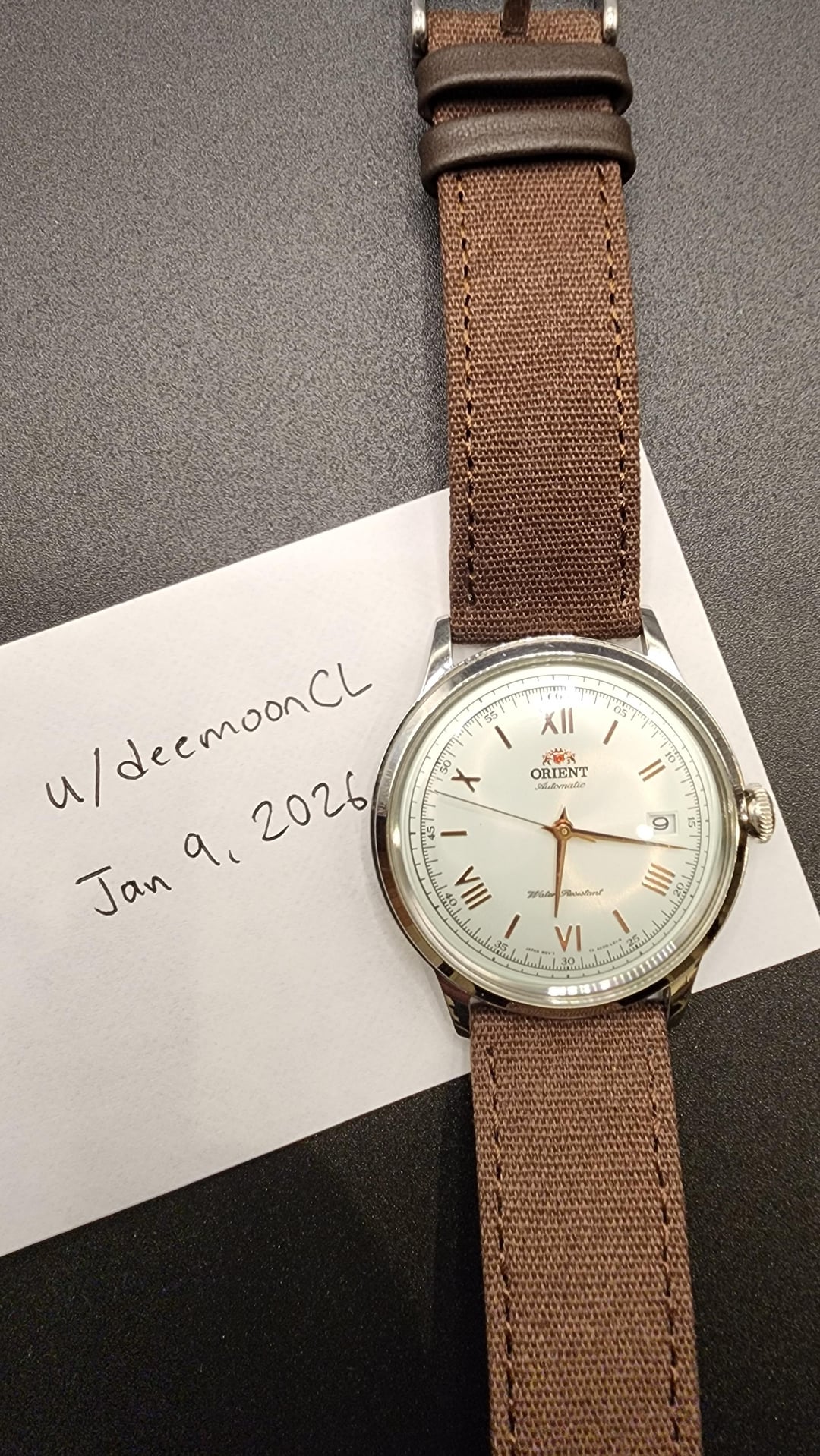 Selling my Orient Bambino version 2 second generation (with hacking seconds) with rose gold indices and hands. The watch itself is in good condition. No scratches to crystal and minor scratches throughout the case. The original strap is very well worn, so I am including a 21mm brown fabric strap that is new. No issues with the movement. This sale is for the watch and two straps. No box or papers. Asking for $160 shipped (or best offer) to CONUS via Zelle, PayPal F&F or Venmo. $165 shipped if using Paypal G&S. I'd be happy to answer any questions or provide more photos/videos. [https://imgur.com/a/7TwujVy](https://imgur.com/a/7TwujVy)