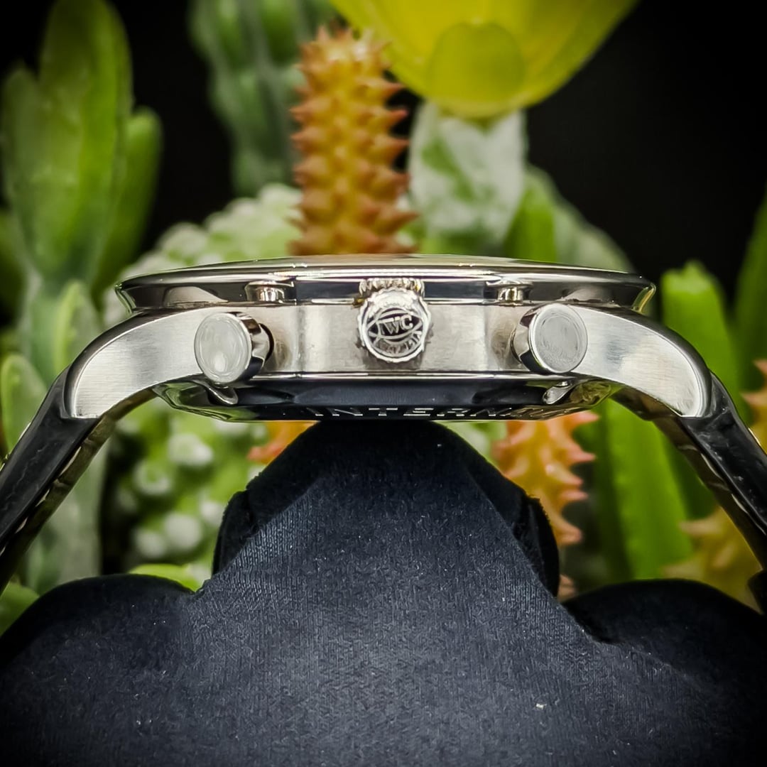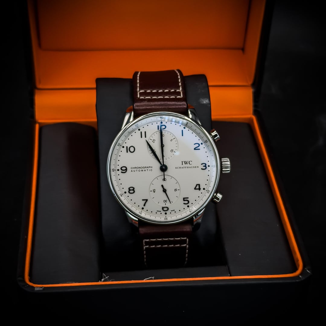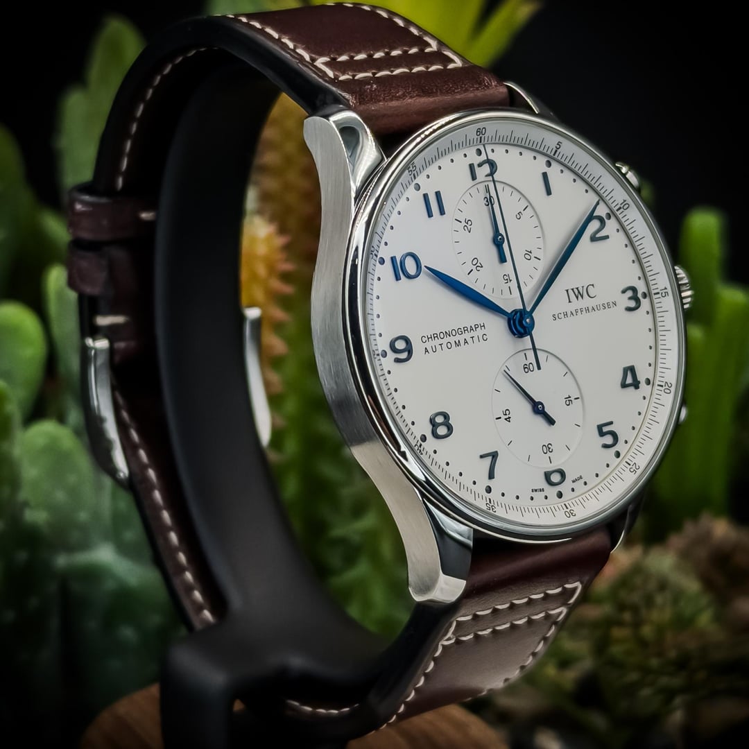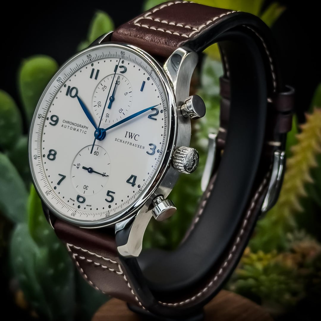 **IWC Portuguese Chronograph White Dial Blue Hands IW371446 Excellent Watch Only + Travel Box** 40.9mm Stainless Steel Case | IWC Caliber 79350 Automatic Chronograph | White Dial with Blue Numerals & Hands | Sapphire Crystal | 30m Water Resistance | Brown Leather Strap with IWC Tang Buckle **Pricing** **Asking: $4100 + ship** **Trades Always Considered** **Description** One of the most elegant and recognizable IWC chronographs ever made, the Portugieser IW371446 features a bright white dial with blue Arabic numerals and heat-blued leaf hands. Powered by the reliable Caliber 79350 automatic movement, this timeless 41mm piece is the perfect balance of dressy and sporty. No box or papers, but in mint condition and running perfectly. **Condition** Excellent Pre-Owned – No notable signs of wear. Dial and crystal are flawless. Case is sharp and strap shows minimal handling. Functions and tests as it should. **Includes** * Watch * OEM Brown Leather Strap * IWC Stainless Steel Tang Buckle * Travel Box **Shipping** Ships from Scottsdale, AZ – Priority Overnight via FedEx **Hundreds of Deals, References, Reviews, etc. Buy with confidence.** **Find me on IG CactusLuxeCollective**