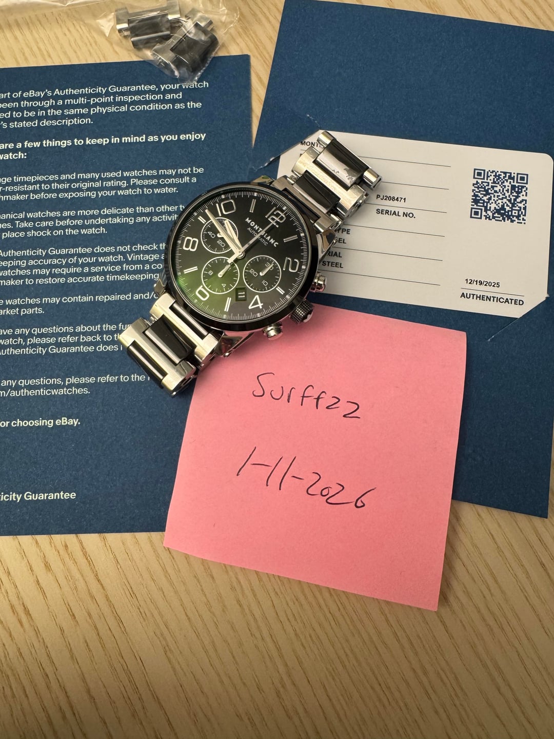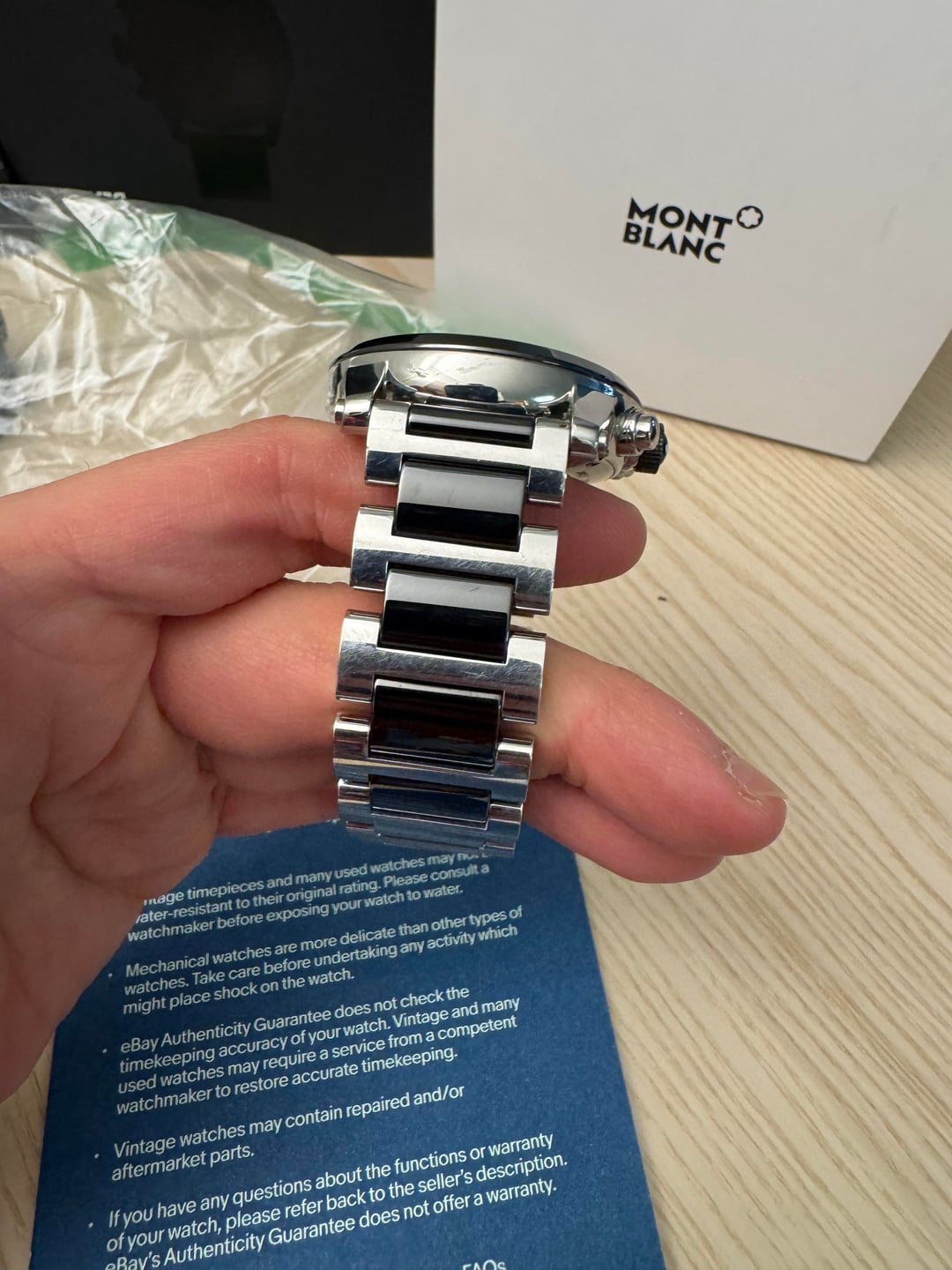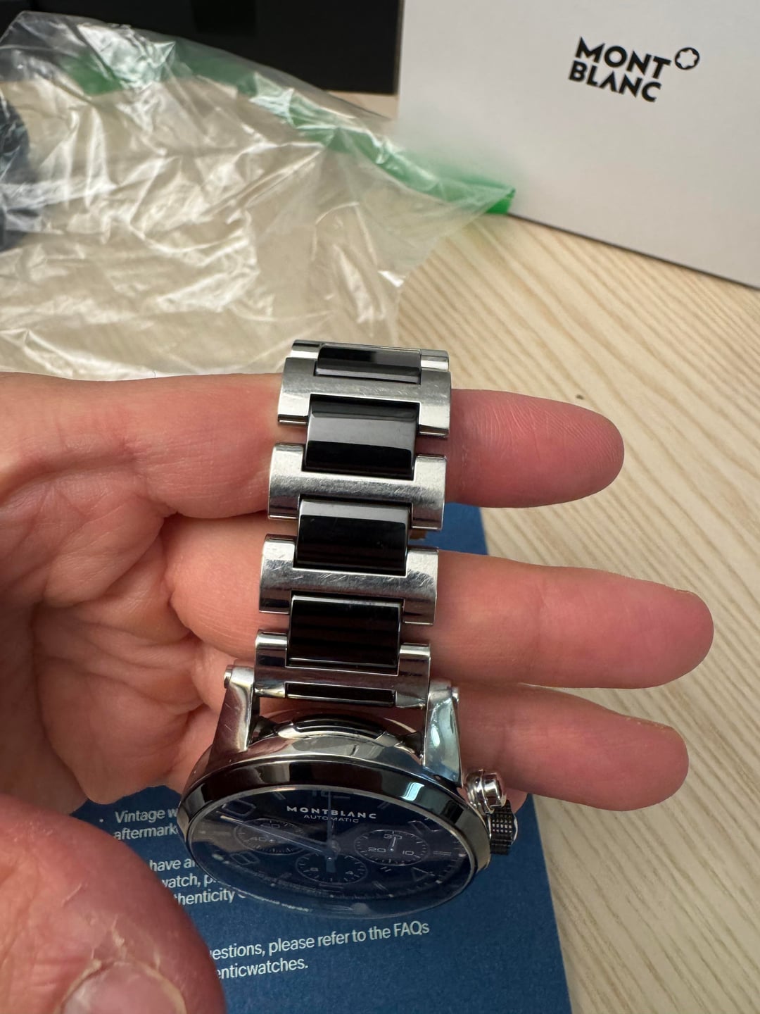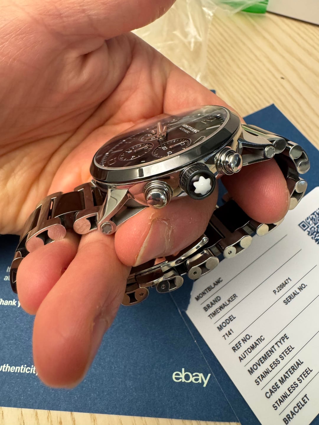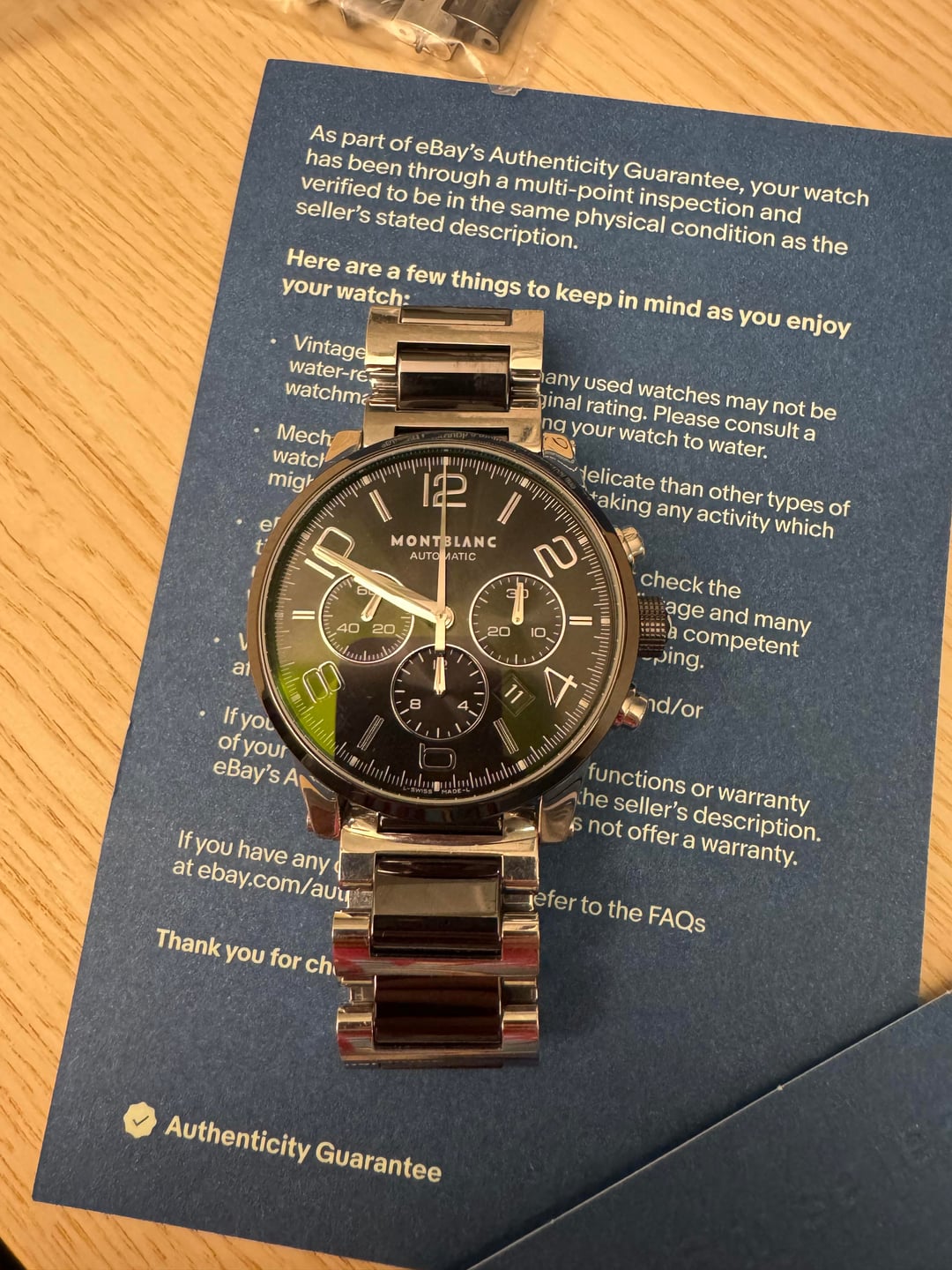 [Album+Timestamp](https://imgur.com/a/wHxMg8X#m7CM0CK) [Video](https://imgur.com/a/7Gr1I3l) I’m offering this Montblanc TimeWalker Automatic Chronograph from my personal collection. The watch is 100% authentic—feel free to check my feedback for peace of mind. Montblanc is part of the Richemont Group, one of the world’s largest luxury conglomerates, also behind IWC, Cartier, Panerai, and Vacheron Constantin. The TimeWalker collection was influenced by Italian designer Giuliano Baldino, whose touch is evident in the bold case design, skeletonized lugs, and refined finishing. Montblanc watches are known for their solid construction, smooth chronograph pushers, and Swiss-made craftsmanship. This piece features a sporty yet refined two-tone ceramic and stainless steel case with a 43mm diameter. Shorter lugs allow for comfortable wear on a variety of wrist sizes, making it suitable for nearly anyone. The automatic chronograph movement is fully functional, and the watch carries a strong wrist presence with excellent build quality. Condition: Good overall. The watch shows normal wear including minor scratches and scuffs consistent with use. Crystal is clean, movement is fully functional, and all features operate as they should. Authentication: It will come with an official eBay Authentication card, confirming the watch has passed a rigorous multi-point inspection and is 100% authentic. Details: • Brand: Montblanc • Model: TimeWalker Automatic Chronograph • Reference: 103094 • Dial: Black (or specify exact color) • Case Size: 43 mm • Case Material: Ceramic & Stainless Steel (Two-Tone) • Movement: Swiss automatic chronograph • Origin: Swiss-made • Warranty: N/A Included: • Montblanc smartwatch box - not original box • eBay Authentication card • extra links Price: $1,300 shipped - prices online for this model are three times as much Payment: Will accept PayPal Friends & Family, Zelle, or Bank Transfer. Serious buyers only. Shipping: USPS Priority