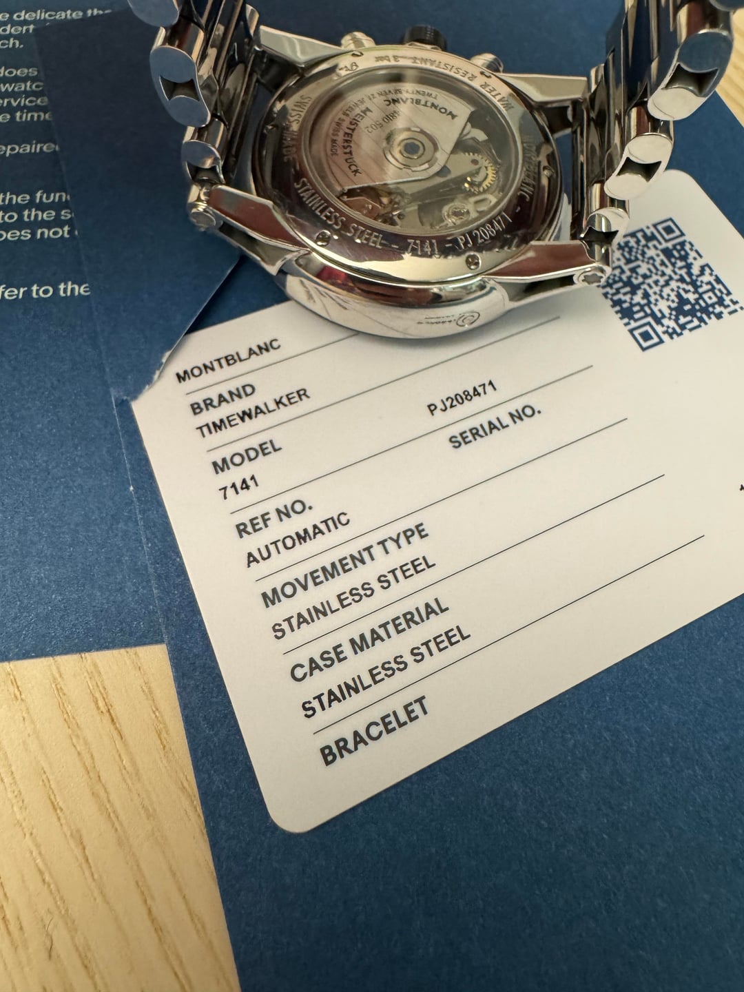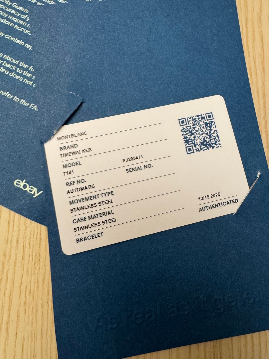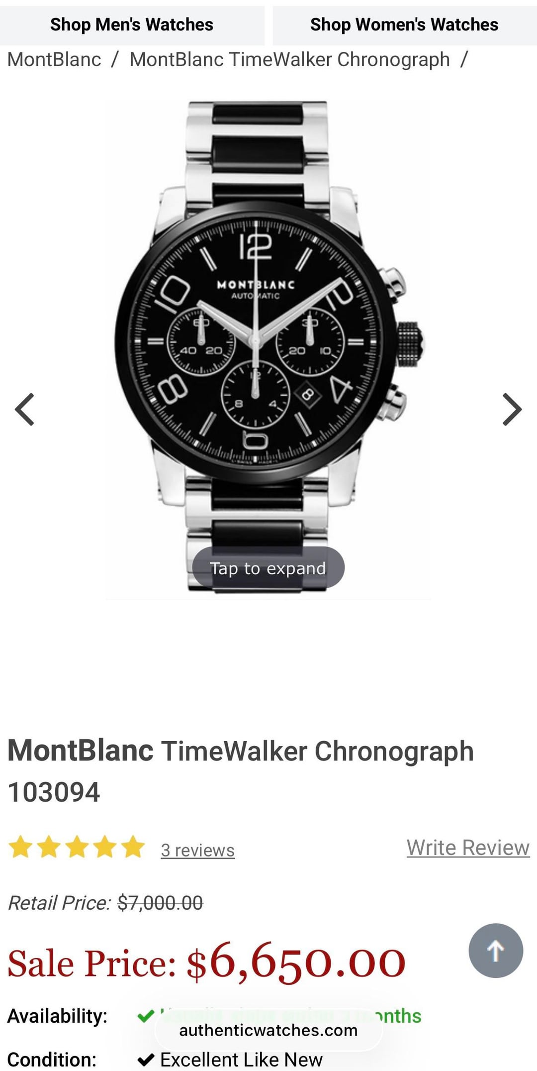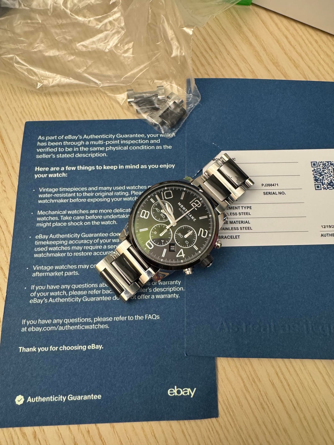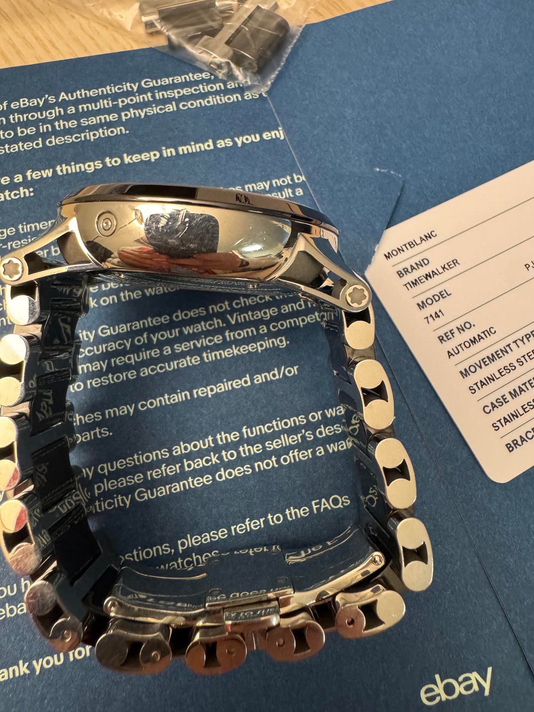 [Album+Timestamp](https://imgur.com/a/wHxMg8X#m7CM0CK) [Video](https://imgur.com/a/7Gr1I3l) I’m offering this Montblanc TimeWalker Automatic Chronograph from my personal collection. The watch is 100% authentic—feel free to check my feedback for peace of mind. Montblanc is part of the Richemont Group, one of the world’s largest luxury conglomerates, also behind IWC, Cartier, Panerai, and Vacheron Constantin. The TimeWalker collection was influenced by Italian designer Giuliano Baldino, whose touch is evident in the bold case design, skeletonized lugs, and refined finishing. Montblanc watches are known for their solid construction, smooth chronograph pushers, and Swiss-made craftsmanship. This piece features a sporty yet refined two-tone ceramic and stainless steel case with a 43mm diameter. Shorter lugs allow for comfortable wear on a variety of wrist sizes, making it suitable for nearly anyone. The automatic chronograph movement is fully functional, and the watch carries a strong wrist presence with excellent build quality. Condition: Good overall. The watch shows normal wear including minor scratches and scuffs consistent with use. Crystal is clean, movement is fully functional, and all features operate as they should. Authentication: It will come with an official eBay Authentication card, confirming the watch has passed a rigorous multi-point inspection and is 100% authentic. Details: • Brand: Montblanc • Model: TimeWalker Automatic Chronograph • Reference: 103094 • Dial: Black (or specify exact color) • Case Size: 43 mm • Case Material: Ceramic & Stainless Steel (Two-Tone) • Movement: Swiss automatic chronograph • Origin: Swiss-made • Warranty: N/A Included: • Montblanc smartwatch box - not original box • eBay Authentication card • extra links Price: $1,300 shipped - prices online for this model are three times as much Payment: Will accept PayPal Friends & Family, Zelle, or Bank Transfer. Serious buyers only. Shipping: USPS Priority