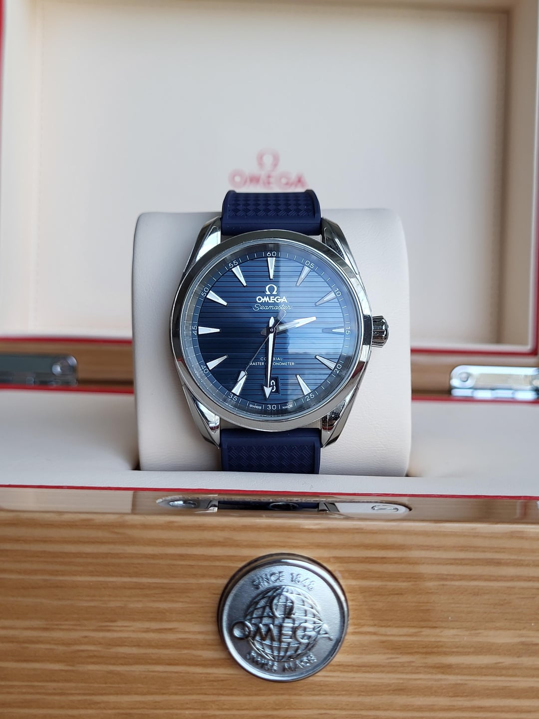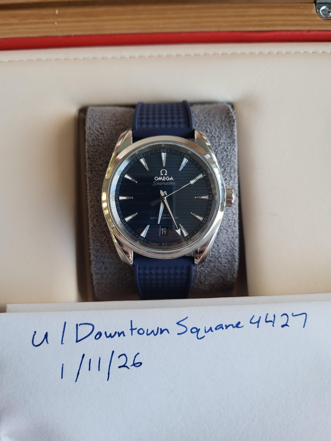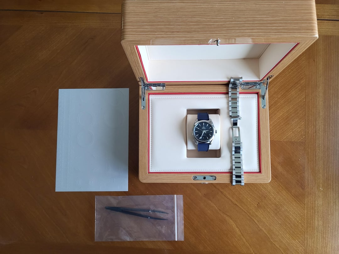 Hi Watchexchange, today I've decided to put my beautiful Omega Aqua Terra 38mm up for sale. It is well taken care of and in good pre-owned condition. So much that it has the Aqua Terra 38mm Watch Protection Film on it which I've took the time to apply and also on half of it's metal bracelet. The film adds a layer of scratch protection on the watch similar to PPF on a vehicle. Minor small lug change marks from strap changes. It is currently on a new sleek blue StrapsCo rubber strap sized at 6.75in. Comes Full Set - Inner and Outter Box, cards, tag, OEM bracelet, another set of WatchShell film and tweezers. Located in MA and can meet local. Price - $4,250 Shipped Accepted payments - Bank Wire, Zelle Thank you!