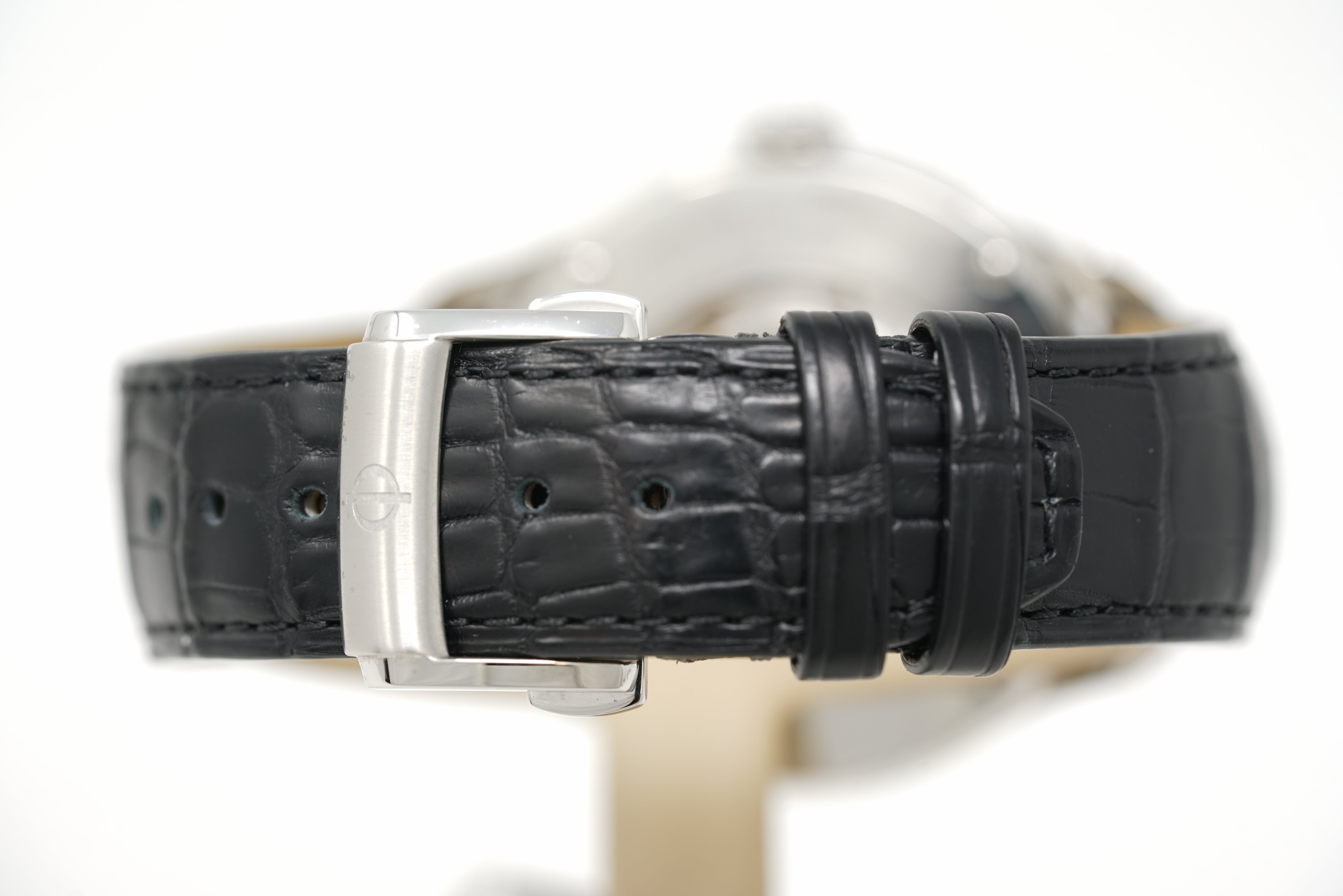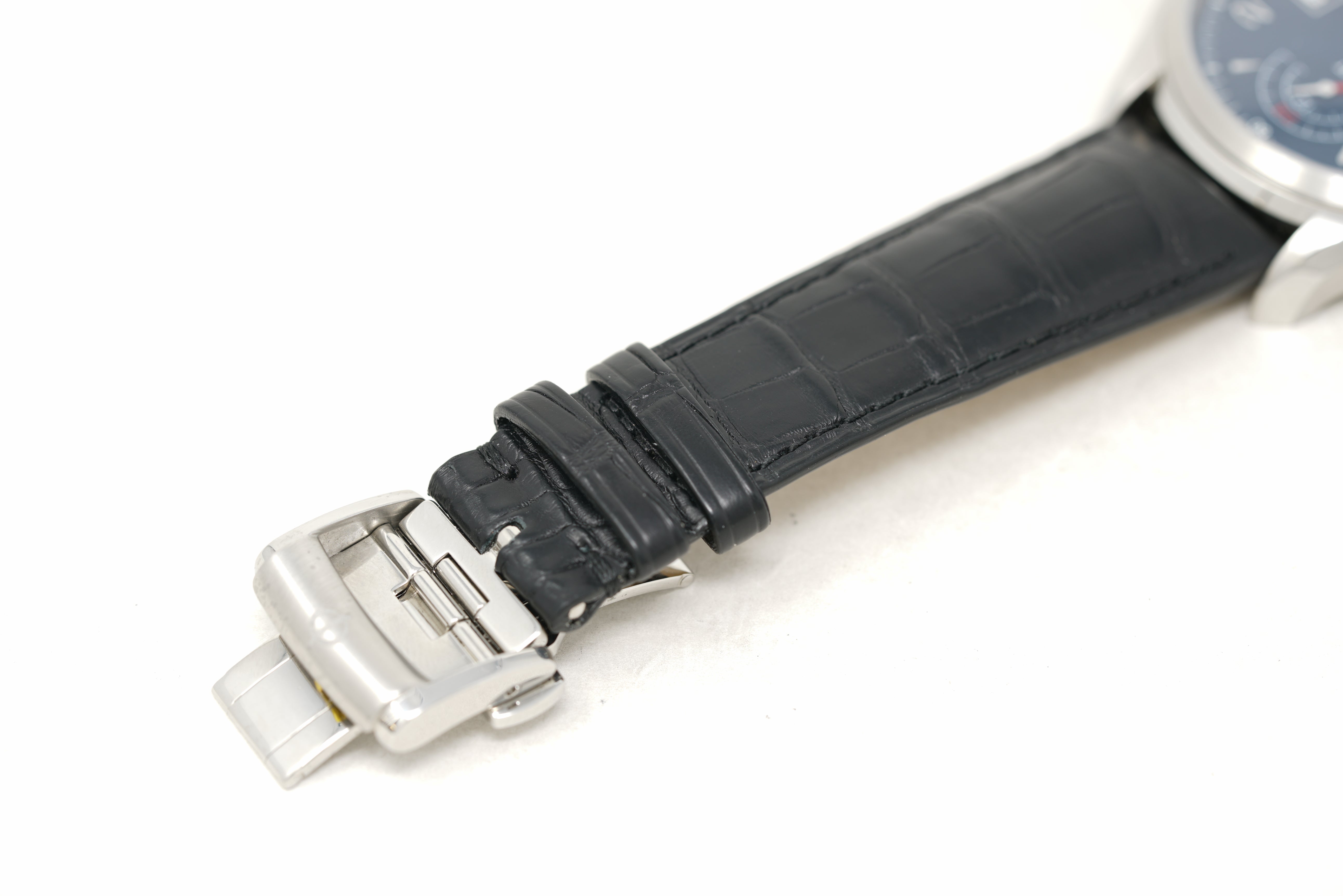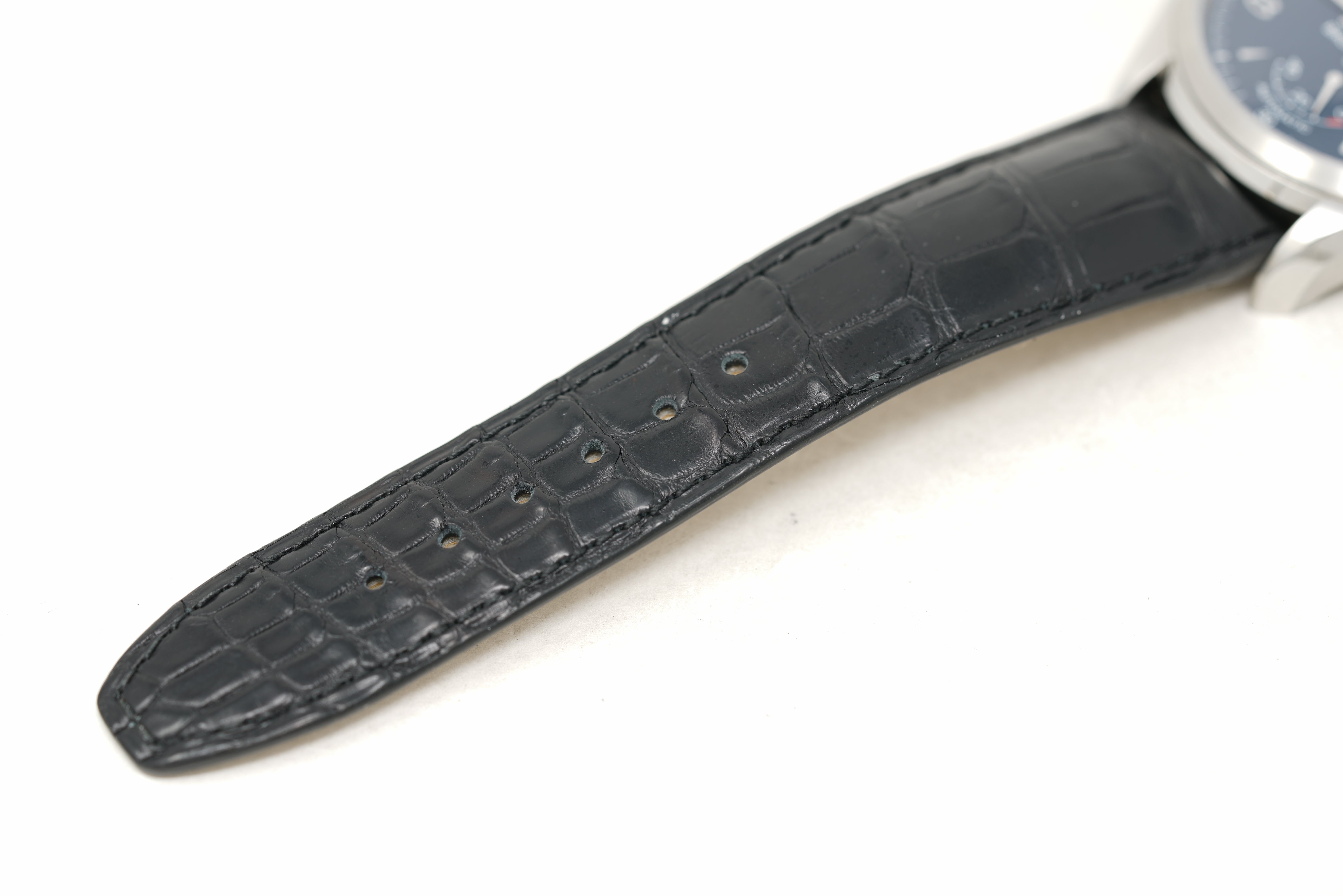 This pre-owned watch is in 84% condition due to slight marks on the crystal, lugs (specifically a nick on the 1 o'clock lug), bezel, and throughout the case. The strap is in 92% condition due to slight creasing and marks on the clasp. This watch comes with its inner and outer box, instruction manual, and the one-year Topper Pre-Owned Select warranty.