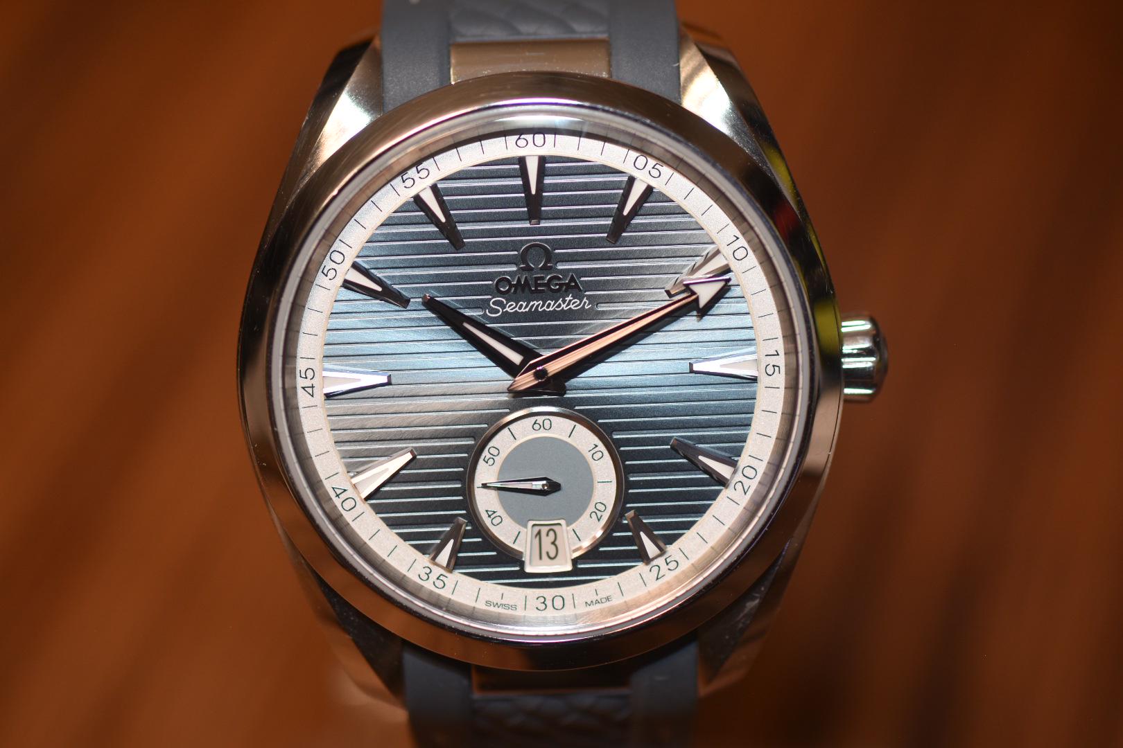 \[WTS\] Omega Seamaster Aqua Terra 150M Small Seconds 41mm - Blue/Grey Dial - Ref 220.12.41.21.03.005 Up for sale is the Omega Seamaster Aqua Terra 150M Small Seconds in 41mm. This stunning piece features a sun-brushed blue-grey dial with the signature horizontal "Teak" pattern, a small seconds sub-dial, and a date window at 6 o'clock. The watch is powered by the Omega Co-Axial Master Chronometer Calibre 8916, which is METAS certified and visible through the sapphire exhibition caseback. # Condition The watch is in **good pre-owned condition**. There are visible surface scratches and "desk diving" marks on the polished bezel and the polished portions of the lugs (please see high-resolution photos for detail). These are cosmetic and consistent with regular wear. The sapphire crystal is clean. The integrated blue rubber strap is in excellent shape, and the fold-over clasp functions perfectly. # Specs * **Reference:** 220.12.41.21.03.005 * **Case Diameter:** 41mm * **Lug-to-Lug:** 47.9mm * **Thickness:** 13.2mm * **Movement:** Omega Calibre 8916 (70-hour power reserve) * **Water Resistance:** 150m * **Strap:** Blue rubber with grey stitching # Includes * Omega inner wooden presentation box * Omega outer white box and sleeve * Omega operating manual * Warranty, Pictogram and Master Chronometer Cards **Price: $4,250** **Shipping:** Price includes fully insured UPS 2nd Day Air shipping within the CONUS. **Payment:** PayPal F&F preferred. PayPal G&S accepted for buyers with established references (please add 3.5% for fees). **Album & Timestamp:** [https://imgur.com/a/Ejo4RPV](https://imgur.com/a/Ejo4RPV)