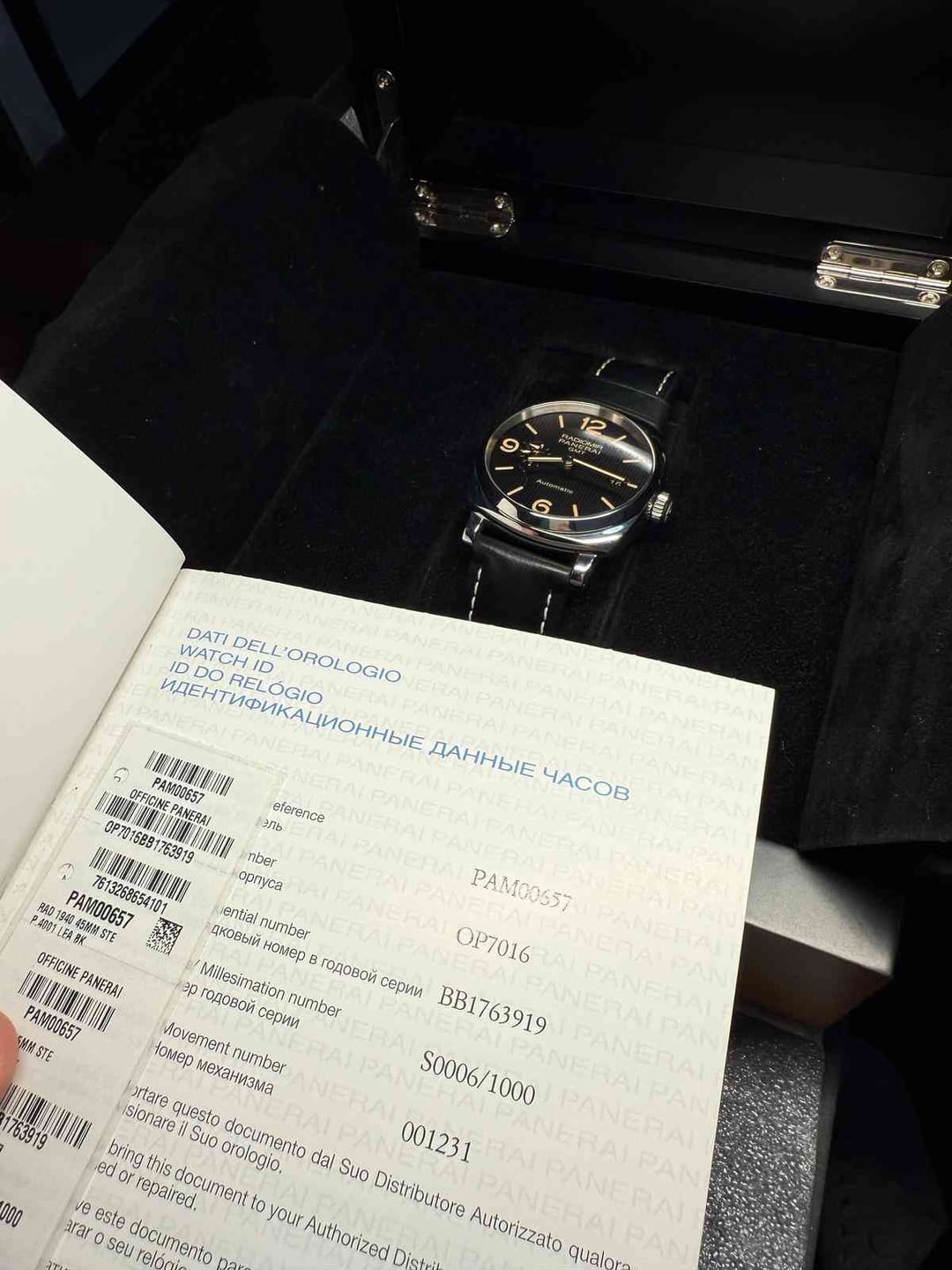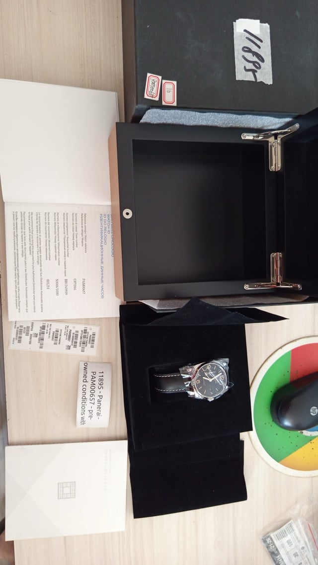 # [WTS] 11895 - Panerai - PAM00657 - pre-owned conditions with MINOR signs of usage - Card & Box - $5600 Time stamp: [https://imgur.com/a/Y1aafo5](https://imgur.com/a/Y1aafo5) Shipping and duties covered for Usa and Europe. Payment methods: Wire/Zelle