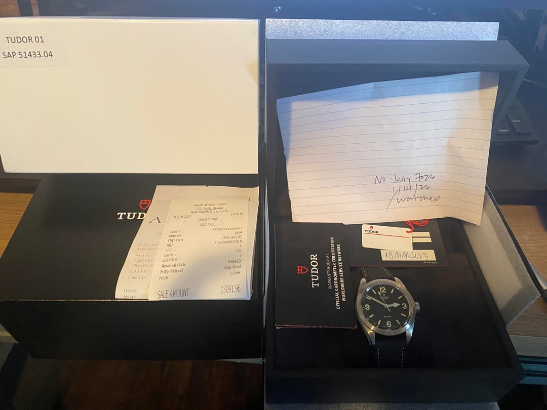 Hi watchex, I am selling my 2023 Tudor Ranger 39mm on the OEM rubber leather hybrid strap. Style#: M79950-0002 I am the first and original owner. Purchased in March of 2023 from New Orleans, LA. It will include the full set, which includes: Outer and inner box, original tags, partial back sticker, and warranty card dated March 2023. Crystal has no scratches; lugs on the back have some markings from strap changes and there is small mark on the lower left front lug. The metal clasp on the bracelet has some desk diving marks. I tried to show these in the pictures. The watch has never been serviced and worn in a rotation of other watches. I have never timed it but I've had no issues. I go through watches very frequently and this one isn't being worn that much. It's a great daily piece. Asking $1940, firm, shipped, via FedEx insured 2 day. Payment can be made via Zelle, Cash app or PayPal FF. Will consider trades provided it's not Seiko or vintage pieces 😂 Also will throw in this Tudor Hat I got as a gift. Never worn. Please ask questions - thanks for looking!