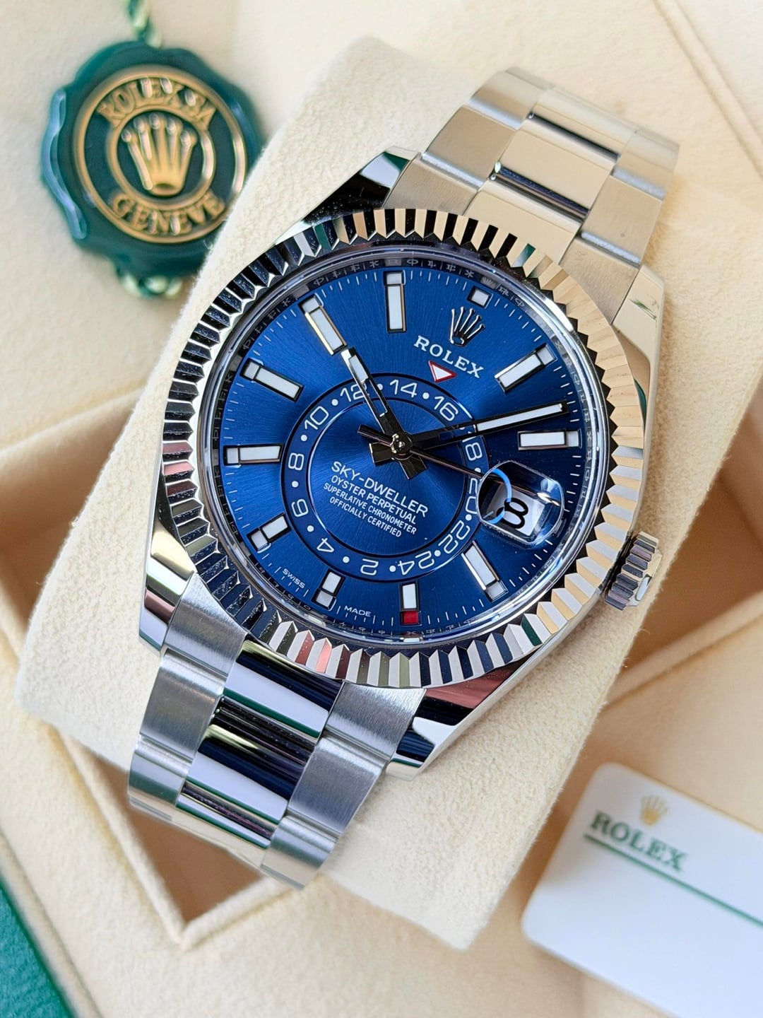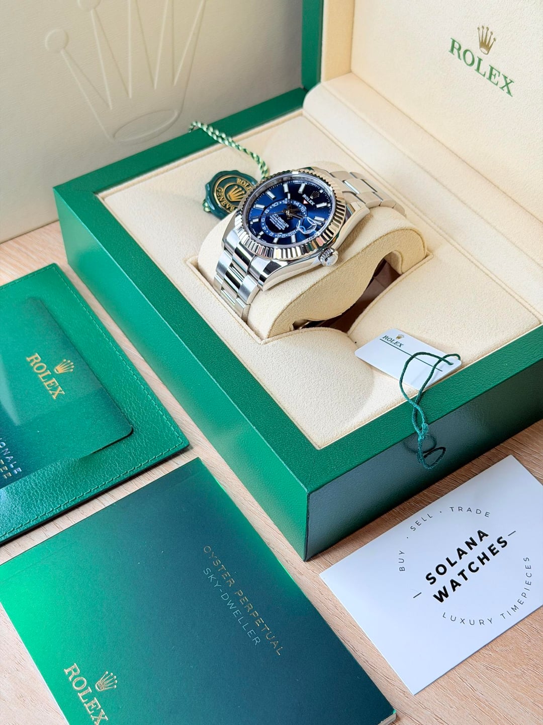 Selling this beautiful 42mm Rolex Sky Dweller reference 326934 with the blue dial on oyster bracelet.   **It** **comes as a full set**, including the Rolex green box, outer box, booklet, warranty booklet, leather wallet, warranty card dated 2022, serialized hangtag, and the green seal.    **This watch is in like-new condition**.   **Photos:** * [Album](https://imgur.com/a/2022-sky-dweller-jan26-lMx3OZ7)  * [Timestamp](https://i.imgur.com/ewEdZKY.jpeg) * [More on my Instagram @SolanaWatches](https://www.instagram.com/solanawatches/)   **Price is $20,500** shipped in the US.   **I’m a full-time watch dealer** with a private showroom located in Carlsbad, CA. Feel free to **Google “Solana Watches reviews” to see what others have to say about me** and my services. If you are local, don’t hesitate to reach out to schedule an appointment.    **Feel free to contact me** via PM here so we can exchange numbers and get on the phone or do a video call.   You can also [find me on Instagram @SolanaWatches](https://www.instagram.com/solanawatches/).   _Private showroom located in San Diego, CA. Reach out to schedule an appointment._   _All my watches are guaranteed 100% authentic, and I will stand by their authenticity. _   _California buyers without a seller’s permit are subject to sales tax._