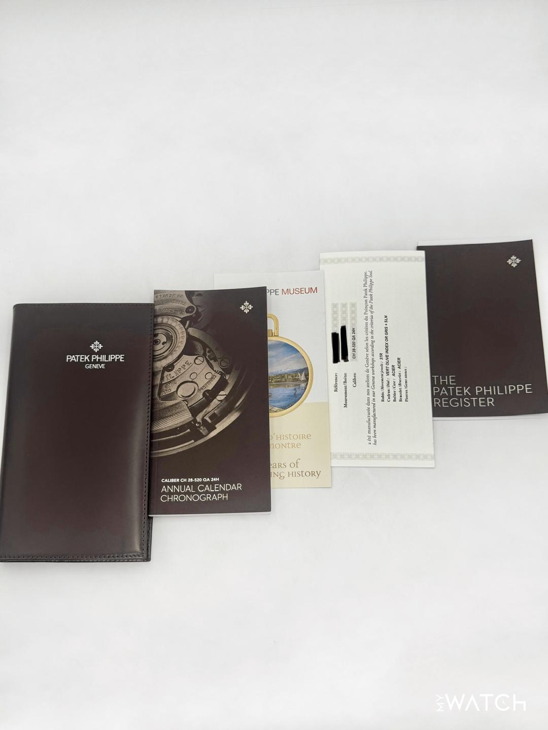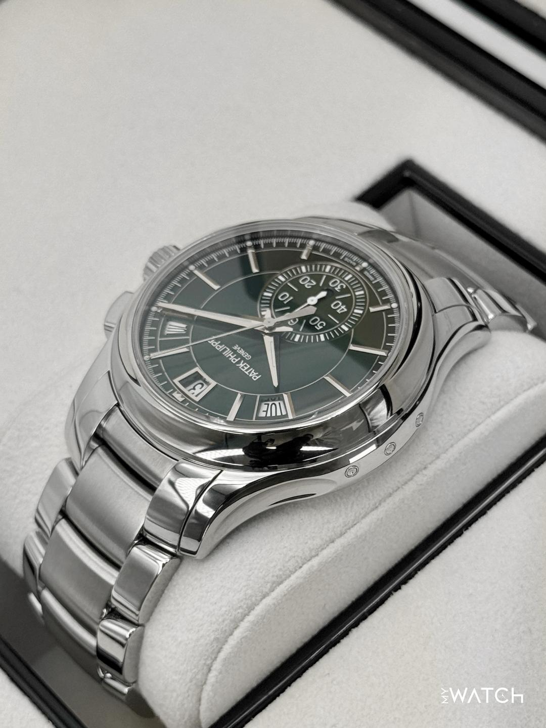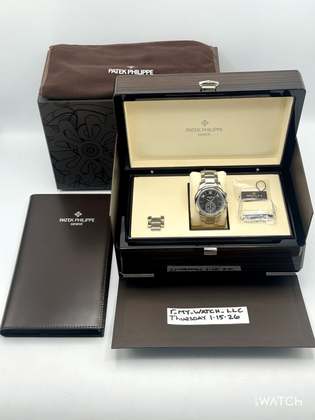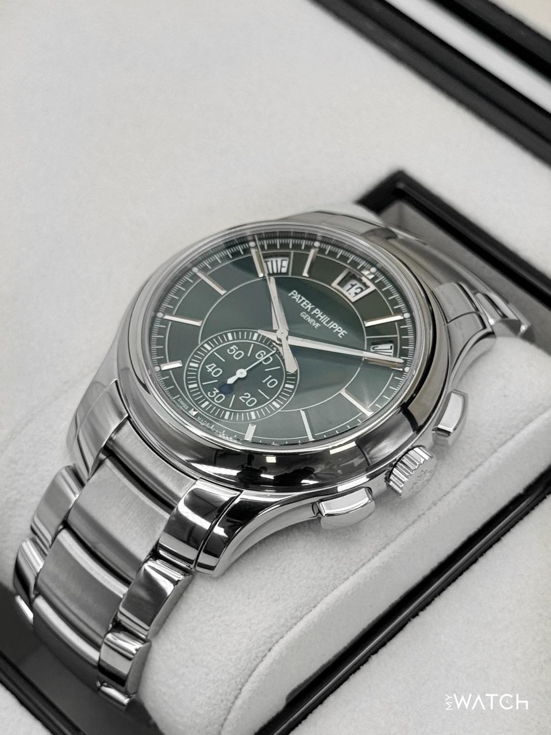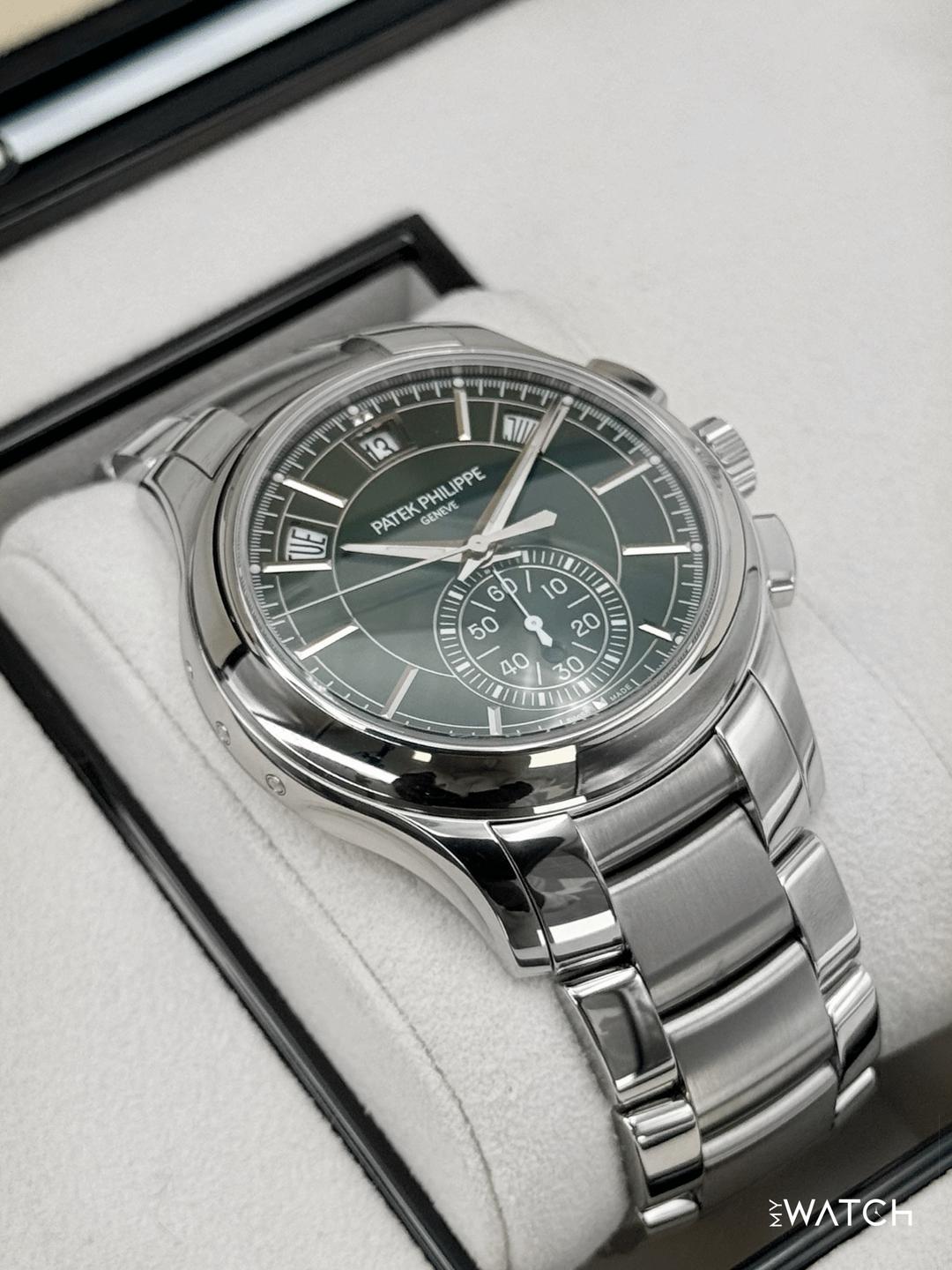 🔵**2023 Patek Philippe Annual Calendar Complications 42mm 5905/1A-001 Stainless Steel Olive Green Sunburst Dial** 🔵**TRADE or SELL us your luxury watch, all brands considered. Message me details.** **Includes the following:** **✔️Original Patek Philippe Double boxed** **✔️Box and Papers - Yes** **✔️Warranty papers dated January 2023** **✔️Original 5 Year manufacturer warranty included** **✔️Manual and Register booklets** **✔️Patek Philippe Museum Booklet** **✔️Pusher Tool and Hang Tag** **✔️Size: 7.75in (Full Links)** **✔️Watch is in excellent overall condition. Please see photos for details.** **✔️**[**Trades**](https://mywatchllc.com/pages/sell-rolex-watch) **welcome** Business Name: **My Watch LLC** LOCATION: Oak Park, Michigan ✔️[MyWatchLLC.com](http://mywatchllc.com/) for current inventory ✔️Google Business Listing [https://g.co/kgs/Cmd6FPW](https://g.co/kgs/Cmd6FPW) ✔️Business Hours M-F 9-6 ✔️Facetime/Video chat/calls welcome to view the watch interested. ✔️Contact: 248-422-0909 via text or call for quickest response. 🟢TERMS: Visit [MyWatchLLC.Com](http://mywatchllc.com/) for payments accepted 🟢REFERENCES/REVIEWS: We are well reviewed on all platforms from google, trust pilot, rolexforums, additionally we have 300+ reference in multiple FaceBook watch groups, reference checks welcome. 🟢SHIPPING: If you are not local, we offer Fully Insured FedEx overnight shipping in the USA for a fee. International shipping available. [https://mywatchllc.com/products/2023-patek-philippe-flyback-chronograph-annual-calendar-5905-1a-olive-green-dial](https://mywatchllc.com/products/2023-patek-philippe-flyback-chronograph-annual-calendar-5905-1a-olive-green-dial)