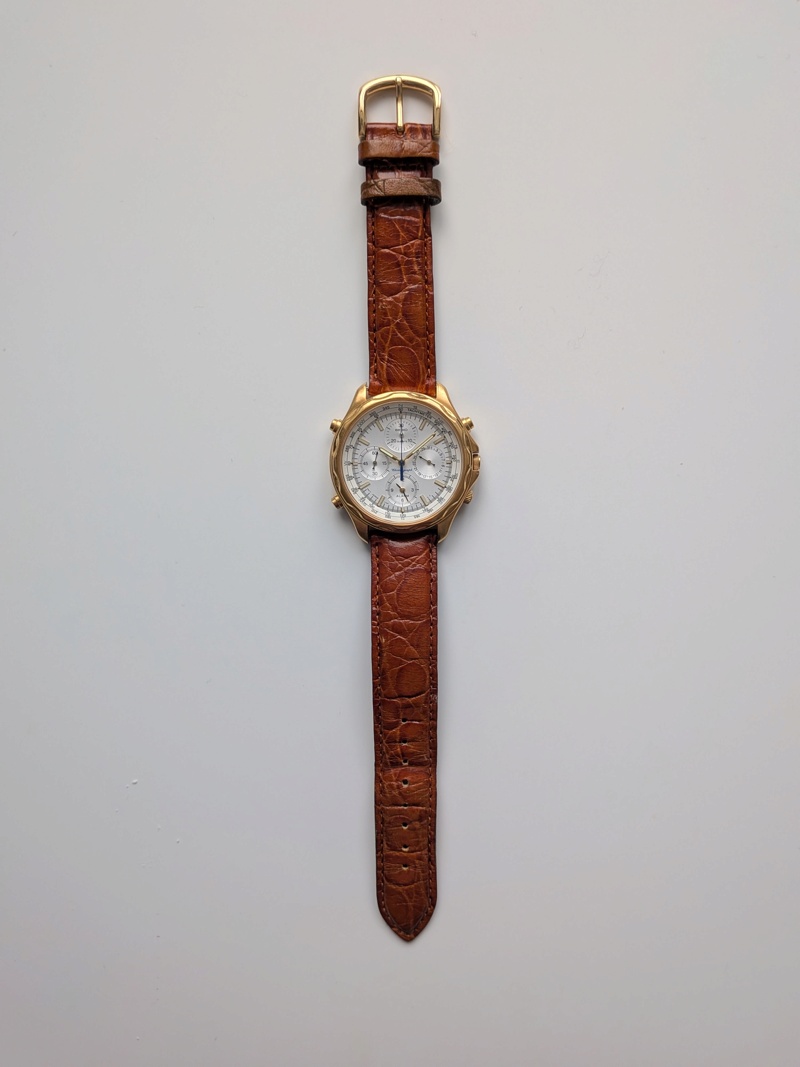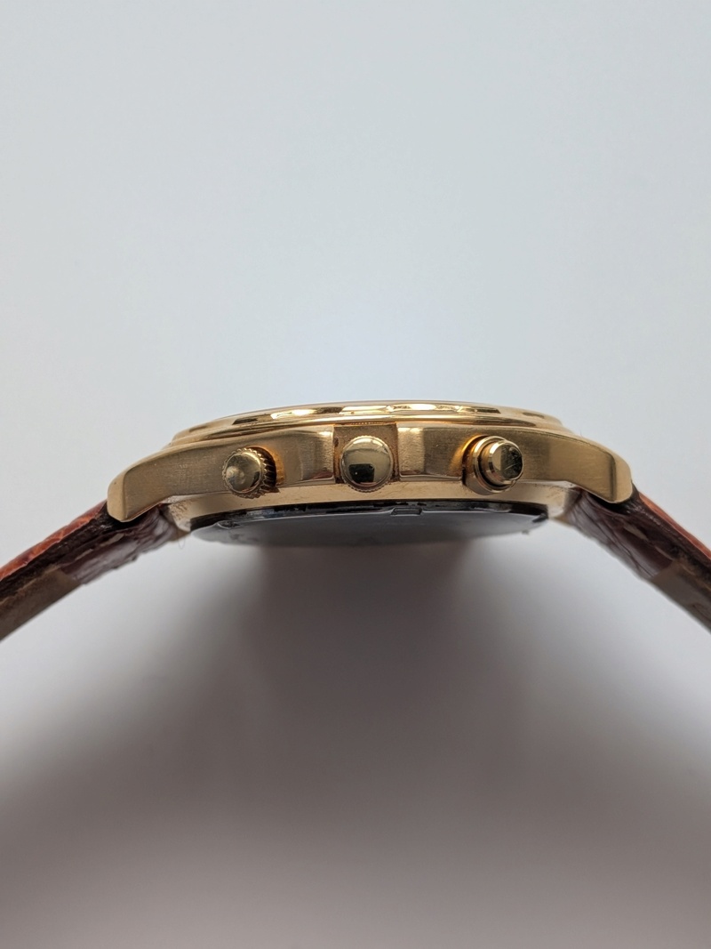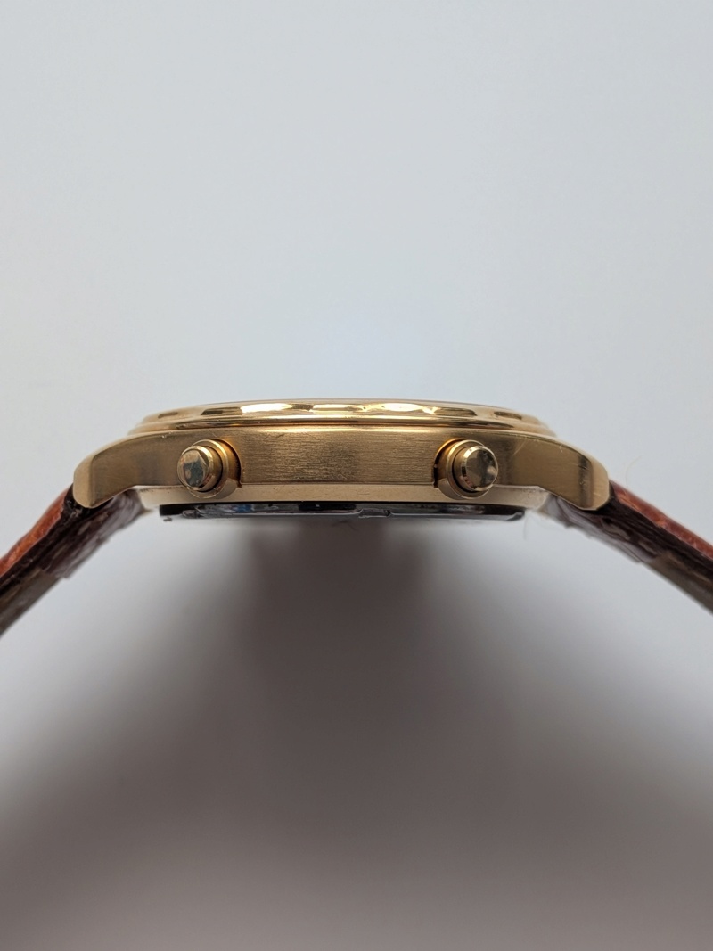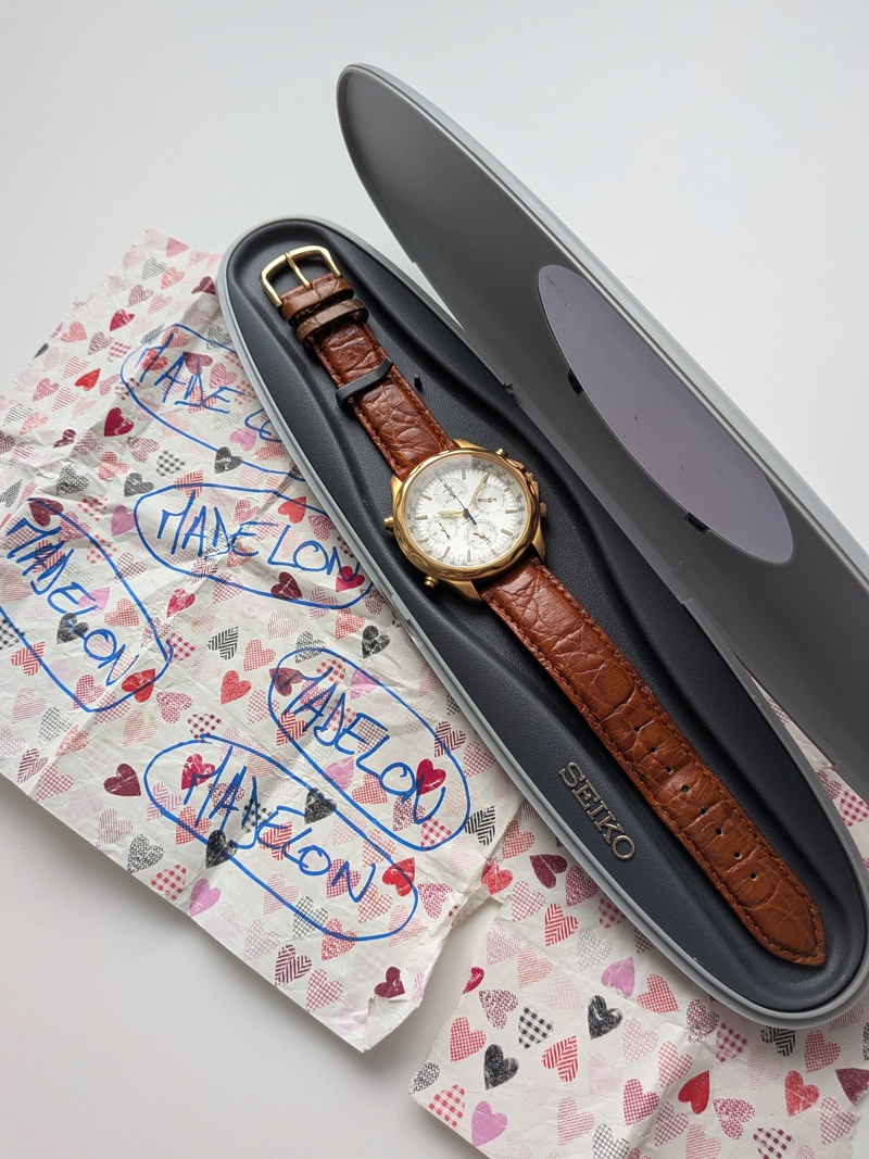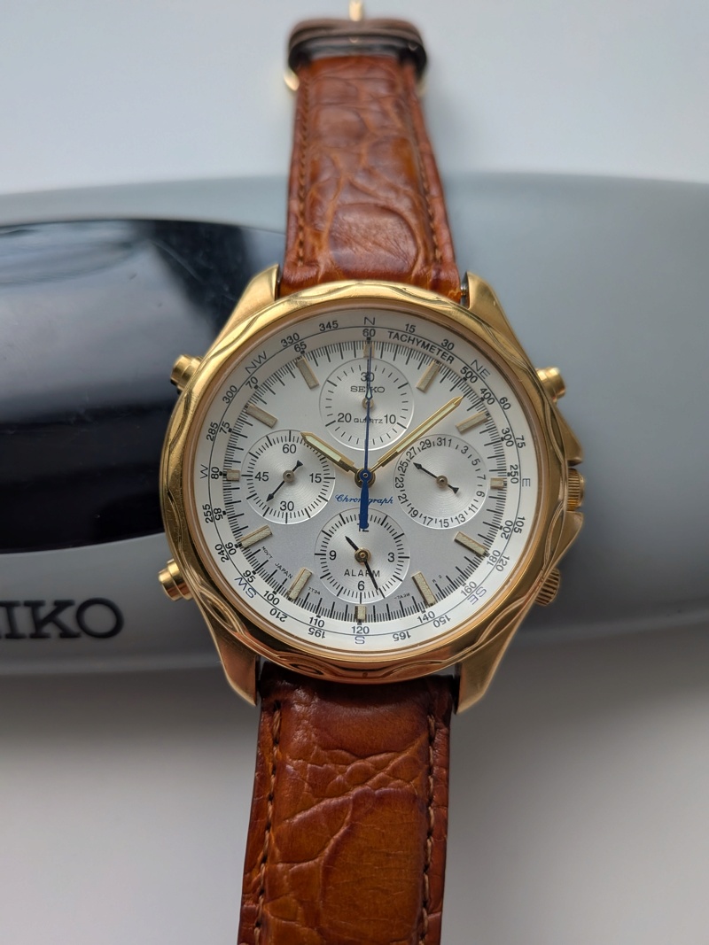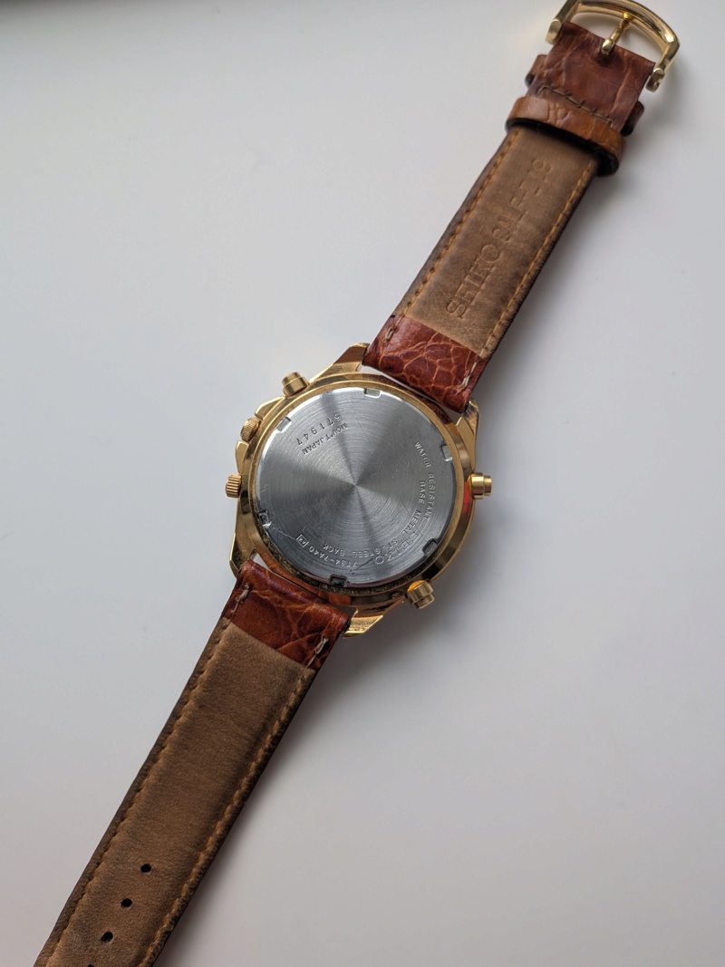 Je propose à la vente cette Seiko 7T34-7A40 de 1996. La montre est en excellent état (cf photo), le plaquage est en parfaite condition, tout comme le cadran, les aiguilles et le verre.