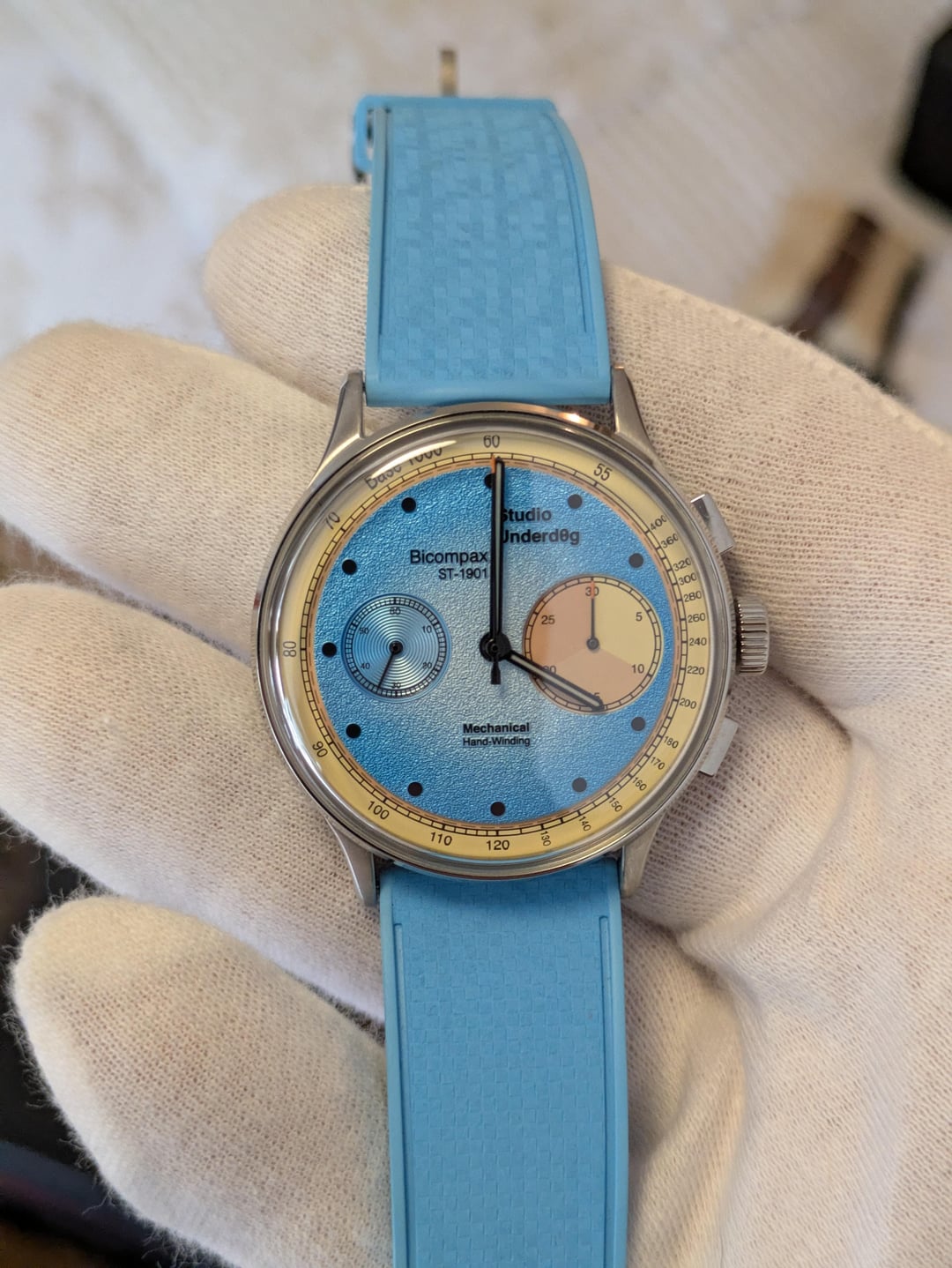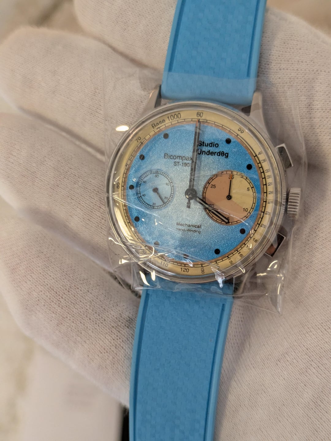 The Studio Underd0g Desert Sky dial dial is SO great, plays in light much better than pictures show. It wears comfortably, feels thoughtfully balanced on the wrist, and genuinely stands out without trying too hard. This one has been worn twice, kept in perfect condition, and presents as-new. Shown on a blue rubber strap. Stock strap is included and **unworn**. Studio Underdog as a brand has built a reputation for playful design, sharp mechanical execution, and limited releases that actually feel creative. They focus on small-batch production with attention to detail that punches far above their price point. The Desert Sky is one of their most popular colorways. It's fun, fresh, and totally distinct from anything else on the market. This sale includes the **full complete set** with the original **Studio Underdog strap** that’s never been worn (see pictures) plus a blue rubber strap as shown in the pictures. Series 01 Gen 3 Desert Sky 📜 Includes: Original box, pouch, and papers 💵 Price: $750 shipped Fedex 2day air 📍 Location: San Diego 🔒 Authenticity: 100% guaranteed 📦 Domestic Shipping (CONUS) preferred 🌍 International Shipping: Can be negotiated, you pay the cost 💳 Payment: Paypal F&F, Venmo or Face-to-face deal in San Diego Studio Underdog (for searches that are mispelled) I have excellent ratings here on Reddit and can provide additional references at your request. Happy to facetime and show the watch. Please PM me with any questions or additional picture requests. Thanks all!