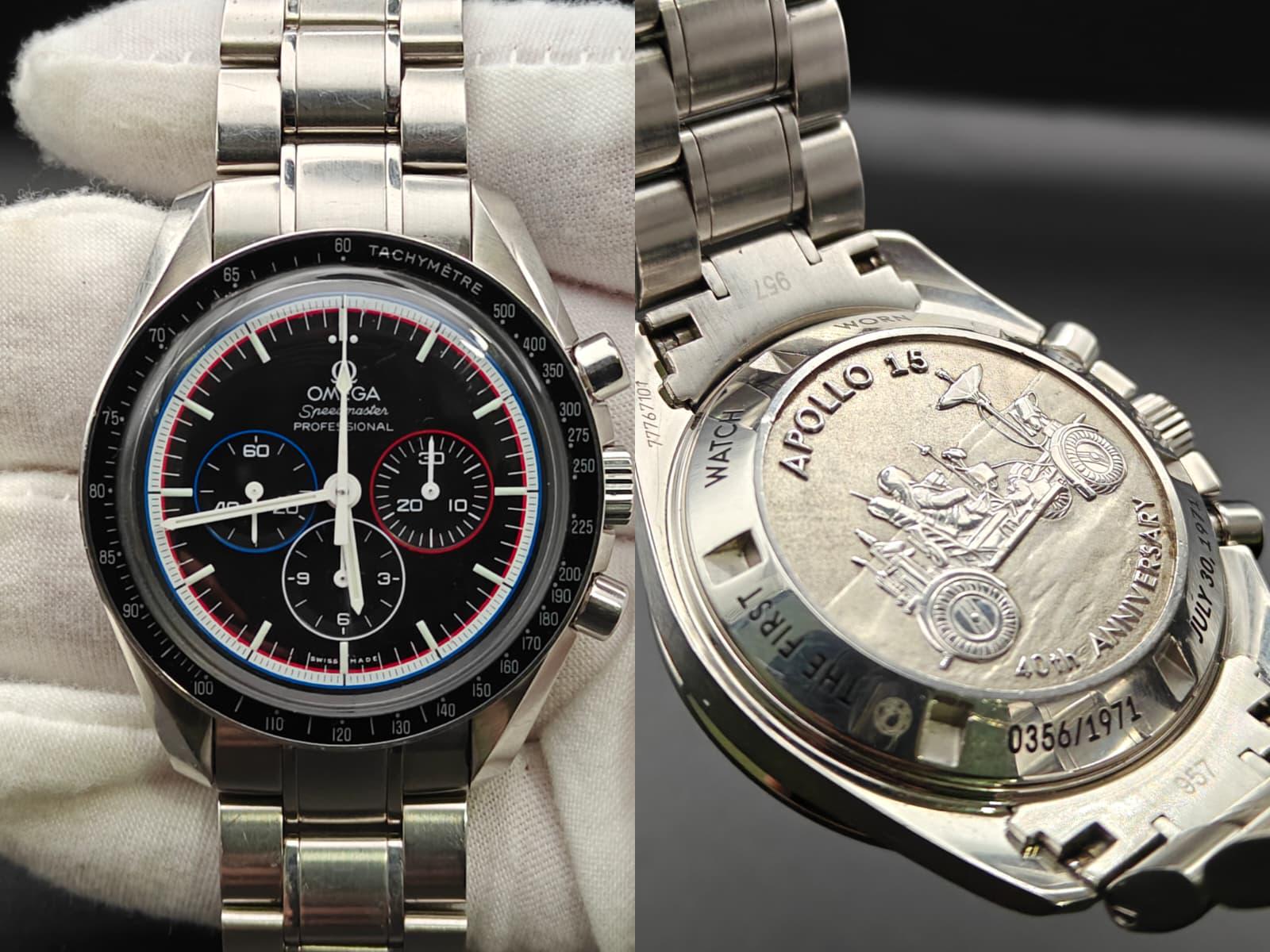 # Omega. 311.30.42.30.01.003. 42mm Info about the watch: A Moonwatch stand out from the rest. Look closely around the seconds track and you'll notice concentric rings of red, white, and blue. Those are the colors of the very nation that put a man on the Moon, and in turn, made the Moonwatch famous. This watch celebrates Apollo 15, a NASA mission that took place from Jul 26, 1971 – Aug 7, 1971. It was the fourth mission to land on the moon. It was the first time the Lunar Rover was deployed to cruise around the surface of the moon, and that scene is depicted on the caseback of the watch. Dial: Black with Blue and Red Accents. Condition: Good condition (7.5/10) - slight mark at the 12 to 1 area. Bracelet: Comes with OEM Bracelet - can fit 7.5inch hand Comes with watch only! This one is thousands below comps! Should be a quick steal for someone here! Price: $5350 plus shipping from PA, USA Can do PayPal FnF, Zelle and Wire! Follow me on Instagram and Reddit for free shipping CONUS! Album and Timestamp: [https://imgur.com/a/641XDlt](https://imgur.com/a/641XDlt) Instagram: [https://www.instagram.com/thelastsecondbyom](https://www.instagram.com/thelastsecondbyom) Thank you
