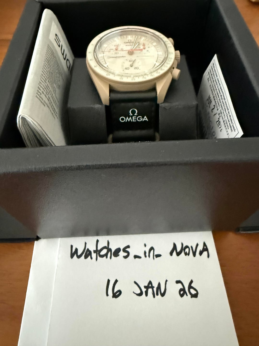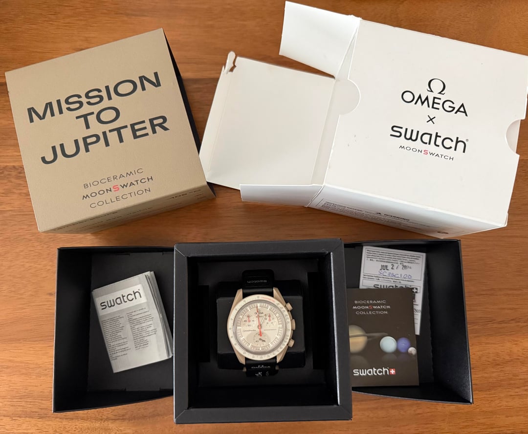 [WTS] Moonswatch Mission to Jupiter – $200 For sale: Moonswatch Mission to Jupiter (2024) Reference: SO33C100 Condition: Pre-owned / Great condition — Worn for a month+ back in 2024 and since then it’s sat in my watch case. Battery replaced last month. Crystal is clean with no visible scratches or marks that I could find. Back of case has light markings from wear. Original Velcro scrap was worn from the store and then replaced by an aftermarket strap. Location: Washington DC Metro USA Price: $200 Payment: Venmo, PayPal F&F / G&S (buyer must account for fee), or Zelle Shipping: +$10 USPS insured + tracked. CONUS only unless discussed. What You Get (Full Kit): - Full Kit w/ original boxes and paper - Warranty card - Receipts - AD purchase provenance from the Swatch store in Time Square - NYC Seller Notes Selling to consolidate. Happy to conduct a FaceTime call to provide video, close-ups, and any angle you need. Admittedly, I haven’t sold a watch on Reddit before but I have a stellar Facebook Marketplace profile (5.0 - 79 ratings) from selling a plethora of high value cycling related items. Additionally, if in the Northern Virginia / National Capital Region, I’m also happy to meet up in person.