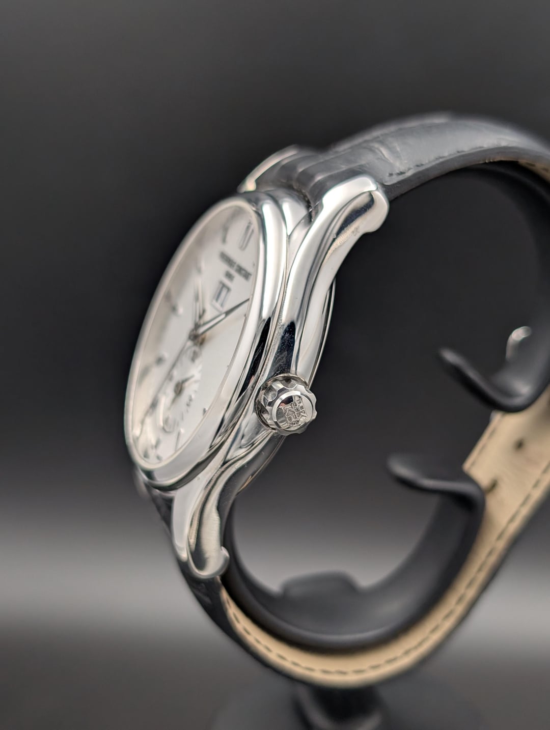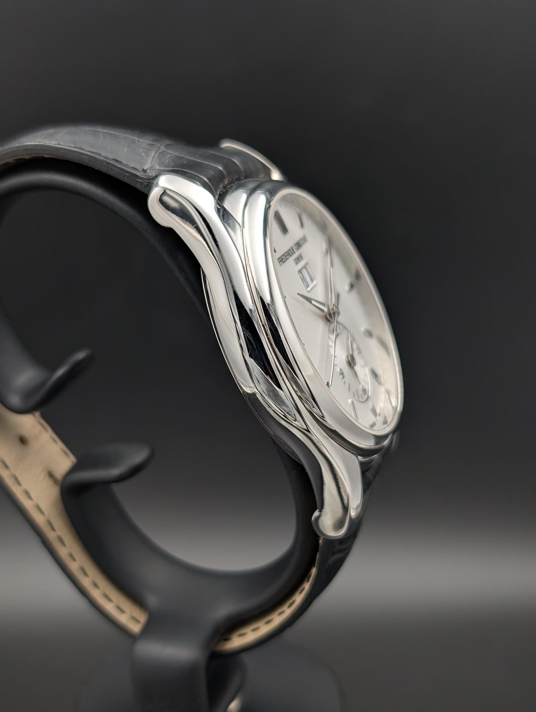 The watch is in excellent condition. The clasp has minor signs of wear. The watch winds, sets, and runs. Comes with inner box, outer box, and booklets. Model: Frederique Constant Index Clear Vision Big Date Dual Time Automatic ref. FC-325X6B4/6 Movement: cal. FC-325 automatic (base ETA cal. 2892A2) Dial: silver Case: 43mm stainless steel Thickness: 11.4mm Strap: original FC leather with FC steel pin buckle **Watch offered at $1,250 OBO shipped. USA shipping only. No trades.**
