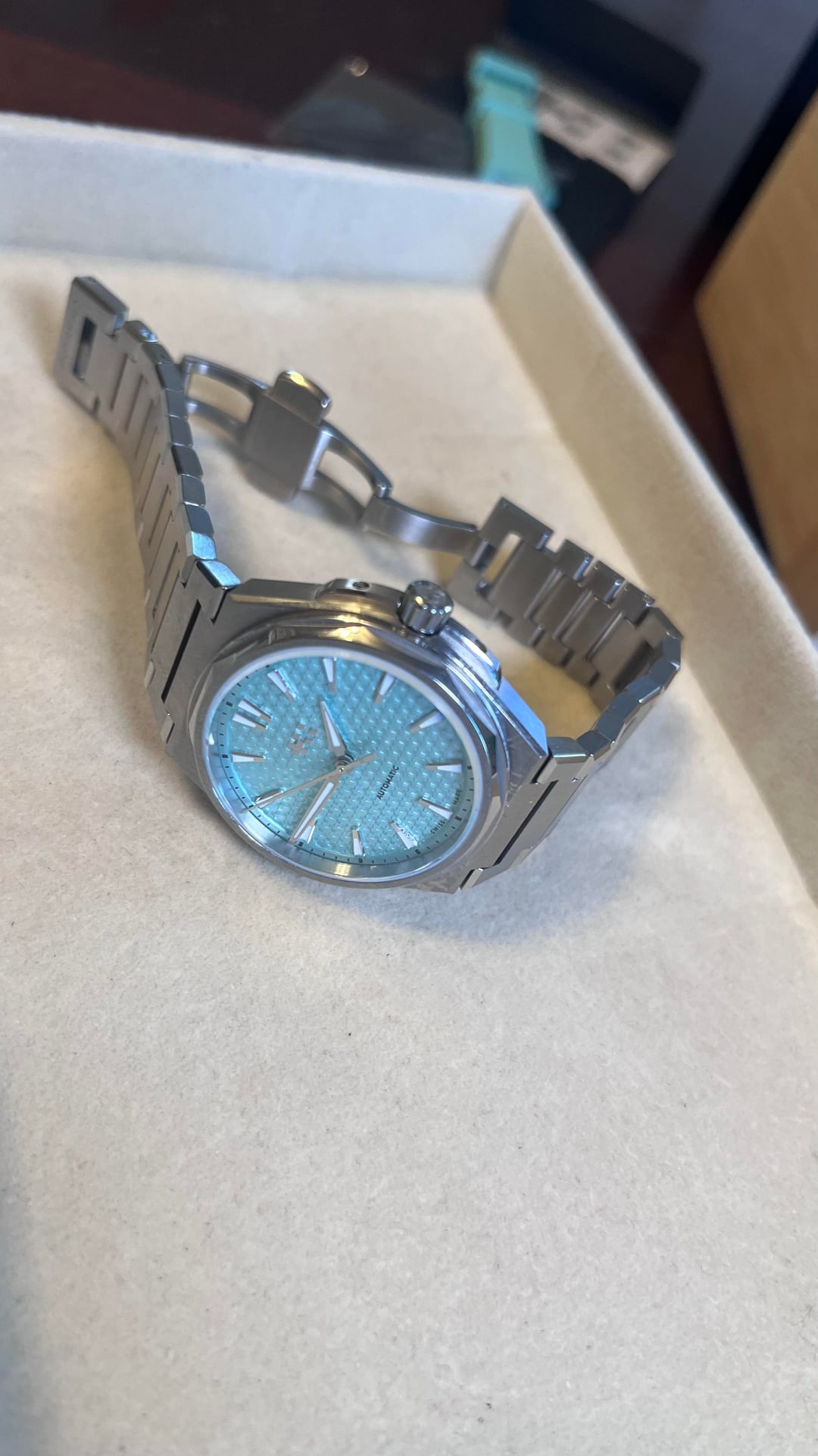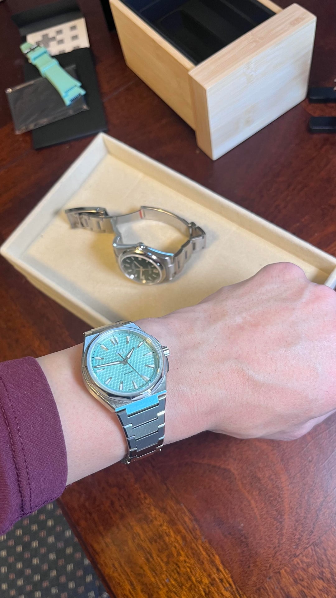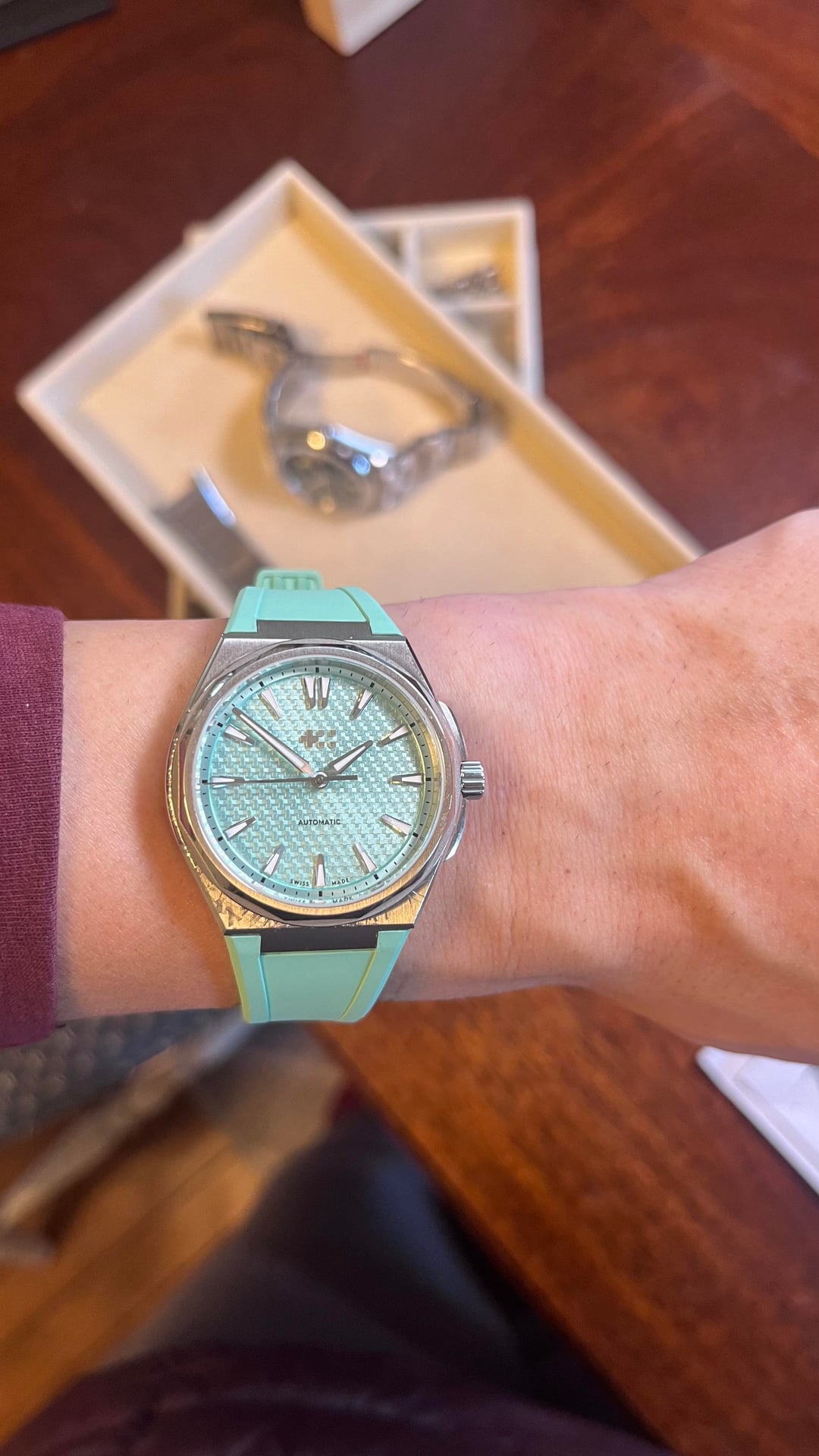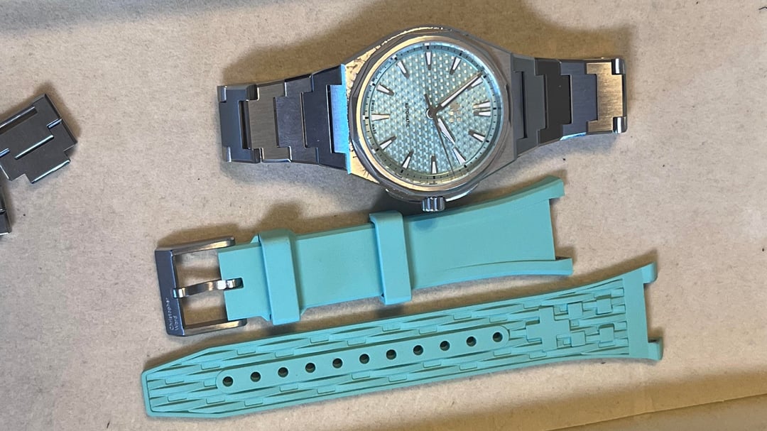Hello community!! Today for sale is this wonderful integrated sports watch known as “The Twelve”, aka the PRX killer. I don’t know much about that, I think the Tissot is a great watch too! This watch comes with the full kit and a rubber strap for summer time. I’ve worn it with both and I must say, the rubber is made very well and is soft and pliable. The case has some love scratches, but that just builds its character! The bracelet is immaculate with no scratches at all. It shimmers in the light as you move your wrist, and the attention to detail on the dial is impressive. There is a lot of texture and the applied indices glimmer along with the bracelet. The bracelet is built very well and feels solid. Some say it’s too sharp, but I disagree! The whole watch has good weight to it, it’s the perfect amount of heft for a 36mm — which happens to be my favorite size for a watch. The Lichen Green is a groovy dial color and is sought after, I think it makes an excellent addition to any collection especially if you want to spice things up and add some flair to your otherwise monochrome and/or bland color scheme. Don’t get me wrong I love a nice black and steel vibe, but it’s nice to add some color and liven things up. Movement is a sellita SW200-1, 4 hertz beat rate keeps excellent time +6 seconds per day. Full power reserve. I don’t use a lick of A.I. it would be extremely unorthodox of me, I like to write and that slop has no place near my keys or blinking cursor. Price is $950 but I’m definitely open to offers! Thanks guys love you all have a great day, and enjoy those ticking milestones. Wear your watches and remember, sentimental value is priceless. Cheers!