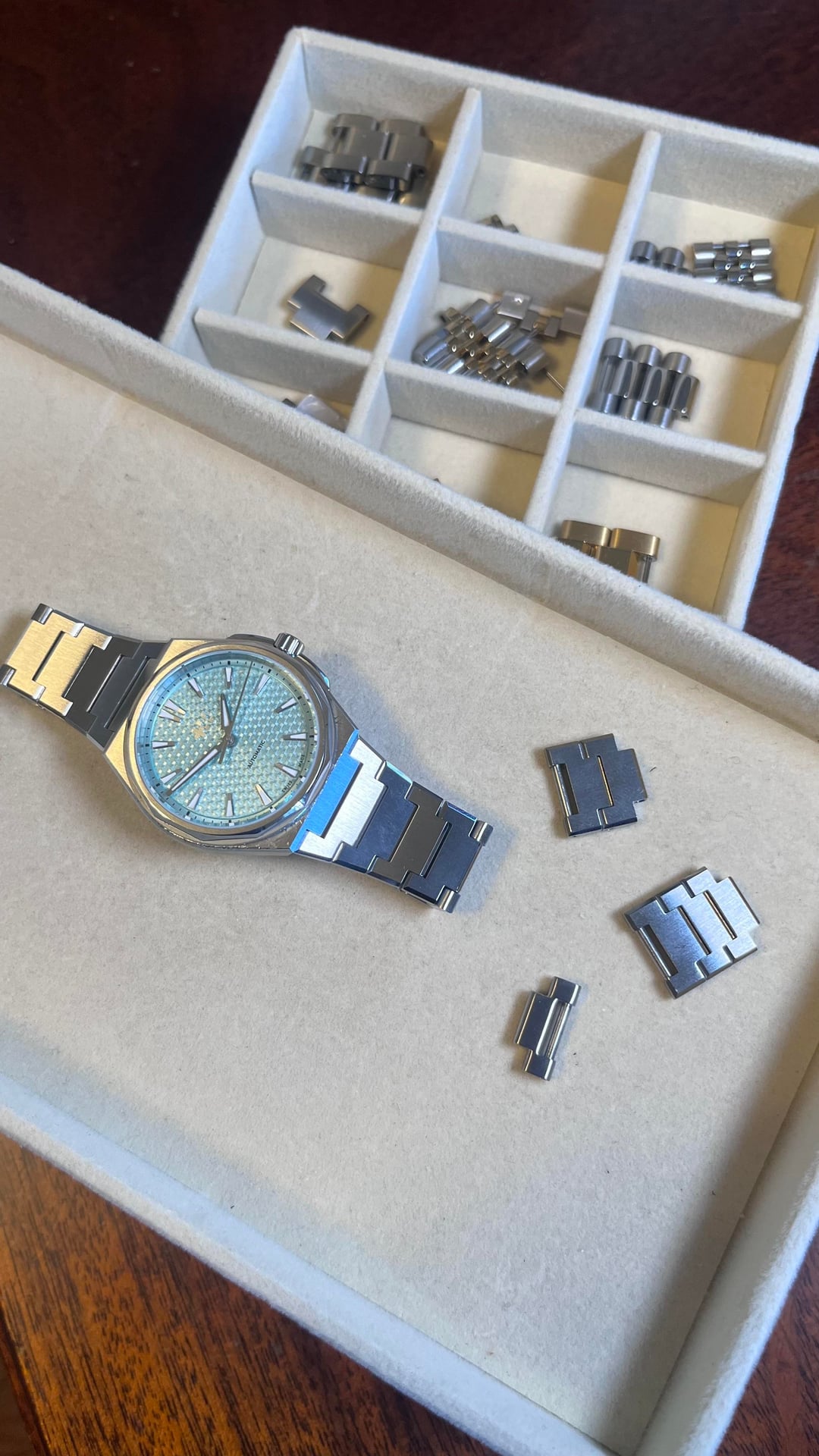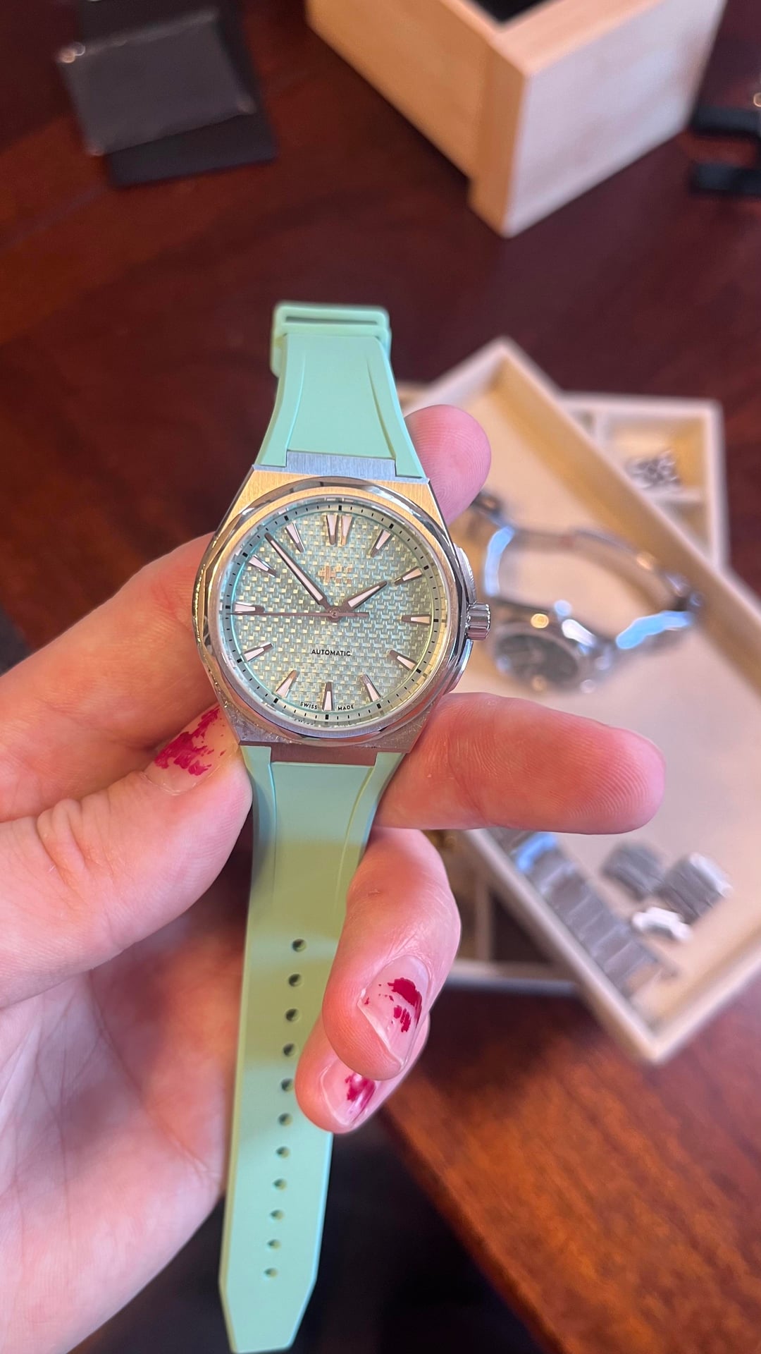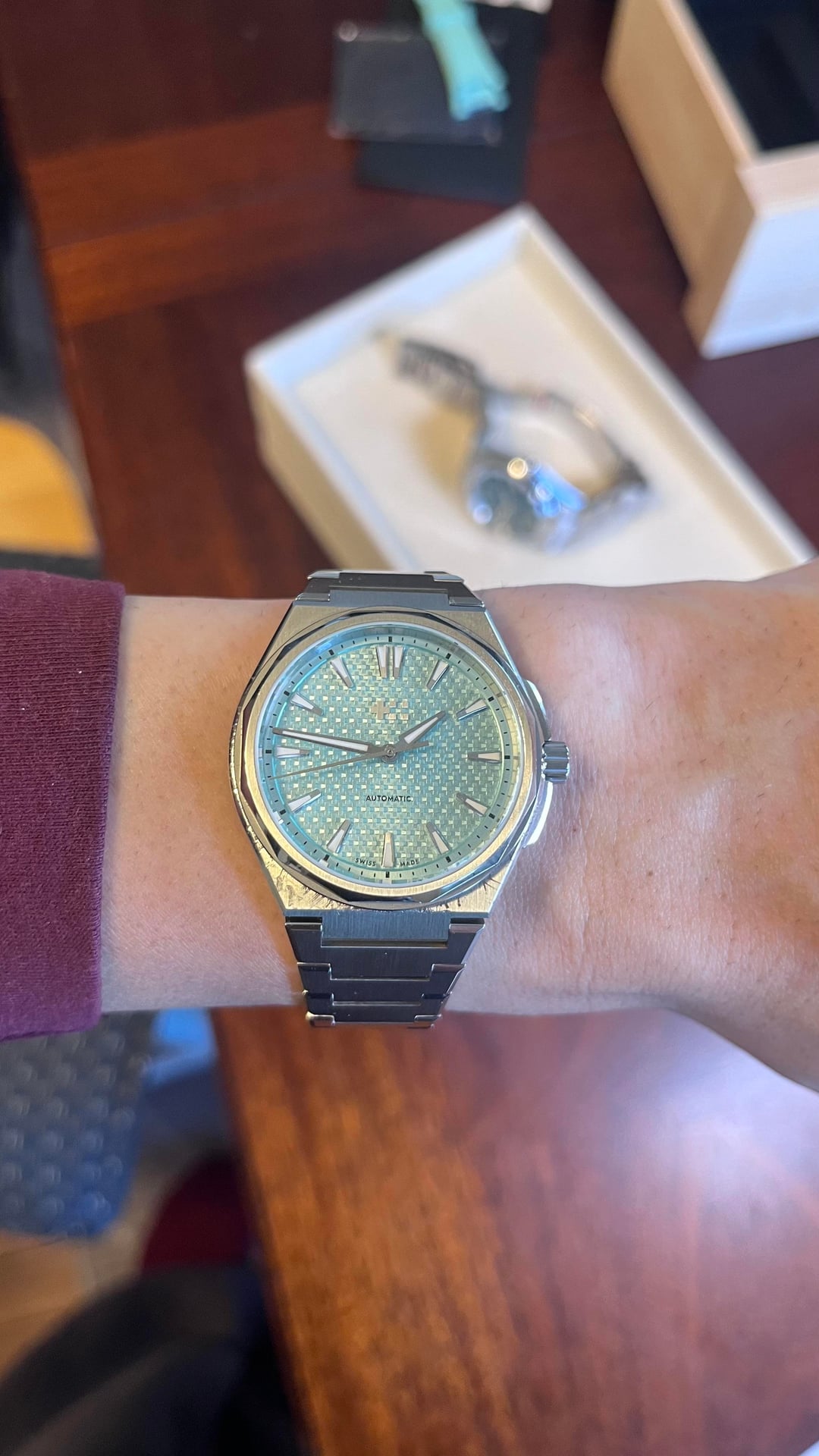 Hello community!! Today for sale is this wonderful integrated sports watch known as “The Twelve”, aka the PRX killer. I don’t know much about that, I think the Tissot is a great watch too! This watch comes with the full kit and a rubber strap for summer time. I’ve worn it with both and I must say, the rubber is made very well and is soft and pliable. The case has some love scratches, but that just builds its character! The bracelet is immaculate with no scratches at all. It shimmers in the light as you move your wrist, and the attention to detail on the dial is impressive. There is a lot of texture and the applied indices glimmer along with the bracelet. The bracelet is built very well and feels solid. Some say it’s too sharp, but I disagree! The whole watch has good weight to it, it’s the perfect amount of heft for a 36mm — which happens to be my favorite size for a watch. The Lichen Green is a groovy dial color and is sought after, I think it makes an excellent addition to any collection especially if you want to spice things up and add some flair to your otherwise monochrome and/or bland color scheme. Don’t get me wrong I love a nice black and steel vibe, but it’s nice to add some color and liven things up. Movement is a sellita SW200-1, 4 hertz beat rate keeps excellent time +6 seconds per day. Full power reserve. I don’t use a lick of A.I. it would be extremely unorthodox of me, I like to write and that slop has no place near my keys or blinking cursor. Price is $950 but I’m definitely open to offers! Thanks guys love you all have a great day, and enjoy those ticking milestones. Wear your watches and remember, sentimental value is priceless. Cheers!