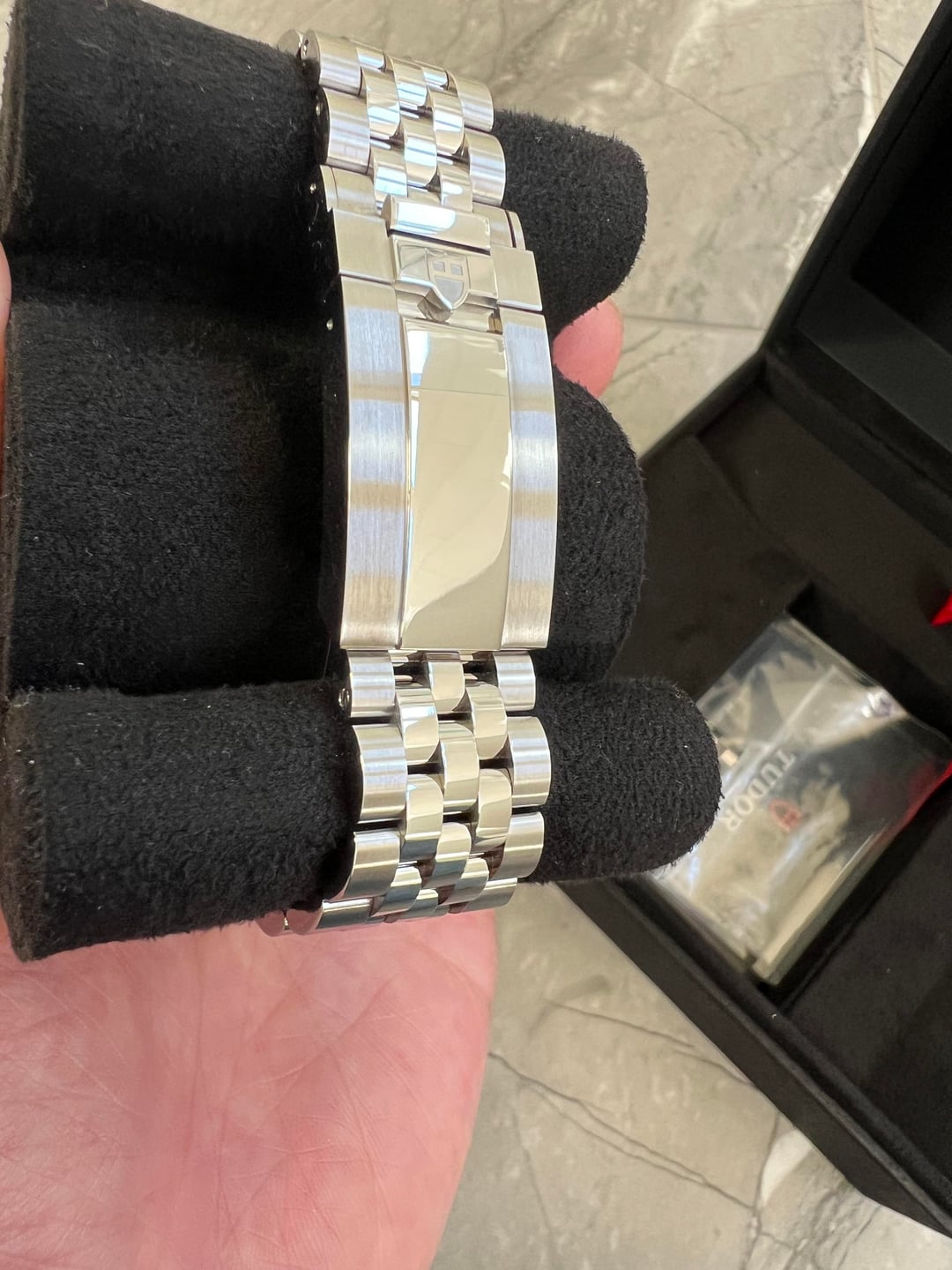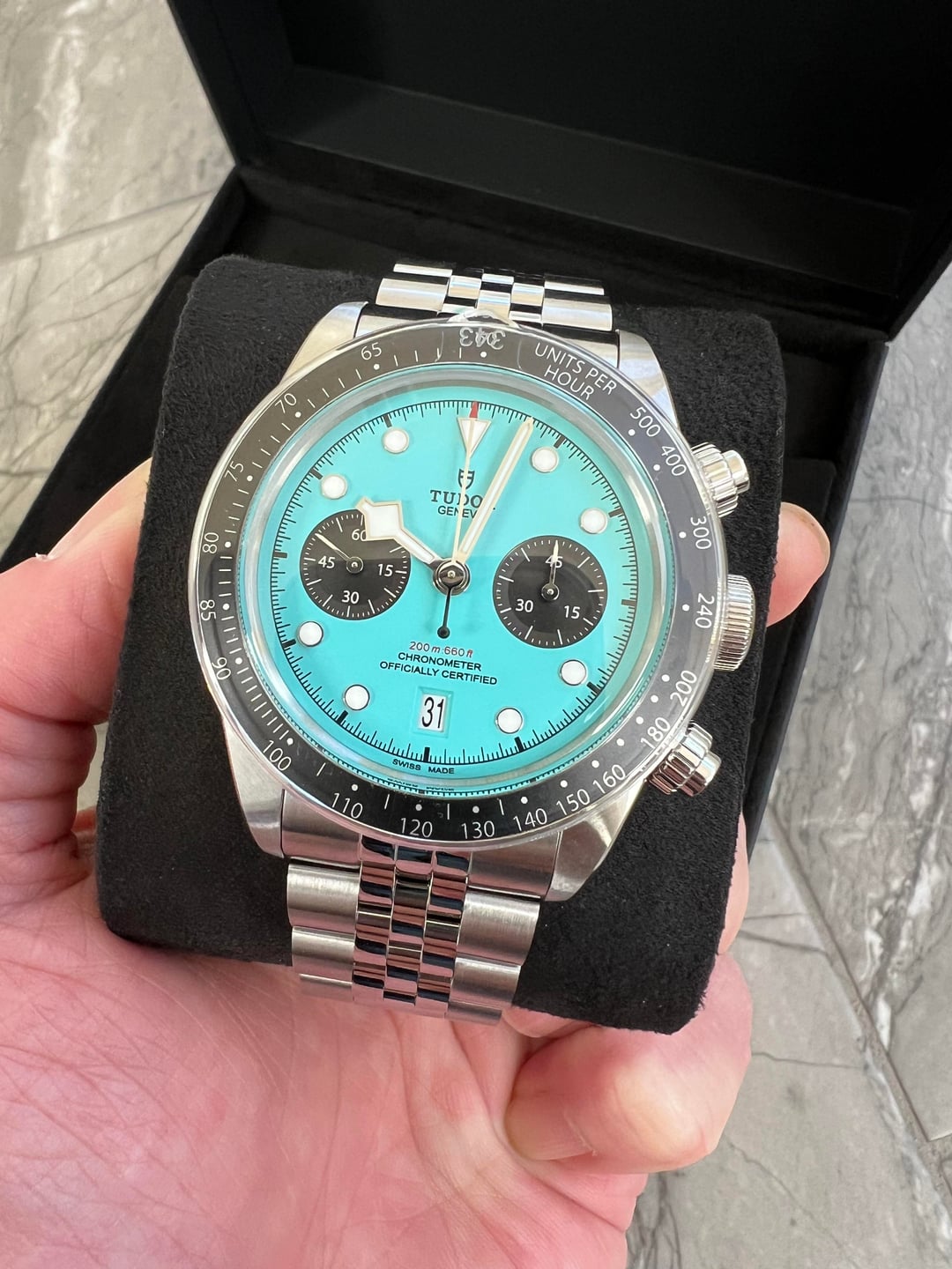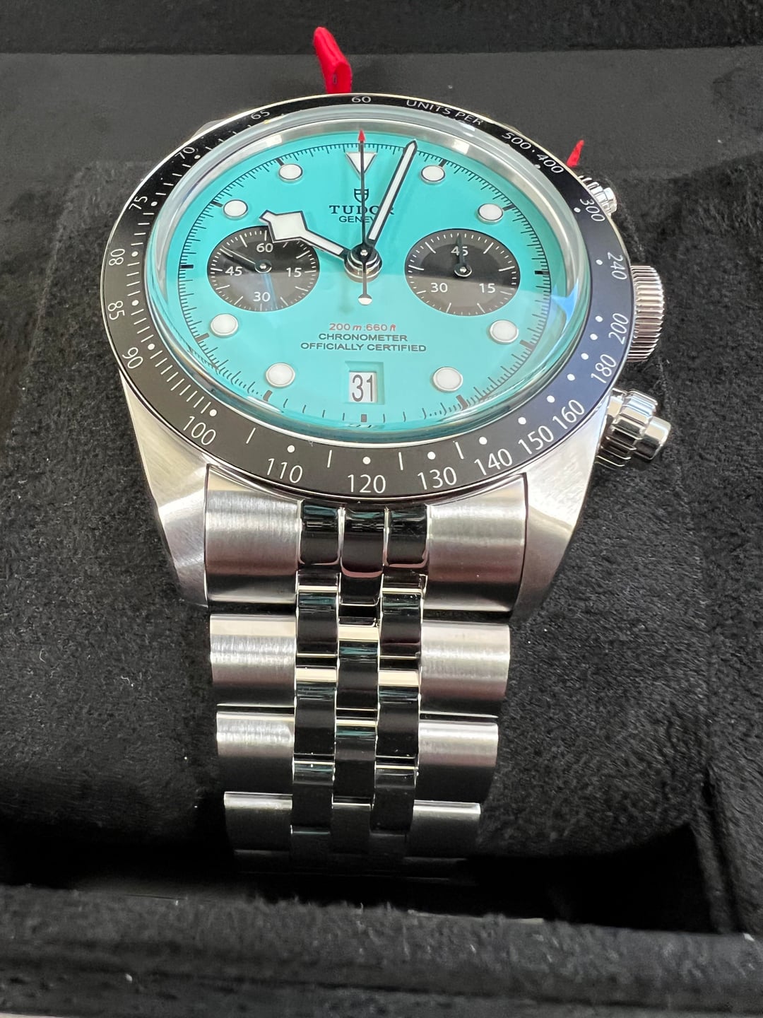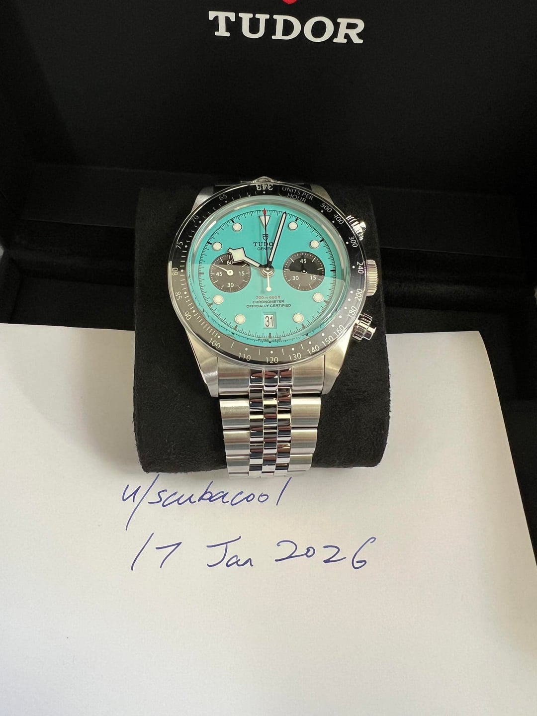 For sale is a brand new Tudor Black Bay Chronograph Flamingo Blue. Model M79360N-0024. It is unworn and was only sized when purchased new from the AD in December 2025. Comes with international guarantee, chronometer certification, tags, user manual, and Tudor box. And for the buyer, I will show you (over video) the AD receipt indicating the same serial number as what’s on the guarantee card. Asking: $9500 (FedEx 2nd Day shipping included only within continental US). One of the lowest priced online. Payment methods accepted: PayPal friends, Bank Wire, Zelle/Venmo (friends) No trades please. Please let me know if you have any questions. Thank you for your interest.