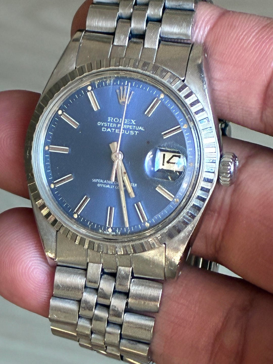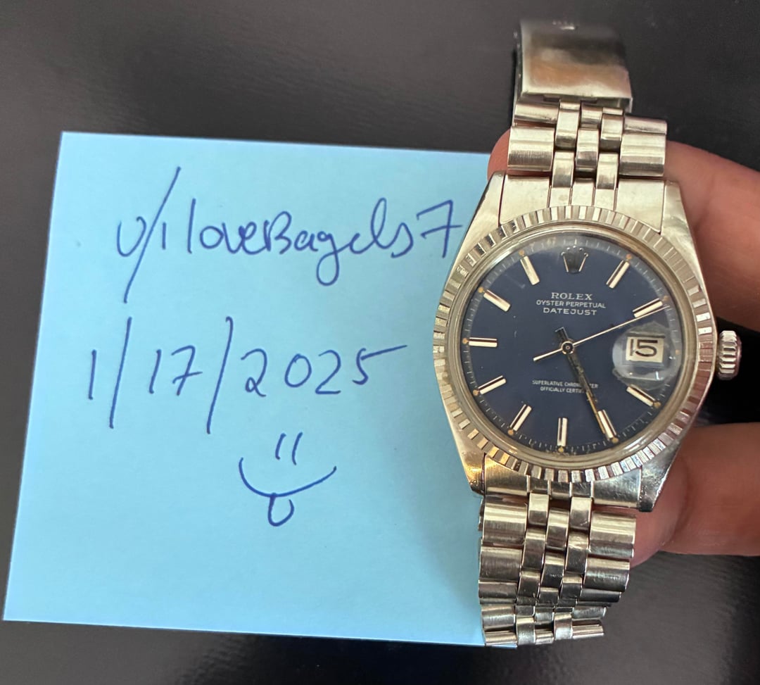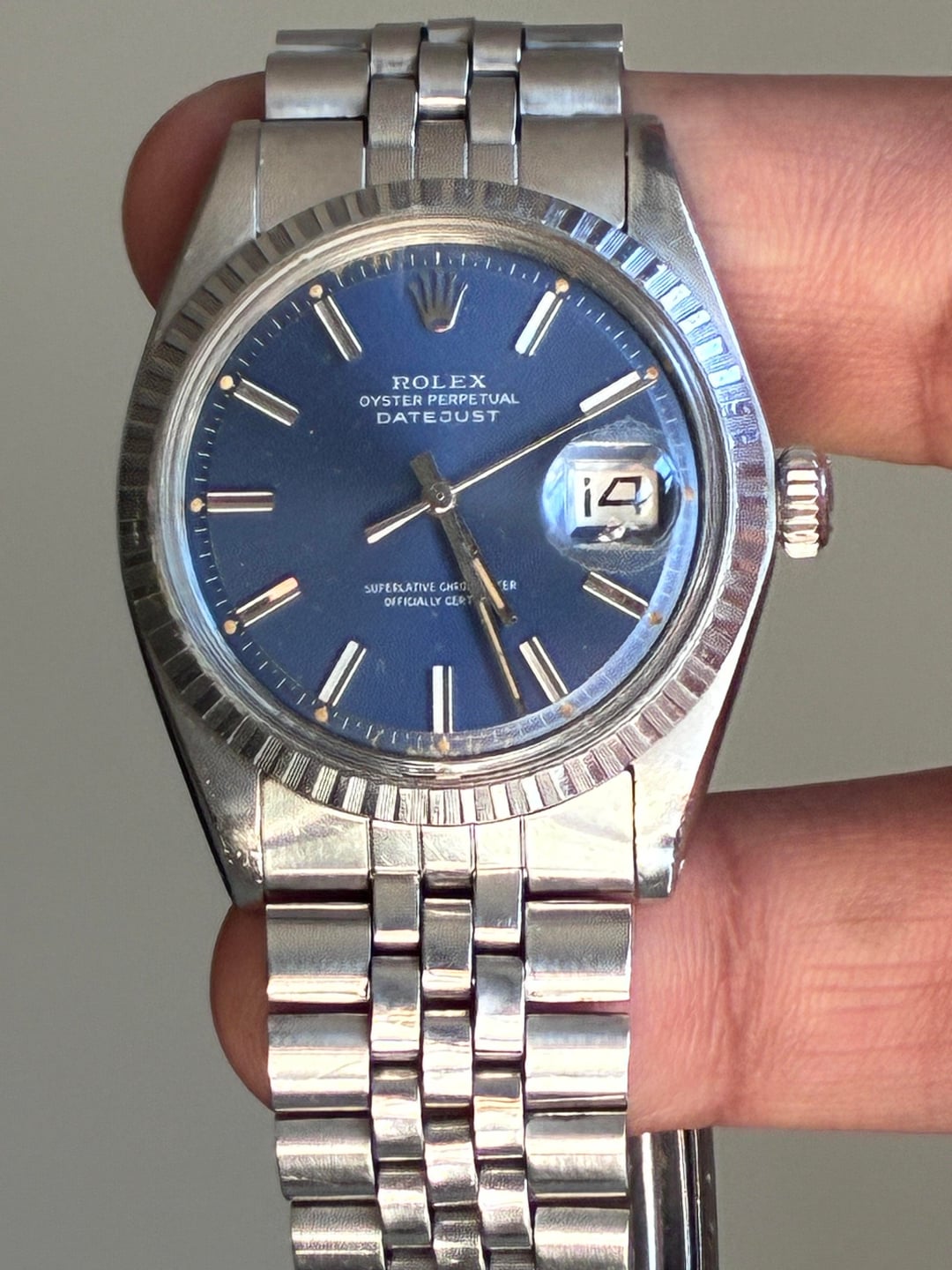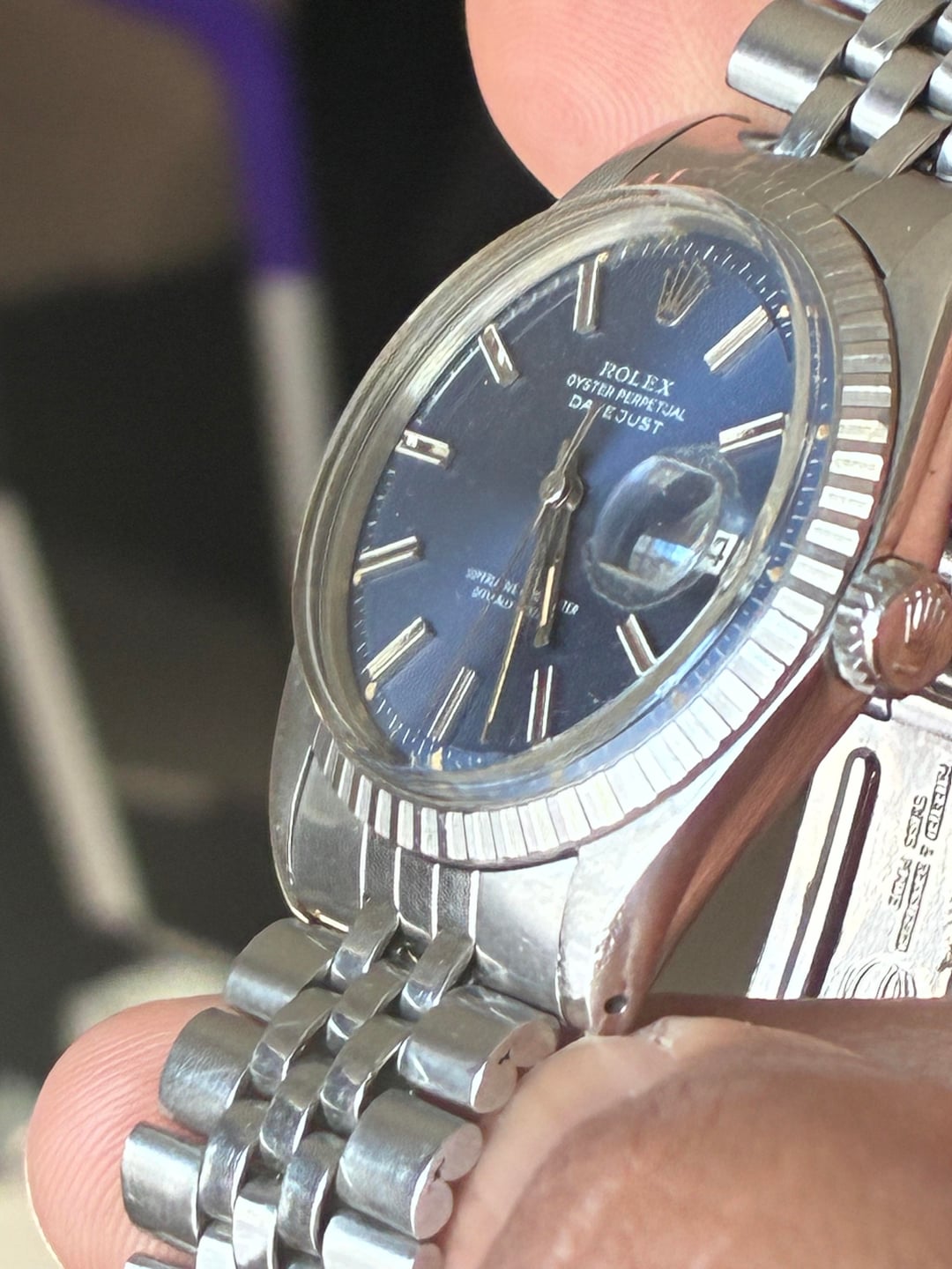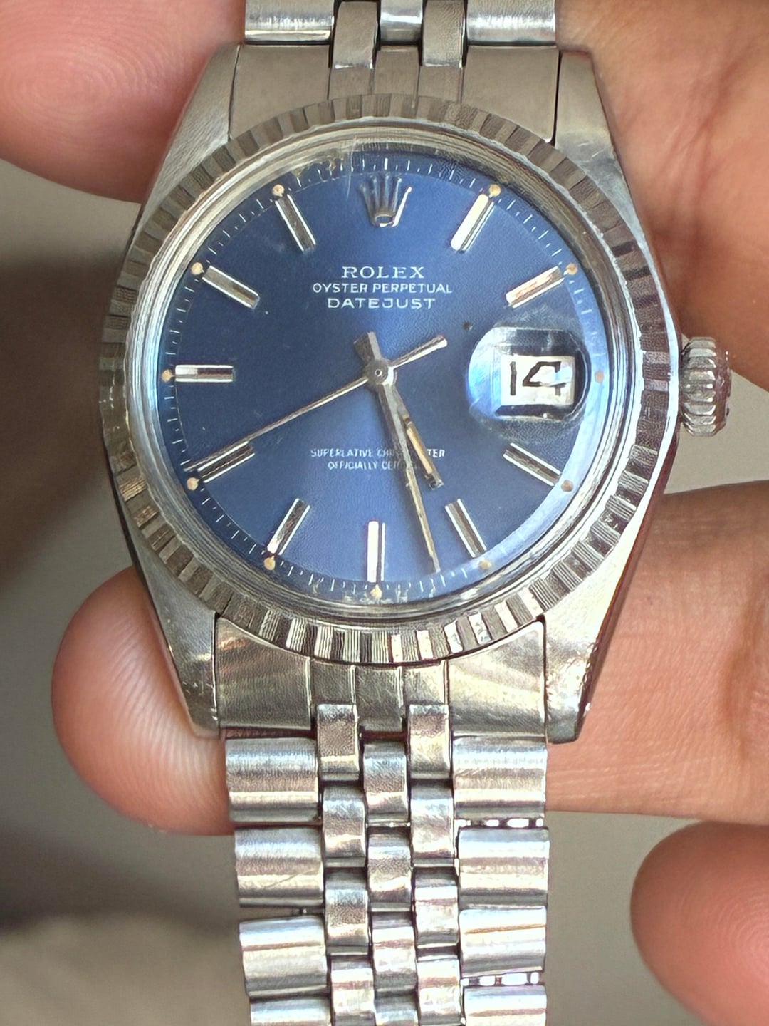 Parting w my Rolex datejust 36mm 1603 blue dial Full jubilee bracelet . Year 1973 rare blue dial w engine turn bezel . Watch only . Asking 4850 ! Ultra rare time piece . Zelle wire Venmo Usa only