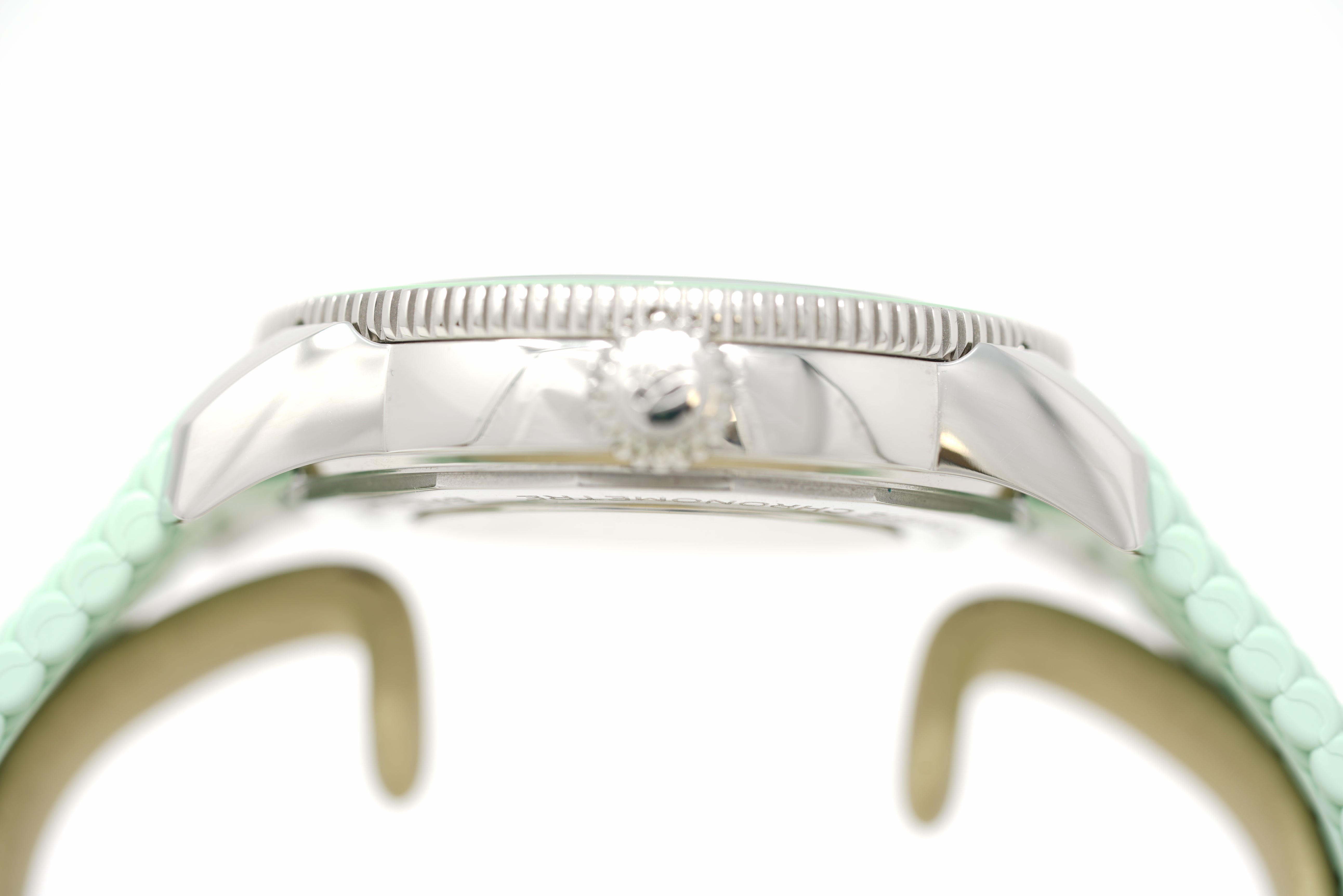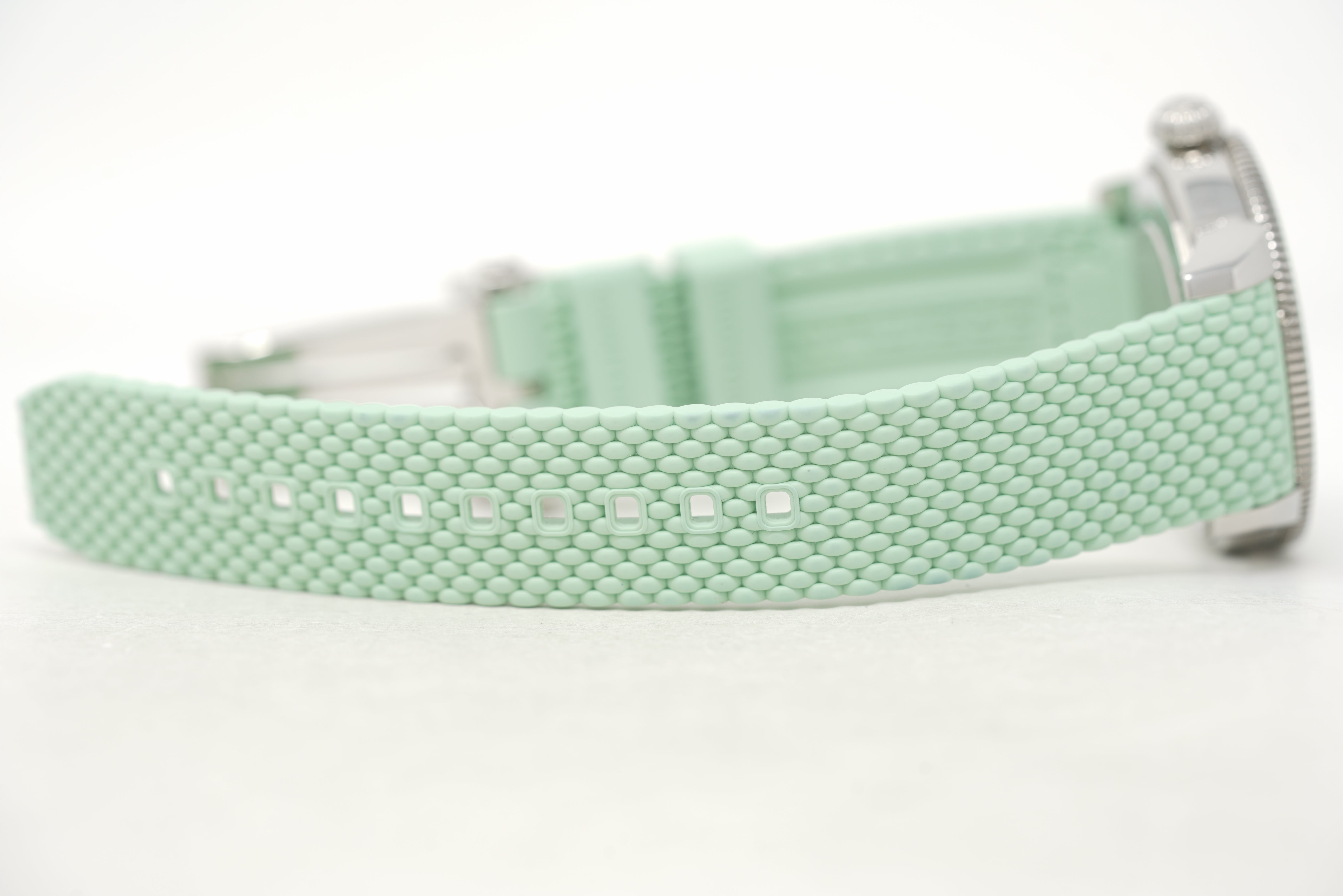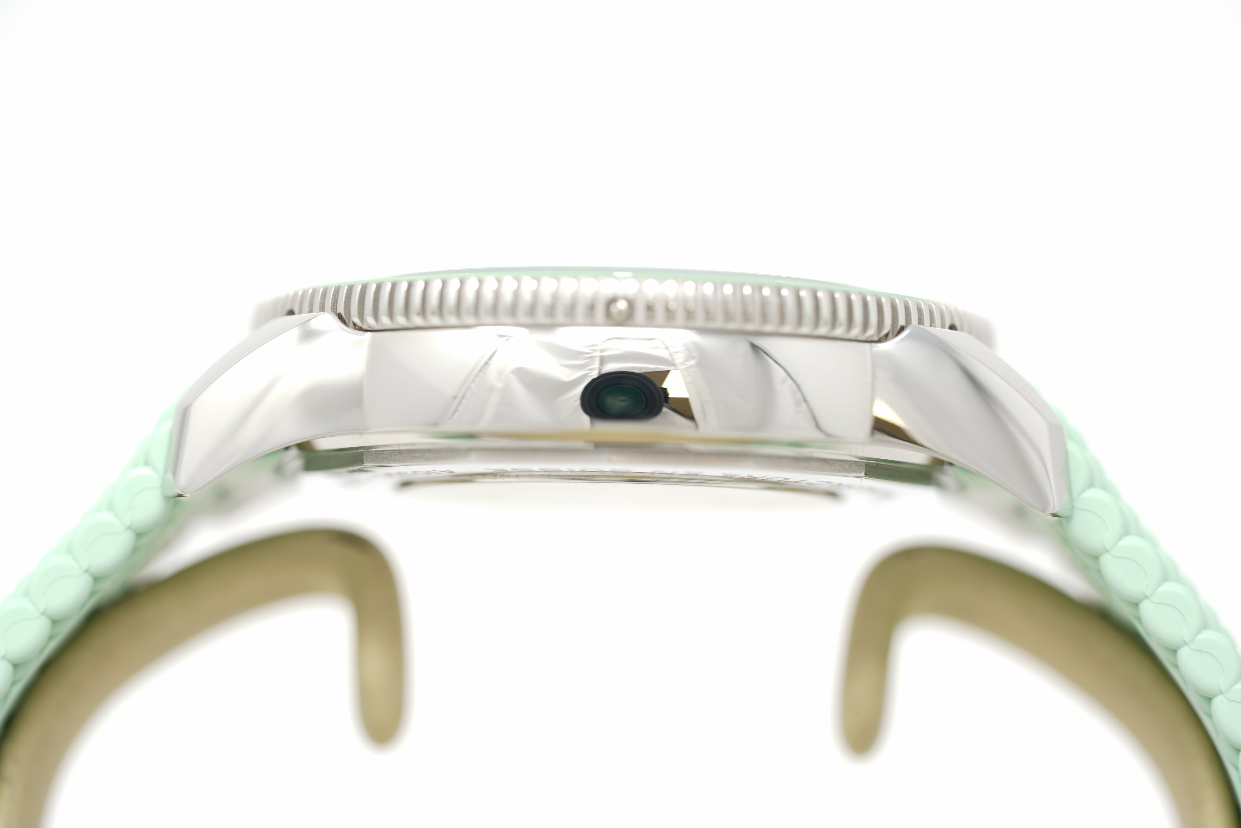 This pre-owned watch is in 90% condition due to slight marks on the sides and back of the case. The strap is in 90% condition due to slight wear and marks on the clasp. The strap will accommodate a wrist size up to 7 and 1/2 inches. Originally purchased in September 2025, this watch comes with its inner box, instruction manual, warranty card, chronometer hangtag, and the one-year Topper Pre-Owned Select warranty.