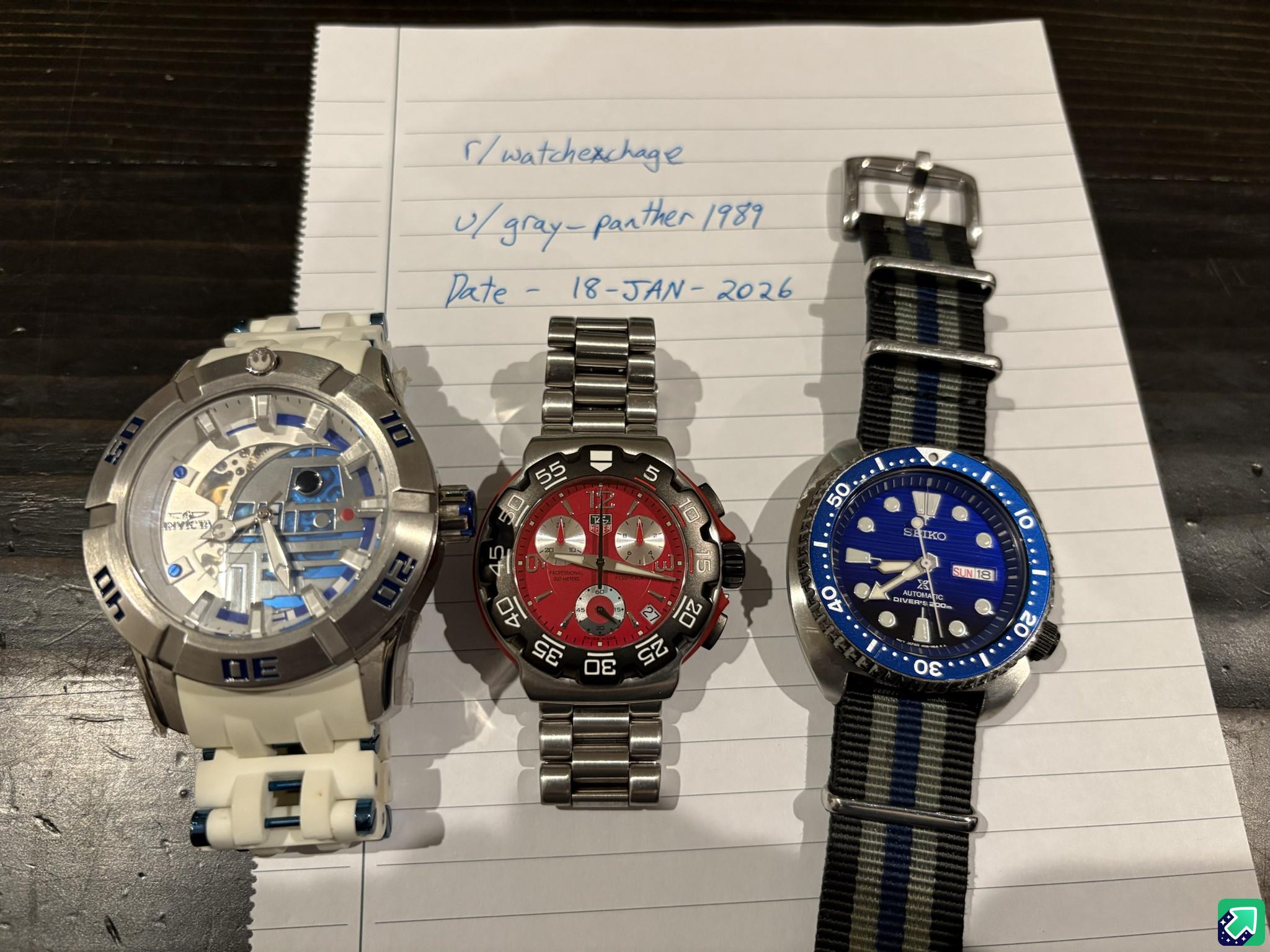Hi r/WatchExchange! Full Album: [https://imgur.com/a/ANMQ6nL](https://imgur.com/a/ANMQ6nL) Tag Heuer CAC1112: Condition : Used In Very Good Condition With Little Wear and Marks, Check the pics watch running and keeping good time Case Size: Watch diameter 41 mm Movement: Quartz Case Material: Stainless Steel Bracelet Size: 7.25" wrist, additional 2 links Price: $875 Shipped CONUS B&P: Box and traveling case only Seiko SRPC91: Condition : Used In Good Condition With Little Wear and Marks, original rubber strap is unused, Check the pics watch running and keeping good time (less than 8s variation on my wrist) Case Size: Watch diameter 44 mm Movement: Automatic 4R-36 Case Material: Stainless Steel Bracelet Size: Unused original rubber strap Price: $275 Shipped CONUS B&P: Full set, box and papers included Invicta 26553 R2-D2: Condition : Used In Excellent Condition, Check the pics watch running and keeping good time Case Size: Watch diameter 50 mm Movement: Automatic G2665Z Case Material: Stainless Steel/Polyurethane Bracelet Size: 7.25" wrist, additional 1 link Price: $200 Shipped CONUS B&P: None, shipped with Omega traveling case Sold 3 pieces on Chrono24 with positive feedback, which were a Tag Heuer CAZ2012.BA0970, Omega Aqua Terra 38.5mm white horizontal teak, and latest was a Grand Seiko SBGH273