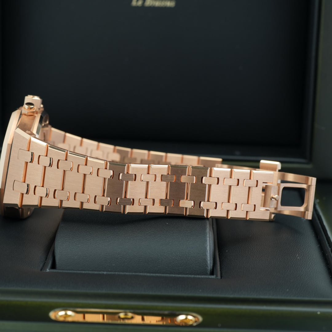 2022 Audemars Piguet Royal Oak Chronograph 26715OR.OO.1356OR.01 Timestamp: [https://imgur.com/a/Ipphnyg](https://imgur.com/a/Ipphnyg) An iconic expression of sport and luxury, the Audemars Piguet Royal Oak Chronograph is crafted in 18k rose gold with the collection’s signature octagonal bezel and integrated bracelet. The 38mm case offers refined proportions, paired with a striking blue “Grande Tapisserie” dial featuring chronograph subdials, applied rose gold markers, and a discreet date display. Powered by an in-house automatic chronograph movement, this Royal Oak delivers exceptional performance while maintaining elegant wearability. A sapphire crystal and 50 meters of water resistance complete a timepiece that seamlessly blends technical excellence with timeless design. A standout Royal Oak for collectors seeking understated prestige and everyday versatility. Comes as a complete set with Inner/Outer box, Booklets, Warranty card. This timepiece is overall in mint condition. Please look at my pictures as I like to fully represent the exact condition of the watch through my photography. **Offered at $96,999 shipped in US or OBO.** Payments accepted: Wire or Direct Bank Transfer (Bank of America). Shipping is always FedEx/UPS overnight, fully insured. I am an avid enthusiast and collector and am not affiliated with any watch brand I post. **Always open to trades or purchases! Looking for Audemars Piguet, Rolex, Patek Philippe, F.P. Journe, Vacheron Constantin, and other luxury brands.** I guarantee every watch I sell to be 100% authentic. Follow me on IG: JJ\_Timepiece\_Co Call or text (941) 800-3931