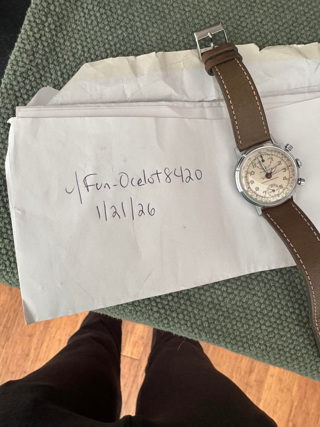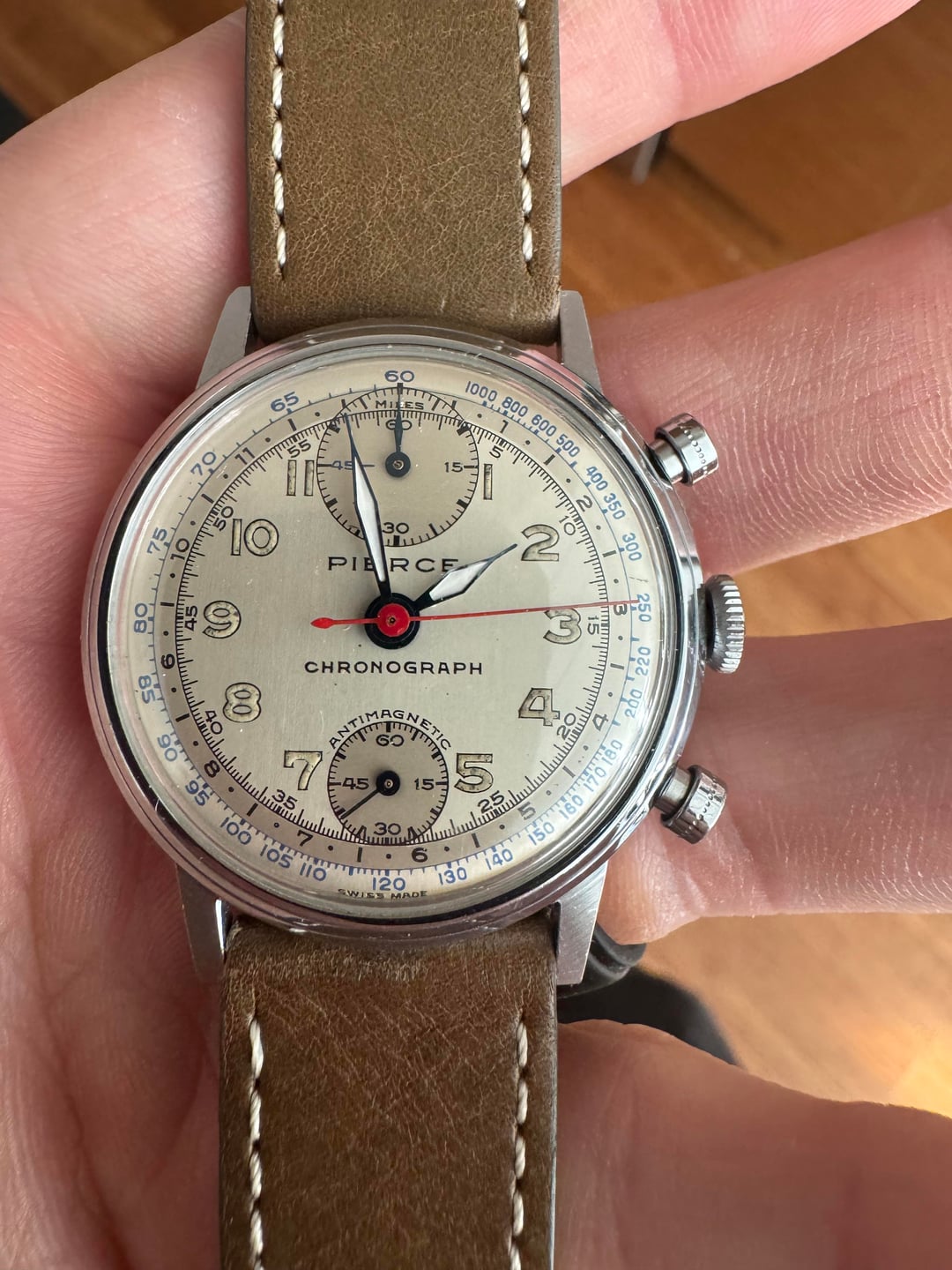 Hi all, I have here a 1940's Pierce upside down chrono with the all in-house cal 134. When I bought this, I wanted a unique vintage chrono that was larger than 36mm (this is about 37) that has some history and doesn't break the bank. Welcome the Pierce Up/down chronograph. This actually has an all in house movement with a vertical clutch, very rare for the time. Supposedly, it isn't easy to service but this one came freshly serviced October of 2025 from the credible eBay seller, I bought it from. This watch was also pretty widely (privately/semiprivately) used for the British Royal AF as well as medical personnel for the British army during that time (WWII & after). The case dial & movement are all original according to the seller. The case is in superb A++ shape for the age, still has original finishing which is hard to find on an old watch. The dial is also superb (I might suspect a re-dial bc of white on hour hand) but according to the seller it's all original... Tells time great for the age but asking only $950 (semi flexible on negotiation) bc the chrono doesn't set to 0... still, you'll be hard pressed to get a vintage chrono, in-house, 37mm with some cool history under $1000 bucks. Cheers, HP