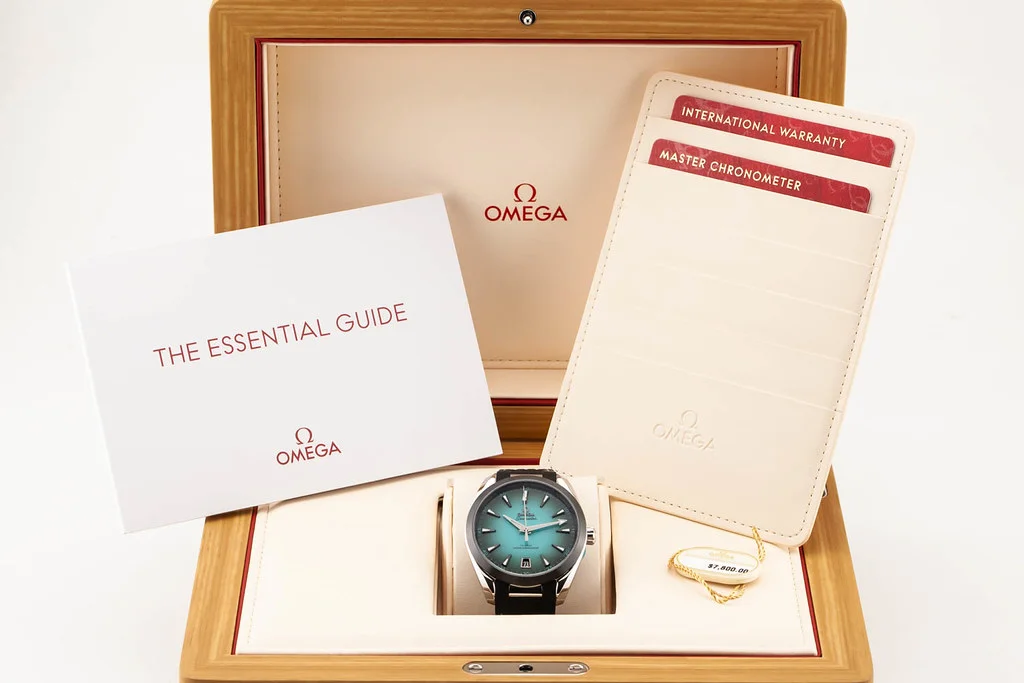 Up for sale is a brand new Omega Aqua Terra 8900 41mm Turquoise Dial with Black Ceramic Bezel on Rubber Strap, reference # 220.32.41.21.03.001. It comes complete with all boxes, papers, booklet, hang tag and Omega Warranty Card dated January 2026.
