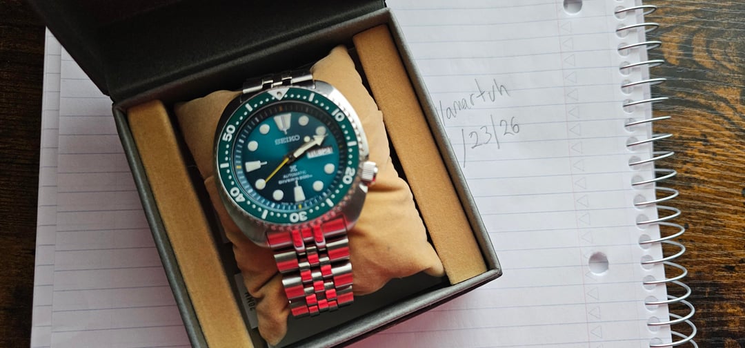 Howdy! Looking to get rid of this Seiko Turtle Japan SBDY039 Wore sparingly and has been sitting for a while. Comes with strapcode Angus Jubilee sized to about a 7" wrist, unfortunately no extra links included so I will add a set of seiko turtle rubber strap . Looking to get 400 OBO shipped for it +3%To cover paypal G&S fees. CONUS only. Trying to sell by this asap, please let me know if you have any additional questions!