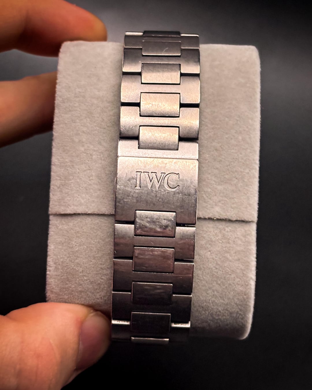Condition: Good overall with honest wear. Titanium case and bracelet show visible surface scuffs and hairlines consistent with normal use and the nature of titanium; no deep gouges. Bezel has light wear but remains fully legible. Sapphire crystal appears clean with no cracks or chips; minor light marks may be present at certain angles. Black dial shows attractive, even patina with aged lume plots and hands; printing remains clear and intact. Chronograph pushers and crown operate as expected; day-date changes correctly. Caseback shows surface wear consistent with use. Includes: Watch only Bracelet Fit: Currently fits approximately a 7.4” wrist. Price: $2,399 shipped. Sales tax may apply to GA/IL buyers ⸻ Shipping — Fully insured FedEx 2-Day within 24 hours of cleared payment. Timestamp — Included in photos. ⸻ Overview — IWC Pilot’s Chronograph in lightweight titanium (Ref. IW370703). Features a matte black dial with tritium patina, triple-register chronograph layout, day-date display, sapphire crystal, screw-down crown, and robust automatic chronograph movement. A classic late-1990s / early-2000s IWC tool watch with genuine aviation character, desirable titanium construction, and honest wear that suits the watch’s utilitarian roots.