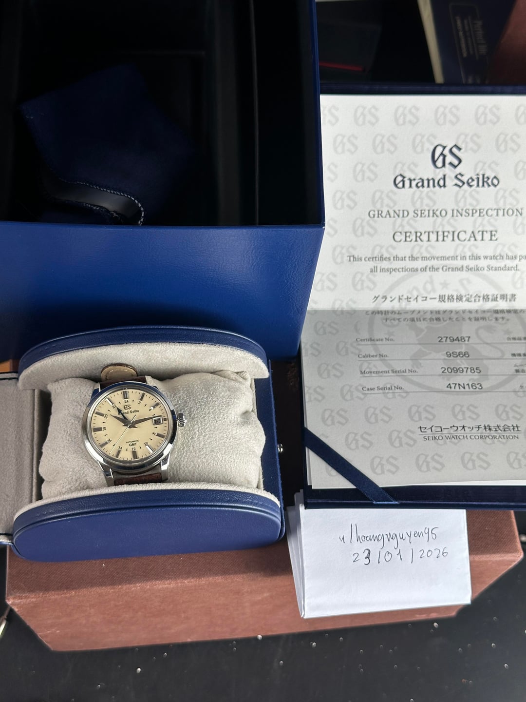 Up for sale is the Grand Seiko Elegance GMT Ref.SBGM221 in excellent condition full set. Images: https://drive.google.com/drive/folders/1CUyx-7ITAK6saaqvaOKjNbS4TkHciB9E Video: https://drive.google.com/file/d/16CrXVJuxhYnPTi7K1JVPm2u2ES72dWl4/view?usp=drivesdk Timestamp: https://drive.google.com/file/d/1OYdPRXDevuLpiAHajHLSwCV2bjcKX7mV/view?usp=drivesdk The Grand Seiko SBGM221 from the Elegance Collection is a beautifully executed automatic GMT that represents the brand’s philosophy of quiet refinement and mechanical excellence. Designed as a classic traveler’s watch, it features a perfectly balanced 39.5mm stainless steel case with softly curved lines, finished with Grand Seiko’s renowned Zaratsu polishing for distortion-free mirror surfaces. The proportions wear effortlessly on the wrist, measuring 13.7mm thick with a 46.9mm lug-to-lug, making it elegant yet substantial. The warm ivory dial is one of the defining characteristics of the SBGM221, offering exceptional legibility and depth. It is accented by razor-sharp applied markers, polished dauphine hands, and a striking heat-blued GMT hand that adds both functionality and contrast. A box-shaped sapphire crystal completes the vintage-inspired aesthetic while maintaining modern durability. Powering the watch is Grand Seiko’s in-house Caliber 9S66, an automatic movement with manual winding and a true GMT function that allows the local hour hand to jump independently—ideal for frequent travelers. The movement delivers an impressive 72-hour power reserve and is regulated to an accuracy of +5 to −3 seconds per day in static conditions. In addition to dual time functionality, the watch displays hours, minutes, seconds, and date. With a splash-resistant 30 meters of water resistance, a 19mm lug width, and a high-quality crocodile leather strap secured by a three-fold clasp, the SBGM221 is designed for refined daily wear rather than excess. Elegant, timeless, and unmistakably Grand Seiko, this reference has become a favorite among collectors seeking a true GMT wrapped in classic dress-watch proportions. This watch is in excellent condition, showing almost no scratches at all from careful wear. Crystal is nice and clean. Watch comes fit on original straps and buckle with tag still hanging. The watch has been serviced by Grand Seiko and has the service paper along with active warranty. It comes with original box, papers, tag. Price: $3800 + $60 flat shipping (via FedEx/UPS express — fully insured with duty imports/tariff covered). Payment via PayPal F&F or G&S (+4.6% fee paid by buyer). No trades please Feel free to message me with any questions or if you're interested. Have a great day! Check out my other watches on Instagram: @jasonswatchcorner