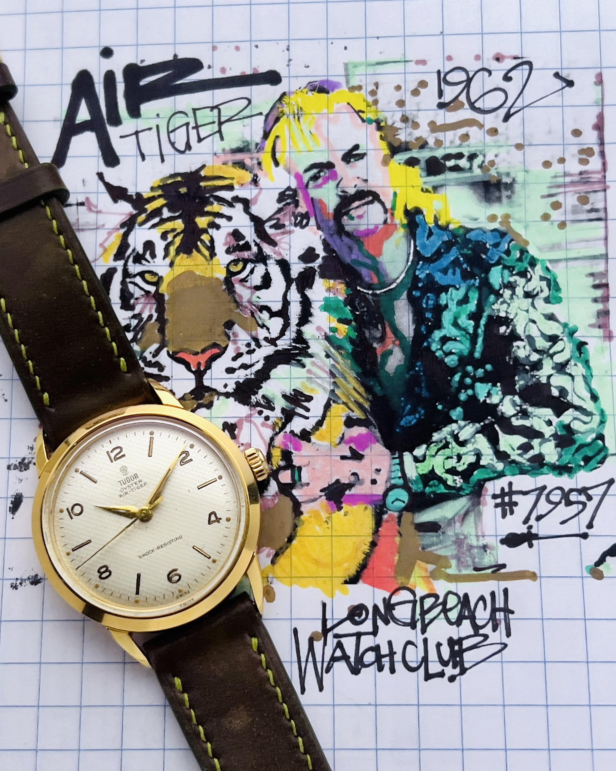 https://www.instagram.com/longbeachwatchclub/ Tudor Oyster Air Tiger ref. 7957 circa 1962 Midcentury Tudor is not only classy and charming but also extremely sought after when Oyster cases are fitted with screw down Rolex crowns and casebacks. This Air Tiger with rose logo and waffle dial are not all exactly common. The eggshell hue paired with the alpha hands and balanced even number Arabics. We date the 374### serial number to circa 1962 but we cannot know for sure. Overall, the gold capped case is in excellent condition and dons drilled lugs. While not service history, the manual wind movement is buttery and looks aces on the timegrapher—your experience may vary. __________________________________________ •. Timestamp pix Videos and timegrapher: https://drive.google.com/drive/folders/1dFKIMYhjEEmzK0MA4v3fBvuhpAveJYyj?usp=share_link •. Specifications: 35mm case X 18 lug width X 41h (lug to lug) X 9.8cc with acrylic crystal •. Box and papers: no • Bracelet: strap only __________________________________ ________________________________________ - video is the best way to view the watch if in-person test drive is not available. Due to the different characteristic of the cameras and gadgets used, the color of the watch you purchase may not be the same as shown on this website or on our Instagram. * will consider trades that make sense but please consider time, shipping, and trade value—not market. * All sales final unless the watch is misrepresented or lost in transit (always fully insured) * Link to [feedback here](https://www.reddit.com/r/WatchExchangeFeedback/search?q=soycowboy&restrict_sr=1&sort=new) & [watchcharts here](https://watchcharts.com/repcheck/user/soycowboy?source=reddit&type=feedback) * Asking a *negotiable* **$2750** via bank wire, Zelle, venmo, or possibly Applepay with super strong references or if I know you. Price includes fully insured Fedex shipping in the USA— hand delivery in most of the Los Angeles or Orange County areas with drinks or coffee on me ;). Cheers, Stephen
